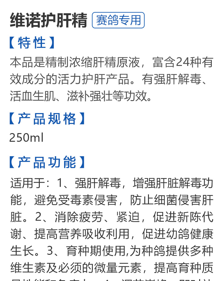 2026线上春展▪满200-10  -  指定商品:【爆灯】蓝精零 5克×10包 ;【爆灯】鸽滴威 5克×10包 ;【爆灯】莎门停 5克×10包 ;【爆灯】崇威灵 5克×10包 体内虫;【爆灯】益南混甘 5克×10包 ;【爆灯】回利球 5克×10包 ;【心连心】滴莎 10克×6袋;【爆灯】乎滴亢 5克×10包 ;【爆灯】超浓缩喜乐菌 500毫升 ;【心连心】球莎 10克×6袋 ;【爆灯】维诺护肝精 250毫升 ;【爆灯】虱螨体虫清 500毫升 ;【心连心】呼畅 10克×6袋 ;【爆灯】球可定 100毫升 ;【爆灯】复合预混合饲料Ⅱ维益菌 227克 ;【心连心】瘟痢停 10克×6袋 ;【爆灯】肠道宝 500克 ;【心连心】莎J净 10克×6袋 ;【心连心】鸽C净 10克×6袋 ;【顶峰】复合菌(胶囊)100粒 ;【顶峰】复合菌(粉剂) 280克 ;【顶峰】能量钙(浓缩型) 400毫升 ;【爱丽丝】喉痢清(加强型) 60粒(胶囊) ;【顶峰】能量钙(浓缩型) 2.5升 ;【爱丽丝】衣元净 60粒(胶囊);【施德福】特号六合一混合剂 5克×10包 ;【爱丽丝】毛滴虫净 60粒(胶囊);【爱丽丝】刹杆净(原沙门氏菌大肠杆菌杀星) 60粒(胶囊);【施德福】口服苗A 5克×10包 ;【爱丽丝】肝精 5克×10袋 ;【施德福】卡尼丁肝肾液 250毫升 ;【施德福】精华液 250毫升 ;【爱丽丝】呼吸道特号 60粒 (胶囊) ;【施德福】口服苗液 25毫升 ;【天津版稳拿】稳拿一号(呼吸道) 2公克×8袋 呼吸道;【天津版稳拿】稳拿二号(消化肠道) 3公克×8袋 肠道;【天津版稳拿】稳拿七号(毛滴虫) 2公克×8袋 毛滴虫;【上海龙园】魔宝 1000克 袋装;【上海龙园】维他肝精 250毫升 ;【上海龙园】鸽绿茶 100克 ;【上海龙园】浴宝 200克 ;【上海龙园】小育雏宝胶囊 100粒 ;【上海龙园】菌乐多 500毫升;【先锋】呼喉霸 5克×10包;【先锋】依原净 5克×10包 ;【西安凯鸽】客线枉 30毫升;【西安凯鸽】至樽独霸 100克;【西安凯鸽】至樽独霸 60粒(胶囊);【爆灯】T5鸽疫快克 20毫升 ;【西安凯鸽】果蔬营养丸 700克;【西安凯鸽】果蔬营养丸 2000克;【天津版稳拿】稳拿三号 2克×8包 球虫;【天津版稳拿】幼鸽夺霸 100粒 ;【天津版稳拿】幼鸽夺霸 300粒 ;【天津版稳拿】比赛夺霸3号 100粒 ;【天津版稳拿】比赛夺霸3号 300粒 ;【心连心】毛莎胶囊 60粒 ;【心连心】球锋胶囊 60粒 ;【天津版稳拿】虫清 3克×8包 体内虫;【心连心】呼畅 60粒(胶囊) ;【天津版稳拿】喉清 3克×8包 支原体/衣原体/念珠菌/呼吸道;【心连心】瘟痢停 60粒(胶囊) ;【天津版稳拿】粮霉清 200克 ;【心连心】莎J净胶囊 60粒 ;【爆灯】一滴灵 10毫升 单眼伤风;【爆灯】呼鼻灵 10毫升 ;【心连心】鸽C净 60粒(胶囊) ;【爆灯】维诺速补 100粒 ;【爆灯】老鸟回春丸 100粒 ;【心连心】毛呼二合一 10克×6袋;【爆灯】老鸟生子丸 100粒;【爆灯】依圆青 5克×10袋 ;【心连心】百消砃 100丸 ;【爆灯】泰力福 5克×10袋 呼吸道;【心连心】百消潵 150克 ;【爆灯】卫康防火墙 500毫升 ;【爆灯】矿力高峰液 250毫升;【心连心】独利双清 250毫升 ;【心连心】二合一啤酒酵母粉 600克 ;【爆灯】钙力奇 250毫升;【心连心】益酶多维电解质 150克 ;【爆灯】本草亢独饮 250毫升 ;【心连心】强化肝精(粉剂) 10克×10袋 ;【先锋】呼爽先锋 5克×10包 ;【心连心】强化肝精浓缩液 120毫升 ;【先锋】呼毛二合一 5克×10包 ;李猛推荐【爆灯】鸽疫康 500毫升 ;【先锋】先锋三合一 5克×10包 球虫/毛滴虫/沙门氏;【心连心】生物多肽矿物磷钙粉 500克 ;【先锋】净滴先锋 5克×10包;【心连心】AM活菌浓缩液 500毫升 ;【先锋】不脱翼 5毫升;李猛推荐【爆灯】维诺保 100毫升 ;【心连心】多效营养精华素 1680克 ;【心连心】AD3磷钙液 250毫升 ;【爆灯】超能素5000 1500克袋装 ;【心连心】瘟痢停丸 60丸 ;【爆灯】复合预混合饲料/6合1能量营养素 250克 ;【心连心】优益活菌液 1000毫升 ;【爱丽丝】喉痢清 5克×10袋 ;【上海龙园】种鸽宝 300粒 ;【上海龙园】种鸽粉 200克 ;【爱丽丝】衣原净2代 5克×10袋 ;【上海龙园】一喷灵 25毫升 ;【爱丽丝】毛滴净 5克×10袋 ;【上海龙园】绿色精 500毫升;【爱丽丝】刹杆净(原沙门氏菌大肠杆菌杀星) 5克×10袋 ;【上海龙园】营养蒜油 200毫升;【爱丽丝】呼吸道特号 5克×10袋 ;【上海龙园】康飞力 200毫升;【顶峰】保比液 100毫升 ;【上海龙园】赛神滴眼液 10毫升 ;【爱丽丝】毛球二合一 5克×10袋 ;【上海龙园】一滴灵 10毫升 单眼伤风;【爱丽丝】毛滴虫球虫二合一 60粒 ;【上海龙园】泻必停 5克×10袋 ;【顶峰】牛至香酚保比液 500毫升 ;【上海龙园】喉必清 5克×10袋;【顶峰】商寒停 100片 伤寒停;【顶峰】能量钙 300克 ;【上海龙园】抗球粉 5克×10包;【爱丽丝】稳肠赢 100克 ;【顶峰】全能电解质 500毫升 ;【上海龙园】抗滴粉 5克×10包 ;【顶峰】维他酵母粉 800克 ;【上海龙园】电解质维生素C粉 (甲7.5克+乙12.5克)×10组盒;【上海龙园】小育雏宝片剂 100片;【上海龙园】大育雏宝胶囊 500粒;【上海龙园】嗉囊清 100毫升;【上海龙园】大育雏宝片剂 500片;【上海龙园】粒粒成 100粒;【上海龙园】克虫宝 80粒;【上海龙园】红茶 100克;【上海龙园】强健宝 750克;【凡赛尔】欧乐强 鸽浴粉 1000克 天然沐浴圣品/消除肌肉疲劳/洗澡/洗浴;【爱丽丝】钙磷营养速补 400片;【北斗】雌宝 100粒;【北斗】雄宝 100粒 ;【北斗】克立停 100粒;【北斗】育雏宝 300粒;【天津版稳拿】稳拿五号 3克×8包 单眼伤风;【爆灯】多关秘密武器 30毫升 ;【爆灯】维诺