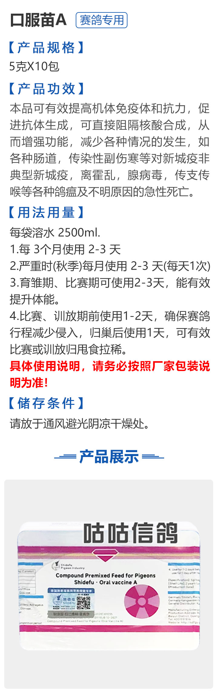 2026线上春展▪满600-40  -  指定商品:【爆灯】蓝精零 5克×10包 ;【爆灯】鸽滴威 5克×10包 ;【爆灯】莎门停 5克×10包 ;【爆灯】崇威灵 5克×10包 体内虫;【爆灯】益南混甘 5克×10包 ;【爆灯】回利球 5克×10包 ;【心连心】滴莎 10克×6袋;【爆灯】乎滴亢 5克×10包 ;【爆灯】超浓缩喜乐菌 500毫升 ;【心连心】球莎 10克×6袋 ;【爆灯】维诺护肝精 250毫升 ;【爆灯】虱螨体虫清 500毫升 ;【心连心】呼畅 10克×6袋 ;【爆灯】球可定 100毫升 ;【爆灯】复合预混合饲料Ⅱ维益菌 227克 ;【心连心】瘟痢停 10克×6袋 ;【爆灯】肠道宝 500克 ;【心连心】莎J净 10克×6袋 ;【心连心】鸽C净 10克×6袋 ;【顶峰】复合菌(胶囊)100粒 ;【顶峰】复合菌(粉剂) 280克 ;【顶峰】能量钙(浓缩型) 400毫升 ;【爱丽丝】喉痢清(加强型) 60粒(胶囊) ;【顶峰】能量钙(浓缩型) 2.5升 ;【爱丽丝】衣元净 60粒(胶囊);【施德福】特号六合一混合剂 5克×10包 ;【爱丽丝】毛滴虫净 60粒(胶囊);【爱丽丝】刹杆净(原沙门氏菌大肠杆菌杀星) 60粒(胶囊);【施德福】口服苗A 5克×10包 ;【爱丽丝】肝精 5克×10袋 ;【施德福】卡尼丁肝肾液 250毫升 ;【施德福】精华液 250毫升 ;【爱丽丝】呼吸道特号 60粒 (胶囊) ;【施德福】口服苗液 25毫升 ;【天津版稳拿】稳拿一号(呼吸道) 2公克×8袋 呼吸道;【天津版稳拿】稳拿二号(消化肠道) 3公克×8袋 肠道;【天津版稳拿】稳拿七号(毛滴虫) 2公克×8袋 毛滴虫;【上海龙园】魔宝 1000克 袋装;【上海龙园】维他肝精 250毫升 ;【上海龙园】鸽绿茶 100克 ;【上海龙园】浴宝 200克 ;【上海龙园】小育雏宝胶囊 100粒 ;【上海龙园】菌乐多 500毫升;【先锋】呼喉霸 5克×10包;【先锋】依原净 5克×10包 ;【西安凯鸽】客线枉 30毫升;【西安凯鸽】至樽独霸 100克;【西安凯鸽】至樽独霸 60粒(胶囊);【爆灯】T5鸽疫快克 20毫升 ;【西安凯鸽】果蔬营养丸 700克;【西安凯鸽】果蔬营养丸 2000克;【天津版稳拿】稳拿三号 2克×8包 球虫;【天津版稳拿】幼鸽夺霸 100粒 ;【天津版稳拿】幼鸽夺霸 300粒 ;【天津版稳拿】比赛夺霸3号 100粒 ;【天津版稳拿】比赛夺霸3号 300粒 ;【心连心】毛莎胶囊 60粒 ;【心连心】球锋胶囊 60粒 ;【天津版稳拿】虫清 3克×8包 体内虫;【心连心】呼畅 60粒(胶囊) ;【天津版稳拿】喉清 3克×8包 支原体/衣原体/念珠菌/呼吸道;【心连心】瘟痢停 60粒(胶囊) ;【天津版稳拿】粮霉清 200克 ;【心连心】莎J净胶囊 60粒 ;【爆灯】一滴灵 10毫升 单眼伤风;【爆灯】呼鼻灵 10毫升 ;【心连心】鸽C净 60粒(胶囊) ;【爆灯】维诺速补 100粒 ;【爆灯】老鸟回春丸 100粒 ;【心连心】毛呼二合一 10克×6袋;【爆灯】老鸟生子丸 100粒;【爆灯】依圆青 5克×10袋 ;【心连心】百消砃 100丸 ;【爆灯】泰力福 5克×10袋 呼吸道;【心连心】百消潵 150克 ;【爆灯】卫康防火墙 500毫升 ;【爆灯】矿力高峰液 250毫升;【心连心】独利双清 250毫升 ;【心连心】二合一啤酒酵母粉 600克 ;【爆灯】钙力奇 250毫升;【心连心】益酶多维电解质 150克 ;【爆灯】本草亢独饮 250毫升 ;【心连心】强化肝精(粉剂) 10克×10袋 ;【先锋】呼爽先锋 5克×10包 ;【心连心】强化肝精浓缩液 120毫升 ;【先锋】呼毛二合一 5克×10包 ;李猛推荐【爆灯】鸽疫康 500毫升 ;【先锋】先锋三合一 5克×10包 球虫/毛滴虫/沙门氏;【心连心】生物多肽矿物磷钙粉 500克 ;【先锋】净滴先锋 5克×10包;【心连心】AM活菌浓缩液 500毫升 ;【先锋】不脱翼 5毫升;李猛推荐【爆灯】维诺保 100毫升 ;【心连心】多效营养精华素 1680克 ;【心连心】AD3磷钙液 250毫升 ;【爆灯】超能素5000 1500克袋装 ;【心连心】瘟痢停丸 60丸 ;【爆灯】复合预混合饲料/6合1能量营养素 250克 ;【心连心】优益活菌液 1000毫升 ;【爱丽丝】喉痢清 5克×10袋 ;【上海龙园】种鸽宝 300粒 ;【上海龙园】种鸽粉 200克 ;【爱丽丝】衣原净2代 5克×10袋 ;【上海龙园】一喷灵 25毫升 ;【爱丽丝】毛滴净 5克×10袋 ;【上海龙园】绿色精 500毫升;【爱丽丝】刹杆净(原沙门氏菌大肠杆菌杀星) 5克×10袋 ;【上海龙园】营养蒜油 200毫升;【爱丽丝】呼吸道特号 5克×10袋 ;【上海龙园】康飞力 200毫升;【顶峰】保比液 100毫升 ;【上海龙园】赛神滴眼液 10毫升 ;【爱丽丝】毛球二合一 5克×10袋 ;【上海龙园】一滴灵 10毫升 单眼伤风;【爱丽丝】毛滴虫球虫二合一 60粒 ;【上海龙园】泻必停 5克×10袋 ;【顶峰】牛至香酚保比液 500毫升 ;【上海龙园】喉必清 5克×10袋;【顶峰】商寒停 100片 伤寒停;【顶峰】能量钙 300克 ;【上海龙园】抗球粉 5克×10包;【爱丽丝】稳肠赢 100克 ;【顶峰】全能电解质 500毫升 ;【上海龙园】抗滴粉 5克×10包 ;【顶峰】维他酵母粉 800克 ;【上海龙园】电解质维生素C粉 (甲7.5克+乙12.5克)×10组盒;【上海龙园】小育雏宝片剂 100片;【上海龙园】大育雏宝胶囊 500粒;【上海龙园】嗉囊清 100毫升;【上海龙园】大育雏宝片剂 500片;【上海龙园】粒粒成 100粒;【上海龙园】克虫宝 80粒;【上海龙园】红茶 100克;【上海龙园】强健宝 750克;【凡赛尔】欧乐强 鸽浴粉 1000克 天然沐浴圣品/消除肌肉疲劳/洗澡/洗浴;【爱丽丝】钙磷营养速补 400片;【北斗】雌宝 100粒;【北斗】雄宝 100粒 ;【北斗】克立停 100粒;【北斗】育雏宝 300粒;【天津版稳拿】稳拿五号 3克×8包 单眼伤风;【爆灯】多关秘密武器 30毫升 ;【爆灯】维诺