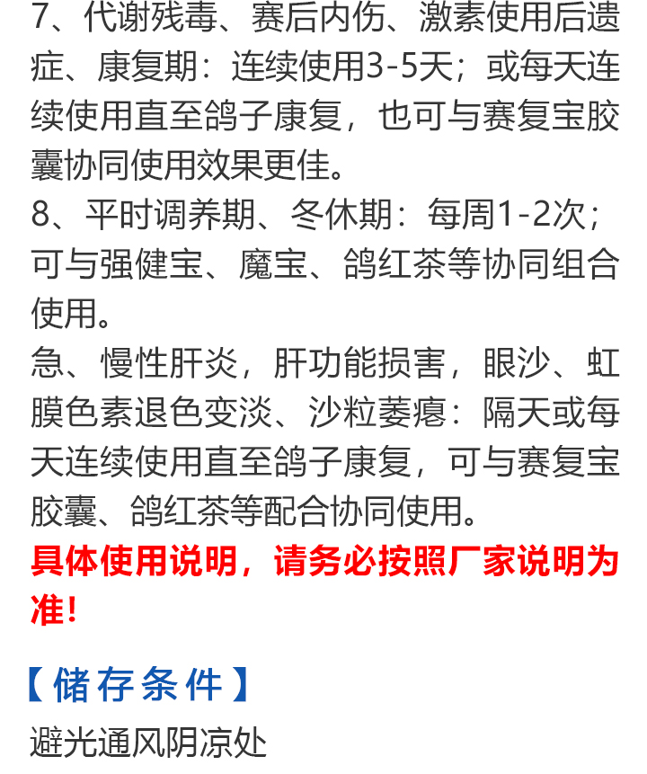 2026线上春展▪满800-60  -  指定商品:【爆灯】蓝精零 5克×10包 ;【爆灯】鸽滴威 5克×10包 ;【爆灯】莎门停 5克×10包 ;【爆灯】崇威灵 5克×10包 体内虫;【爆灯】益南混甘 5克×10包 ;【爆灯】回利球 5克×10包 ;【心连心】滴莎 10克×6袋;【爆灯】乎滴亢 5克×10包 ;【爆灯】超浓缩喜乐菌 500毫升 ;【心连心】球莎 10克×6袋 ;【爆灯】维诺护肝精 250毫升 ;【爆灯】虱螨体虫清 500毫升 ;【心连心】呼畅 10克×6袋 ;【爆灯】球可定 100毫升 ;【爆灯】复合预混合饲料Ⅱ维益菌 227克 ;【心连心】瘟痢停 10克×6袋 ;【爆灯】肠道宝 500克 ;【心连心】莎J净 10克×6袋 ;【心连心】鸽C净 10克×6袋 ;【顶峰】复合菌(胶囊)100粒 ;【顶峰】复合菌(粉剂) 280克 ;【顶峰】能量钙(浓缩型) 400毫升 ;【爱丽丝】喉痢清(加强型) 60粒(胶囊) ;【顶峰】能量钙(浓缩型) 2.5升 ;【爱丽丝】衣元净 60粒(胶囊);【施德福】特号六合一混合剂 5克×10包 ;【爱丽丝】毛滴虫净 60粒(胶囊);【爱丽丝】刹杆净(原沙门氏菌大肠杆菌杀星) 60粒(胶囊);【施德福】口服苗A 5克×10包 ;【爱丽丝】肝精 5克×10袋 ;【施德福】卡尼丁肝肾液 250毫升 ;【施德福】精华液 250毫升 ;【爱丽丝】呼吸道特号 60粒 (胶囊) ;【施德福】口服苗液 25毫升 ;【天津版稳拿】稳拿一号(呼吸道) 2公克×8袋 呼吸道;【天津版稳拿】稳拿二号(消化肠道) 3公克×8袋 肠道;【天津版稳拿】稳拿七号(毛滴虫) 2公克×8袋 毛滴虫;【上海龙园】魔宝 1000克 袋装;【上海龙园】维他肝精 250毫升 ;【上海龙园】鸽绿茶 100克 ;【上海龙园】浴宝 200克 ;【上海龙园】小育雏宝胶囊 100粒 ;【上海龙园】菌乐多 500毫升;【先锋】呼喉霸 5克×10包;【先锋】依原净 5克×10包 ;【西安凯鸽】客线枉 30毫升;【西安凯鸽】至樽独霸 100克;【西安凯鸽】至樽独霸 60粒(胶囊);【爆灯】T5鸽疫快克 20毫升 ;【西安凯鸽】果蔬营养丸 700克;【西安凯鸽】果蔬营养丸 2000克;【天津版稳拿】稳拿三号 2克×8包 球虫;【天津版稳拿】幼鸽夺霸 100粒 ;【天津版稳拿】幼鸽夺霸 300粒 ;【天津版稳拿】比赛夺霸3号 100粒 ;【天津版稳拿】比赛夺霸3号 300粒 ;【心连心】毛莎胶囊 60粒 ;【心连心】球锋胶囊 60粒 ;【天津版稳拿】虫清 3克×8包 体内虫;【心连心】呼畅 60粒(胶囊) ;【天津版稳拿】喉清 3克×8包 支原体/衣原体/念珠菌/呼吸道;【心连心】瘟痢停 60粒(胶囊) ;【天津版稳拿】粮霉清 200克 ;【心连心】莎J净胶囊 60粒 ;【爆灯】一滴灵 10毫升 单眼伤风;【爆灯】呼鼻灵 10毫升 ;【心连心】鸽C净 60粒(胶囊) ;【爆灯】维诺速补 100粒 ;【爆灯】老鸟回春丸 100粒 ;【心连心】毛呼二合一 10克×6袋;【爆灯】老鸟生子丸 100粒;【爆灯】依圆青 5克×10袋 ;【心连心】百消砃 100丸 ;【爆灯】泰力福 5克×10袋 呼吸道;【心连心】百消潵 150克 ;【爆灯】卫康防火墙 500毫升 ;【爆灯】矿力高峰液 250毫升;【心连心】独利双清 250毫升 ;【心连心】二合一啤酒酵母粉 600克 ;【爆灯】钙力奇 250毫升;【心连心】益酶多维电解质 150克 ;【爆灯】本草亢独饮 250毫升 ;【心连心】强化肝精(粉剂) 10克×10袋 ;【先锋】呼爽先锋 5克×10包 ;【心连心】强化肝精浓缩液 120毫升 ;【先锋】呼毛二合一 5克×10包 ;李猛推荐【爆灯】鸽疫康 500毫升 ;【先锋】先锋三合一 5克×10包 球虫/毛滴虫/沙门氏;【心连心】生物多肽矿物磷钙粉 500克 ;【先锋】净滴先锋 5克×10包;【心连心】AM活菌浓缩液 500毫升 ;【先锋】不脱翼 5毫升;李猛推荐【爆灯】维诺保 100毫升 ;【心连心】多效营养精华素 1680克 ;【心连心】AD3磷钙液 250毫升 ;【爆灯】超能素5000 1500克袋装 ;【心连心】瘟痢停丸 60丸 ;【爆灯】复合预混合饲料/6合1能量营养素 250克 ;【心连心】优益活菌液 1000毫升 ;【爱丽丝】喉痢清 5克×10袋 ;【上海龙园】种鸽宝 300粒 ;【上海龙园】种鸽粉 200克 ;【爱丽丝】衣原净2代 5克×10袋 ;【上海龙园】一喷灵 25毫升 ;【爱丽丝】毛滴净 5克×10袋 ;【上海龙园】绿色精 500毫升;【爱丽丝】刹杆净(原沙门氏菌大肠杆菌杀星) 5克×10袋 ;【上海龙园】营养蒜油 200毫升;【爱丽丝】呼吸道特号 5克×10袋 ;【上海龙园】康飞力 200毫升;【顶峰】保比液 100毫升 ;【上海龙园】赛神滴眼液 10毫升 ;【爱丽丝】毛球二合一 5克×10袋 ;【上海龙园】一滴灵 10毫升 单眼伤风;【爱丽丝】毛滴虫球虫二合一 60粒 ;【上海龙园】泻必停 5克×10袋 ;【顶峰】牛至香酚保比液 500毫升 ;【上海龙园】喉必清 5克×10袋;【顶峰】商寒停 100片 伤寒停;【顶峰】能量钙 300克 ;【上海龙园】抗球粉 5克×10包;【爱丽丝】稳肠赢 100克 ;【顶峰】全能电解质 500毫升 ;【上海龙园】抗滴粉 5克×10包 ;【顶峰】维他酵母粉 800克 ;【上海龙园】电解质维生素C粉 (甲7.5克+乙12.5克)×10组盒;【上海龙园】小育雏宝片剂 100片;【上海龙园】大育雏宝胶囊 500粒;【上海龙园】嗉囊清 100毫升;【上海龙园】大育雏宝片剂 500片;【上海龙园】粒粒成 100粒;【上海龙园】克虫宝 80粒;【上海龙园】红茶 100克;【上海龙园】强健宝 750克;【凡赛尔】欧乐强 鸽浴粉 1000克 天然沐浴圣品/消除肌肉疲劳/洗澡/洗浴;【爱丽丝】钙磷营养速补 400片;【北斗】雌宝 100粒;【北斗】雄宝 100粒 ;【北斗】克立停 100粒;【北斗】育雏宝 300粒;【天津版稳拿】稳拿五号 3克×8包 单眼伤风;【爆灯】多关秘密武器 30毫升 ;【爆灯】维诺
