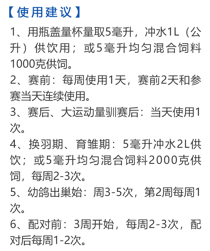 2026线上春展▪6元无门槛  -  指定商品:【爆灯】蓝精零 5克×10包 ;【爆灯】鸽滴威 5克×10包 ;【爆灯】莎门停 5克×10包 ;【爆灯】崇威灵 5克×10包 体内虫;【爆灯】益南混甘 5克×10包 ;【爆灯】回利球 5克×10包 ;【心连心】滴莎 10克×6袋;【爆灯】乎滴亢 5克×10包 ;【爆灯】超浓缩喜乐菌 500毫升 ;【心连心】球莎 10克×6袋 ;【爆灯】维诺护肝精 250毫升 ;【爆灯】虱螨体虫清 500毫升 ;【心连心】呼畅 10克×6袋 ;【爆灯】球可定 100毫升 ;【爆灯】复合预混合饲料Ⅱ维益菌 227克 ;【心连心】瘟痢停 10克×6袋 ;【爆灯】肠道宝 500克 ;【心连心】莎J净 10克×6袋 ;【心连心】鸽C净 10克×6袋 ;【顶峰】复合菌(胶囊)100粒 ;【顶峰】复合菌(粉剂) 280克 ;【顶峰】能量钙(浓缩型) 400毫升 ;【爱丽丝】喉痢清(加强型) 60粒(胶囊) ;【顶峰】能量钙(浓缩型) 2.5升 ;【爱丽丝】衣元净 60粒(胶囊);【施德福】特号六合一混合剂 5克×10包 ;【爱丽丝】毛滴虫净 60粒(胶囊);【爱丽丝】刹杆净(原沙门氏菌大肠杆菌杀星) 60粒(胶囊);【施德福】口服苗A 5克×10包 ;【爱丽丝】肝精 5克×10袋 ;【施德福】卡尼丁肝肾液 250毫升 ;【施德福】精华液 250毫升 ;【爱丽丝】呼吸道特号 60粒 (胶囊) ;【施德福】口服苗液 25毫升 ;【天津版稳拿】稳拿一号(呼吸道) 2公克×8袋 呼吸道;【天津版稳拿】稳拿二号(消化肠道) 3公克×8袋 肠道;【天津版稳拿】稳拿七号(毛滴虫) 2公克×8袋 毛滴虫;【上海龙园】魔宝 1000克 袋装;【上海龙园】维他肝精 250毫升 ;【上海龙园】鸽绿茶 100克 ;【上海龙园】浴宝 200克 ;【上海龙园】小育雏宝胶囊 100粒 ;【上海龙园】菌乐多 500毫升;【先锋】呼喉霸 5克×10包;【先锋】依原净 5克×10包 ;【西安凯鸽】客线枉 30毫升;【西安凯鸽】至樽独霸 100克;【西安凯鸽】至樽独霸 60粒(胶囊);【爆灯】T5鸽疫快克 20毫升 ;【西安凯鸽】果蔬营养丸 700克;【西安凯鸽】果蔬营养丸 2000克;【天津版稳拿】稳拿三号 2克×8包 球虫;【天津版稳拿】幼鸽夺霸 100粒 ;【天津版稳拿】幼鸽夺霸 300粒 ;【天津版稳拿】比赛夺霸3号 100粒 ;【天津版稳拿】比赛夺霸3号 300粒 ;【心连心】毛莎胶囊 60粒 ;【心连心】球锋胶囊 60粒 ;【天津版稳拿】虫清 3克×8包 体内虫;【心连心】呼畅 60粒(胶囊) ;【天津版稳拿】喉清 3克×8包 支原体/衣原体/念珠菌/呼吸道;【心连心】瘟痢停 60粒(胶囊) ;【天津版稳拿】粮霉清 200克 ;【心连心】莎J净胶囊 60粒 ;【爆灯】一滴灵 10毫升 单眼伤风;【爆灯】呼鼻灵 10毫升 ;【心连心】鸽C净 60粒(胶囊) ;【爆灯】维诺速补 100粒 ;【爆灯】老鸟回春丸 100粒 ;【心连心】毛呼二合一 10克×6袋;【爆灯】老鸟生子丸 100粒;【爆灯】依圆青 5克×10袋 ;【心连心】百消砃 100丸 ;【爆灯】泰力福 5克×10袋 呼吸道;【心连心】百消潵 150克 ;【爆灯】卫康防火墙 500毫升 ;【爆灯】矿力高峰液 250毫升;【心连心】独利双清 250毫升 ;【心连心】二合一啤酒酵母粉 600克 ;【爆灯】钙力奇 250毫升;【心连心】益酶多维电解质 150克 ;【爆灯】本草亢独饮 250毫升 ;【心连心】强化肝精(粉剂) 10克×10袋 ;【先锋】呼爽先锋 5克×10包 ;【心连心】强化肝精浓缩液 120毫升 ;【先锋】呼毛二合一 5克×10包 ;李猛推荐【爆灯】鸽疫康 500毫升 ;【先锋】先锋三合一 5克×10包 球虫/毛滴虫/沙门氏;【心连心】生物多肽矿物磷钙粉 500克 ;【先锋】净滴先锋 5克×10包;【心连心】AM活菌浓缩液 500毫升 ;【先锋】不脱翼 5毫升;李猛推荐【爆灯】维诺保 100毫升 ;【心连心】多效营养精华素 1680克 ;【心连心】AD3磷钙液 250毫升 ;【爆灯】超能素5000 1500克袋装 ;【心连心】瘟痢停丸 60丸 ;【爆灯】复合预混合饲料/6合1能量营养素 250克 ;【心连心】优益活菌液 1000毫升 ;【爱丽丝】喉痢清 5克×10袋 ;【上海龙园】种鸽宝 300粒 ;【上海龙园】种鸽粉 200克 ;【爱丽丝】衣原净2代 5克×10袋 ;【上海龙园】一喷灵 25毫升 ;【爱丽丝】毛滴净 5克×10袋 ;【上海龙园】绿色精 500毫升;【爱丽丝】刹杆净(原沙门氏菌大肠杆菌杀星) 5克×10袋 ;【上海龙园】营养蒜油 200毫升;【爱丽丝】呼吸道特号 5克×10袋 ;【上海龙园】康飞力 200毫升;【顶峰】保比液 100毫升 ;【上海龙园】赛神滴眼液 10毫升 ;【爱丽丝】毛球二合一 5克×10袋 ;【上海龙园】一滴灵 10毫升 单眼伤风;【爱丽丝】毛滴虫球虫二合一 60粒 ;【上海龙园】泻必停 5克×10袋 ;【顶峰】牛至香酚保比液 500毫升 ;【上海龙园】喉必清 5克×10袋;【顶峰】商寒停 100片 伤寒停;【顶峰】能量钙 300克 ;【上海龙园】抗球粉 5克×10包;【爱丽丝】稳肠赢 100克 ;【顶峰】全能电解质 500毫升 ;【上海龙园】抗滴粉 5克×10包 ;【顶峰】维他酵母粉 800克 ;【上海龙园】电解质维生素C粉 (甲7.5克+乙12.5克)×10组盒;【上海龙园】小育雏宝片剂 100片;【上海龙园】大育雏宝胶囊 500粒;【上海龙园】嗉囊清 100毫升;【上海龙园】大育雏宝片剂 500片;【上海龙园】粒粒成 100粒;【上海龙园】克虫宝 80粒;【上海龙园】红茶 100克;【上海龙园】强健宝 750克;【凡赛尔】欧乐强 鸽浴粉 1000克 天然沐浴圣品/消除肌肉疲劳/洗澡/洗浴;【爱丽丝】钙磷营养速补 400片;【北斗】雌宝 100粒;【北斗】雄宝 100粒 ;【北斗】克立停 100粒;【北斗】育雏宝 300粒;【天津版稳拿】稳拿五号 3克×8包 单眼伤风;【爆灯】多关秘密武器 30毫升 ;【爆灯】