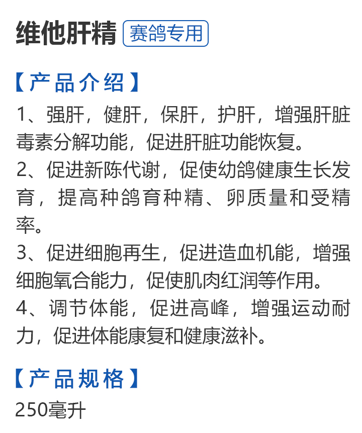 2026线上春展▪满200-10  -  指定商品:【爆灯】蓝精零 5克×10包 ;【爆灯】鸽滴威 5克×10包 ;【爆灯】莎门停 5克×10包 ;【爆灯】崇威灵 5克×10包 体内虫;【爆灯】益南混甘 5克×10包 ;【爆灯】回利球 5克×10包 ;【心连心】滴莎 10克×6袋;【爆灯】乎滴亢 5克×10包 ;【爆灯】超浓缩喜乐菌 500毫升 ;【心连心】球莎 10克×6袋 ;【爆灯】维诺护肝精 250毫升 ;【爆灯】虱螨体虫清 500毫升 ;【心连心】呼畅 10克×6袋 ;【爆灯】球可定 100毫升 ;【爆灯】复合预混合饲料Ⅱ维益菌 227克 ;【心连心】瘟痢停 10克×6袋 ;【爆灯】肠道宝 500克 ;【心连心】莎J净 10克×6袋 ;【心连心】鸽C净 10克×6袋 ;【顶峰】复合菌(胶囊)100粒 ;【顶峰】复合菌(粉剂) 280克 ;【顶峰】能量钙(浓缩型) 400毫升 ;【爱丽丝】喉痢清(加强型) 60粒(胶囊) ;【顶峰】能量钙(浓缩型) 2.5升 ;【爱丽丝】衣元净 60粒(胶囊);【施德福】特号六合一混合剂 5克×10包 ;【爱丽丝】毛滴虫净 60粒(胶囊);【爱丽丝】刹杆净(原沙门氏菌大肠杆菌杀星) 60粒(胶囊);【施德福】口服苗A 5克×10包 ;【爱丽丝】肝精 5克×10袋 ;【施德福】卡尼丁肝肾液 250毫升 ;【施德福】精华液 250毫升 ;【爱丽丝】呼吸道特号 60粒 (胶囊) ;【施德福】口服苗液 25毫升 ;【天津版稳拿】稳拿一号(呼吸道) 2公克×8袋 呼吸道;【天津版稳拿】稳拿二号(消化肠道) 3公克×8袋 肠道;【天津版稳拿】稳拿七号(毛滴虫) 2公克×8袋 毛滴虫;【上海龙园】魔宝 1000克 袋装;【上海龙园】维他肝精 250毫升 ;【上海龙园】鸽绿茶 100克 ;【上海龙园】浴宝 200克 ;【上海龙园】小育雏宝胶囊 100粒 ;【上海龙园】菌乐多 500毫升;【先锋】呼喉霸 5克×10包;【先锋】依原净 5克×10包 ;【西安凯鸽】客线枉 30毫升;【西安凯鸽】至樽独霸 100克;【西安凯鸽】至樽独霸 60粒(胶囊);【爆灯】T5鸽疫快克 20毫升 ;【西安凯鸽】果蔬营养丸 700克;【西安凯鸽】果蔬营养丸 2000克;【天津版稳拿】稳拿三号 2克×8包 球虫;【天津版稳拿】幼鸽夺霸 100粒 ;【天津版稳拿】幼鸽夺霸 300粒 ;【天津版稳拿】比赛夺霸3号 100粒 ;【天津版稳拿】比赛夺霸3号 300粒 ;【心连心】毛莎胶囊 60粒 ;【心连心】球锋胶囊 60粒 ;【天津版稳拿】虫清 3克×8包 体内虫;【心连心】呼畅 60粒(胶囊) ;【天津版稳拿】喉清 3克×8包 支原体/衣原体/念珠菌/呼吸道;【心连心】瘟痢停 60粒(胶囊) ;【天津版稳拿】粮霉清 200克 ;【心连心】莎J净胶囊 60粒 ;【爆灯】一滴灵 10毫升 单眼伤风;【爆灯】呼鼻灵 10毫升 ;【心连心】鸽C净 60粒(胶囊) ;【爆灯】维诺速补 100粒 ;【爆灯】老鸟回春丸 100粒 ;【心连心】毛呼二合一 10克×6袋;【爆灯】老鸟生子丸 100粒;【爆灯】依圆青 5克×10袋 ;【心连心】百消砃 100丸 ;【爆灯】泰力福 5克×10袋 呼吸道;【心连心】百消潵 150克 ;【爆灯】卫康防火墙 500毫升 ;【爆灯】矿力高峰液 250毫升;【心连心】独利双清 250毫升 ;【心连心】二合一啤酒酵母粉 600克 ;【爆灯】钙力奇 250毫升;【心连心】益酶多维电解质 150克 ;【爆灯】本草亢独饮 250毫升 ;【心连心】强化肝精(粉剂) 10克×10袋 ;【先锋】呼爽先锋 5克×10包 ;【心连心】强化肝精浓缩液 120毫升 ;【先锋】呼毛二合一 5克×10包 ;李猛推荐【爆灯】鸽疫康 500毫升 ;【先锋】先锋三合一 5克×10包 球虫/毛滴虫/沙门氏;【心连心】生物多肽矿物磷钙粉 500克 ;【先锋】净滴先锋 5克×10包;【心连心】AM活菌浓缩液 500毫升 ;【先锋】不脱翼 5毫升;李猛推荐【爆灯】维诺保 100毫升 ;【心连心】多效营养精华素 1680克 ;【心连心】AD3磷钙液 250毫升 ;【爆灯】超能素5000 1500克袋装 ;【心连心】瘟痢停丸 60丸 ;【爆灯】复合预混合饲料/6合1能量营养素 250克 ;【心连心】优益活菌液 1000毫升 ;【爱丽丝】喉痢清 5克×10袋 ;【上海龙园】种鸽宝 300粒 ;【上海龙园】种鸽粉 200克 ;【爱丽丝】衣原净2代 5克×10袋 ;【上海龙园】一喷灵 25毫升 ;【爱丽丝】毛滴净 5克×10袋 ;【上海龙园】绿色精 500毫升;【爱丽丝】刹杆净(原沙门氏菌大肠杆菌杀星) 5克×10袋 ;【上海龙园】营养蒜油 200毫升;【爱丽丝】呼吸道特号 5克×10袋 ;【上海龙园】康飞力 200毫升;【顶峰】保比液 100毫升 ;【上海龙园】赛神滴眼液 10毫升 ;【爱丽丝】毛球二合一 5克×10袋 ;【上海龙园】一滴灵 10毫升 单眼伤风;【爱丽丝】毛滴虫球虫二合一 60粒 ;【上海龙园】泻必停 5克×10袋 ;【顶峰】牛至香酚保比液 500毫升 ;【上海龙园】喉必清 5克×10袋;【顶峰】商寒停 100片 伤寒停;【顶峰】能量钙 300克 ;【上海龙园】抗球粉 5克×10包;【爱丽丝】稳肠赢 100克 ;【顶峰】全能电解质 500毫升 ;【上海龙园】抗滴粉 5克×10包 ;【顶峰】维他酵母粉 800克 ;【上海龙园】电解质维生素C粉 (甲7.5克+乙12.5克)×10组盒;【上海龙园】小育雏宝片剂 100片;【上海龙园】大育雏宝胶囊 500粒;【上海龙园】嗉囊清 100毫升;【上海龙园】大育雏宝片剂 500片;【上海龙园】粒粒成 100粒;【上海龙园】克虫宝 80粒;【上海龙园】红茶 100克;【上海龙园】强健宝 750克;【凡赛尔】欧乐强 鸽浴粉 1000克 天然沐浴圣品/消除肌肉疲劳/洗澡/洗浴;【爱丽丝】钙磷营养速补 400片;【北斗】雌宝 100粒;【北斗】雄宝 100粒 ;【北斗】克立停 100粒;【北斗】育雏宝 300粒;【天津版稳拿】稳拿五号 3克×8包 单眼伤风;【爆灯】多关秘密武器 30毫升 ;【爆灯】维诺