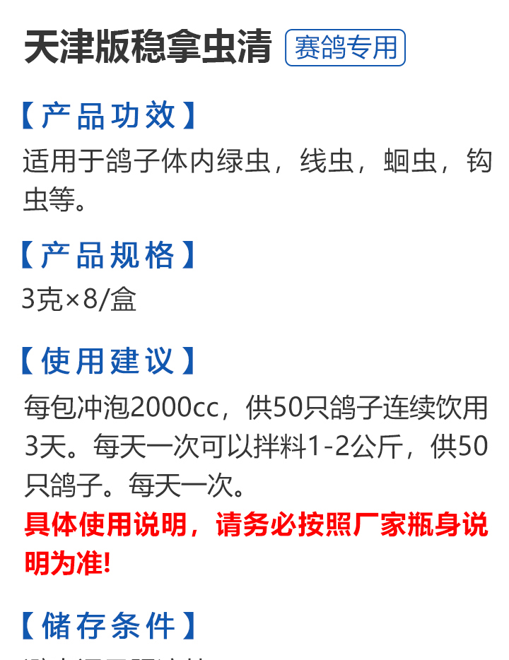 2026线上春展▪满800-60  -  指定商品:【爆灯】蓝精零 5克×10包 ;【爆灯】鸽滴威 5克×10包 ;【爆灯】莎门停 5克×10包 ;【爆灯】崇威灵 5克×10包 体内虫;【爆灯】益南混甘 5克×10包 ;【爆灯】回利球 5克×10包 ;【心连心】滴莎 10克×6袋;【爆灯】乎滴亢 5克×10包 ;【爆灯】超浓缩喜乐菌 500毫升 ;【心连心】球莎 10克×6袋 ;【爆灯】维诺护肝精 250毫升 ;【爆灯】虱螨体虫清 500毫升 ;【心连心】呼畅 10克×6袋 ;【爆灯】球可定 100毫升 ;【爆灯】复合预混合饲料Ⅱ维益菌 227克 ;【心连心】瘟痢停 10克×6袋 ;【爆灯】肠道宝 500克 ;【心连心】莎J净 10克×6袋 ;【心连心】鸽C净 10克×6袋 ;【顶峰】复合菌(胶囊)100粒 ;【顶峰】复合菌(粉剂) 280克 ;【顶峰】能量钙(浓缩型) 400毫升 ;【爱丽丝】喉痢清(加强型) 60粒(胶囊) ;【顶峰】能量钙(浓缩型) 2.5升 ;【爱丽丝】衣元净 60粒(胶囊);【施德福】特号六合一混合剂 5克×10包 ;【爱丽丝】毛滴虫净 60粒(胶囊);【爱丽丝】刹杆净(原沙门氏菌大肠杆菌杀星) 60粒(胶囊);【施德福】口服苗A 5克×10包 ;【爱丽丝】肝精 5克×10袋 ;【施德福】卡尼丁肝肾液 250毫升 ;【施德福】精华液 250毫升 ;【爱丽丝】呼吸道特号 60粒 (胶囊) ;【施德福】口服苗液 25毫升 ;【天津版稳拿】稳拿一号(呼吸道) 2公克×8袋 呼吸道;【天津版稳拿】稳拿二号(消化肠道) 3公克×8袋 肠道;【天津版稳拿】稳拿七号(毛滴虫) 2公克×8袋 毛滴虫;【上海龙园】魔宝 1000克 袋装;【上海龙园】维他肝精 250毫升 ;【上海龙园】鸽绿茶 100克 ;【上海龙园】浴宝 200克 ;【上海龙园】小育雏宝胶囊 100粒 ;【上海龙园】菌乐多 500毫升;【先锋】呼喉霸 5克×10包;【先锋】依原净 5克×10包 ;【西安凯鸽】客线枉 30毫升;【西安凯鸽】至樽独霸 100克;【西安凯鸽】至樽独霸 60粒(胶囊);【爆灯】T5鸽疫快克 20毫升 ;【西安凯鸽】果蔬营养丸 700克;【西安凯鸽】果蔬营养丸 2000克;【天津版稳拿】稳拿三号 2克×8包 球虫;【天津版稳拿】幼鸽夺霸 100粒 ;【天津版稳拿】幼鸽夺霸 300粒 ;【天津版稳拿】比赛夺霸3号 100粒 ;【天津版稳拿】比赛夺霸3号 300粒 ;【心连心】毛莎胶囊 60粒 ;【心连心】球锋胶囊 60粒 ;【天津版稳拿】虫清 3克×8包 体内虫;【心连心】呼畅 60粒(胶囊) ;【天津版稳拿】喉清 3克×8包 支原体/衣原体/念珠菌/呼吸道;【心连心】瘟痢停 60粒(胶囊) ;【天津版稳拿】粮霉清 200克 ;【心连心】莎J净胶囊 60粒 ;【爆灯】一滴灵 10毫升 单眼伤风;【爆灯】呼鼻灵 10毫升 ;【心连心】鸽C净 60粒(胶囊) ;【爆灯】维诺速补 100粒 ;【爆灯】老鸟回春丸 100粒 ;【心连心】毛呼二合一 10克×6袋;【爆灯】老鸟生子丸 100粒;【爆灯】依圆青 5克×10袋 ;【心连心】百消砃 100丸 ;【爆灯】泰力福 5克×10袋 呼吸道;【心连心】百消潵 150克 ;【爆灯】卫康防火墙 500毫升 ;【爆灯】矿力高峰液 250毫升;【心连心】独利双清 250毫升 ;【心连心】二合一啤酒酵母粉 600克 ;【爆灯】钙力奇 250毫升;【心连心】益酶多维电解质 150克 ;【爆灯】本草亢独饮 250毫升 ;【心连心】强化肝精(粉剂) 10克×10袋 ;【先锋】呼爽先锋 5克×10包 ;【心连心】强化肝精浓缩液 120毫升 ;【先锋】呼毛二合一 5克×10包 ;李猛推荐【爆灯】鸽疫康 500毫升 ;【先锋】先锋三合一 5克×10包 球虫/毛滴虫/沙门氏;【心连心】生物多肽矿物磷钙粉 500克 ;【先锋】净滴先锋 5克×10包;【心连心】AM活菌浓缩液 500毫升 ;【先锋】不脱翼 5毫升;李猛推荐【爆灯】维诺保 100毫升 ;【心连心】多效营养精华素 1680克 ;【心连心】AD3磷钙液 250毫升 ;【爆灯】超能素5000 1500克袋装 ;【心连心】瘟痢停丸 60丸 ;【爆灯】复合预混合饲料/6合1能量营养素 250克 ;【心连心】优益活菌液 1000毫升 ;【爱丽丝】喉痢清 5克×10袋 ;【上海龙园】种鸽宝 300粒 ;【上海龙园】种鸽粉 200克 ;【爱丽丝】衣原净2代 5克×10袋 ;【上海龙园】一喷灵 25毫升 ;【爱丽丝】毛滴净 5克×10袋 ;【上海龙园】绿色精 500毫升;【爱丽丝】刹杆净(原沙门氏菌大肠杆菌杀星) 5克×10袋 ;【上海龙园】营养蒜油 200毫升;【爱丽丝】呼吸道特号 5克×10袋 ;【上海龙园】康飞力 200毫升;【顶峰】保比液 100毫升 ;【上海龙园】赛神滴眼液 10毫升 ;【爱丽丝】毛球二合一 5克×10袋 ;【上海龙园】一滴灵 10毫升 单眼伤风;【爱丽丝】毛滴虫球虫二合一 60粒 ;【上海龙园】泻必停 5克×10袋 ;【顶峰】牛至香酚保比液 500毫升 ;【上海龙园】喉必清 5克×10袋;【顶峰】商寒停 100片 伤寒停;【顶峰】能量钙 300克 ;【上海龙园】抗球粉 5克×10包;【爱丽丝】稳肠赢 100克 ;【顶峰】全能电解质 500毫升 ;【上海龙园】抗滴粉 5克×10包 ;【顶峰】维他酵母粉 800克 ;【上海龙园】电解质维生素C粉 (甲7.5克+乙12.5克)×10组盒;【上海龙园】小育雏宝片剂 100片;【上海龙园】大育雏宝胶囊 500粒;【上海龙园】嗉囊清 100毫升;【上海龙园】大育雏宝片剂 500片;【上海龙园】粒粒成 100粒;【上海龙园】克虫宝 80粒;【上海龙园】红茶 100克;【上海龙园】强健宝 750克;【凡赛尔】欧乐强 鸽浴粉 1000克 天然沐浴圣品/消除肌肉疲劳/洗澡/洗浴;【爱丽丝】钙磷营养速补 400片;【北斗】雌宝 100粒;【北斗】雄宝 100粒 ;【北斗】克立停 100粒;【北斗】育雏宝 300粒;【天津版稳拿】稳拿五号 3克×8包 单眼伤风;【爆灯】多关秘密武器 30毫升 ;【爆灯】维诺