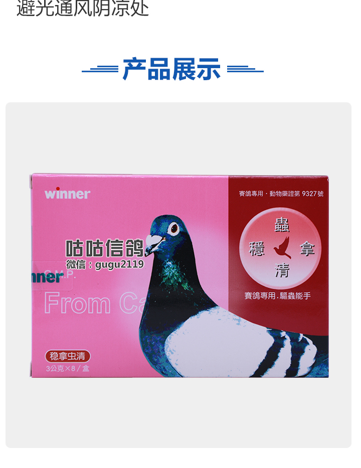 2026线上春展▪6元无门槛  -  指定商品:【爆灯】蓝精零 5克×10包 ;【爆灯】鸽滴威 5克×10包 ;【爆灯】莎门停 5克×10包 ;【爆灯】崇威灵 5克×10包 体内虫;【爆灯】益南混甘 5克×10包 ;【爆灯】回利球 5克×10包 ;【心连心】滴莎 10克×6袋;【爆灯】乎滴亢 5克×10包 ;【爆灯】超浓缩喜乐菌 500毫升 ;【心连心】球莎 10克×6袋 ;【爆灯】维诺护肝精 250毫升 ;【爆灯】虱螨体虫清 500毫升 ;【心连心】呼畅 10克×6袋 ;【爆灯】球可定 100毫升 ;【爆灯】复合预混合饲料Ⅱ维益菌 227克 ;【心连心】瘟痢停 10克×6袋 ;【爆灯】肠道宝 500克 ;【心连心】莎J净 10克×6袋 ;【心连心】鸽C净 10克×6袋 ;【顶峰】复合菌(胶囊)100粒 ;【顶峰】复合菌(粉剂) 280克 ;【顶峰】能量钙(浓缩型) 400毫升 ;【爱丽丝】喉痢清(加强型) 60粒(胶囊) ;【顶峰】能量钙(浓缩型) 2.5升 ;【爱丽丝】衣元净 60粒(胶囊);【施德福】特号六合一混合剂 5克×10包 ;【爱丽丝】毛滴虫净 60粒(胶囊);【爱丽丝】刹杆净(原沙门氏菌大肠杆菌杀星) 60粒(胶囊);【施德福】口服苗A 5克×10包 ;【爱丽丝】肝精 5克×10袋 ;【施德福】卡尼丁肝肾液 250毫升 ;【施德福】精华液 250毫升 ;【爱丽丝】呼吸道特号 60粒 (胶囊) ;【施德福】口服苗液 25毫升 ;【天津版稳拿】稳拿一号(呼吸道) 2公克×8袋 呼吸道;【天津版稳拿】稳拿二号(消化肠道) 3公克×8袋 肠道;【天津版稳拿】稳拿七号(毛滴虫) 2公克×8袋 毛滴虫;【上海龙园】魔宝 1000克 袋装;【上海龙园】维他肝精 250毫升 ;【上海龙园】鸽绿茶 100克 ;【上海龙园】浴宝 200克 ;【上海龙园】小育雏宝胶囊 100粒 ;【上海龙园】菌乐多 500毫升;【先锋】呼喉霸 5克×10包;【先锋】依原净 5克×10包 ;【西安凯鸽】客线枉 30毫升;【西安凯鸽】至樽独霸 100克;【西安凯鸽】至樽独霸 60粒(胶囊);【爆灯】T5鸽疫快克 20毫升 ;【西安凯鸽】果蔬营养丸 700克;【西安凯鸽】果蔬营养丸 2000克;【天津版稳拿】稳拿三号 2克×8包 球虫;【天津版稳拿】幼鸽夺霸 100粒 ;【天津版稳拿】幼鸽夺霸 300粒 ;【天津版稳拿】比赛夺霸3号 100粒 ;【天津版稳拿】比赛夺霸3号 300粒 ;【心连心】毛莎胶囊 60粒 ;【心连心】球锋胶囊 60粒 ;【天津版稳拿】虫清 3克×8包 体内虫;【心连心】呼畅 60粒(胶囊) ;【天津版稳拿】喉清 3克×8包 支原体/衣原体/念珠菌/呼吸道;【心连心】瘟痢停 60粒(胶囊) ;【天津版稳拿】粮霉清 200克 ;【心连心】莎J净胶囊 60粒 ;【爆灯】一滴灵 10毫升 单眼伤风;【爆灯】呼鼻灵 10毫升 ;【心连心】鸽C净 60粒(胶囊) ;【爆灯】维诺速补 100粒 ;【爆灯】老鸟回春丸 100粒 ;【心连心】毛呼二合一 10克×6袋;【爆灯】老鸟生子丸 100粒;【爆灯】依圆青 5克×10袋 ;【心连心】百消砃 100丸 ;【爆灯】泰力福 5克×10袋 呼吸道;【心连心】百消潵 150克 ;【爆灯】卫康防火墙 500毫升 ;【爆灯】矿力高峰液 250毫升;【心连心】独利双清 250毫升 ;【心连心】二合一啤酒酵母粉 600克 ;【爆灯】钙力奇 250毫升;【心连心】益酶多维电解质 150克 ;【爆灯】本草亢独饮 250毫升 ;【心连心】强化肝精(粉剂) 10克×10袋 ;【先锋】呼爽先锋 5克×10包 ;【心连心】强化肝精浓缩液 120毫升 ;【先锋】呼毛二合一 5克×10包 ;李猛推荐【爆灯】鸽疫康 500毫升 ;【先锋】先锋三合一 5克×10包 球虫/毛滴虫/沙门氏;【心连心】生物多肽矿物磷钙粉 500克 ;【先锋】净滴先锋 5克×10包;【心连心】AM活菌浓缩液 500毫升 ;【先锋】不脱翼 5毫升;李猛推荐【爆灯】维诺保 100毫升 ;【心连心】多效营养精华素 1680克 ;【心连心】AD3磷钙液 250毫升 ;【爆灯】超能素5000 1500克袋装 ;【心连心】瘟痢停丸 60丸 ;【爆灯】复合预混合饲料/6合1能量营养素 250克 ;【心连心】优益活菌液 1000毫升 ;【爱丽丝】喉痢清 5克×10袋 ;【上海龙园】种鸽宝 300粒 ;【上海龙园】种鸽粉 200克 ;【爱丽丝】衣原净2代 5克×10袋 ;【上海龙园】一喷灵 25毫升 ;【爱丽丝】毛滴净 5克×10袋 ;【上海龙园】绿色精 500毫升;【爱丽丝】刹杆净(原沙门氏菌大肠杆菌杀星) 5克×10袋 ;【上海龙园】营养蒜油 200毫升;【爱丽丝】呼吸道特号 5克×10袋 ;【上海龙园】康飞力 200毫升;【顶峰】保比液 100毫升 ;【上海龙园】赛神滴眼液 10毫升 ;【爱丽丝】毛球二合一 5克×10袋 ;【上海龙园】一滴灵 10毫升 单眼伤风;【爱丽丝】毛滴虫球虫二合一 60粒 ;【上海龙园】泻必停 5克×10袋 ;【顶峰】牛至香酚保比液 500毫升 ;【上海龙园】喉必清 5克×10袋;【顶峰】商寒停 100片 伤寒停;【顶峰】能量钙 300克 ;【上海龙园】抗球粉 5克×10包;【爱丽丝】稳肠赢 100克 ;【顶峰】全能电解质 500毫升 ;【上海龙园】抗滴粉 5克×10包 ;【顶峰】维他酵母粉 800克 ;【上海龙园】电解质维生素C粉 (甲7.5克+乙12.5克)×10组盒;【上海龙园】小育雏宝片剂 100片;【上海龙园】大育雏宝胶囊 500粒;【上海龙园】嗉囊清 100毫升;【上海龙园】大育雏宝片剂 500片;【上海龙园】粒粒成 100粒;【上海龙园】克虫宝 80粒;【上海龙园】红茶 100克;【上海龙园】强健宝 750克;【凡赛尔】欧乐强 鸽浴粉 1000克 天然沐浴圣品/消除肌肉疲劳/洗澡/洗浴;【爱丽丝】钙磷营养速补 400片;【北斗】雌宝 100粒;【北斗】雄宝 100粒 ;【北斗】克立停 100粒;【北斗】育雏宝 300粒;【天津版稳拿】稳拿五号 3克×8包 单眼伤风;【爆灯】多关秘密武器 30毫升 ;【爆灯】