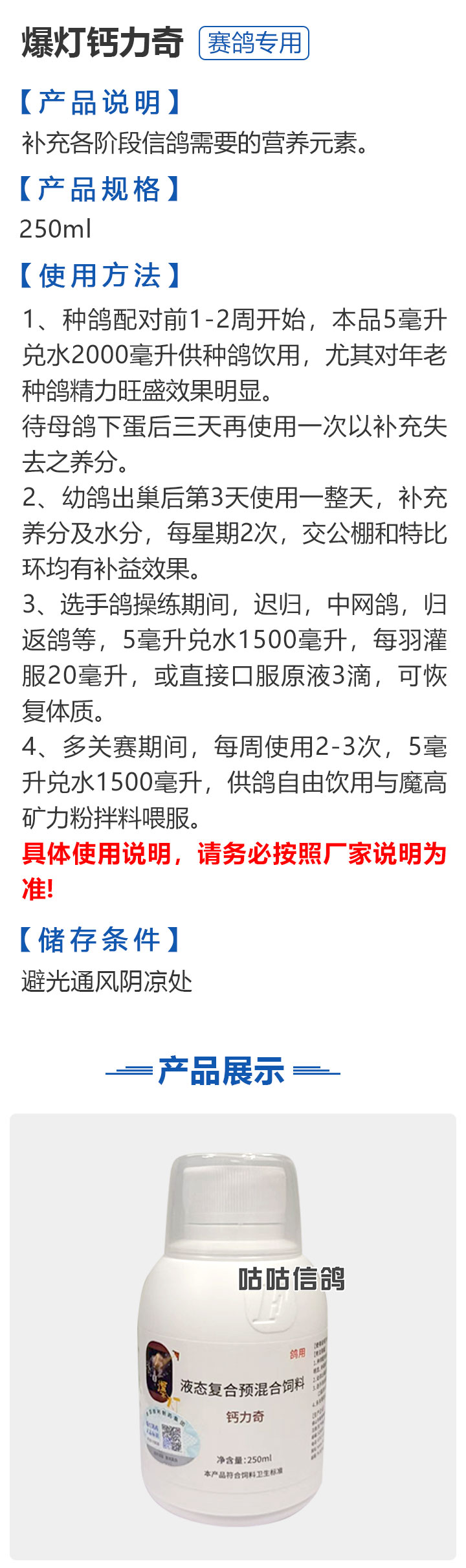 2026线上春展▪满600-40  -  指定商品:【爆灯】蓝精零 5克×10包 ;【爆灯】鸽滴威 5克×10包 ;【爆灯】莎门停 5克×10包 ;【爆灯】崇威灵 5克×10包 体内虫;【爆灯】益南混甘 5克×10包 ;【爆灯】回利球 5克×10包 ;【心连心】滴莎 10克×6袋;【爆灯】乎滴亢 5克×10包 ;【爆灯】超浓缩喜乐菌 500毫升 ;【心连心】球莎 10克×6袋 ;【爆灯】维诺护肝精 250毫升 ;【爆灯】虱螨体虫清 500毫升 ;【心连心】呼畅 10克×6袋 ;【爆灯】球可定 100毫升 ;【爆灯】复合预混合饲料Ⅱ维益菌 227克 ;【心连心】瘟痢停 10克×6袋 ;【爆灯】肠道宝 500克 ;【心连心】莎J净 10克×6袋 ;【心连心】鸽C净 10克×6袋 ;【顶峰】复合菌(胶囊)100粒 ;【顶峰】复合菌(粉剂) 280克 ;【顶峰】能量钙(浓缩型) 400毫升 ;【爱丽丝】喉痢清(加强型) 60粒(胶囊) ;【顶峰】能量钙(浓缩型) 2.5升 ;【爱丽丝】衣元净 60粒(胶囊);【施德福】特号六合一混合剂 5克×10包 ;【爱丽丝】毛滴虫净 60粒(胶囊);【爱丽丝】刹杆净(原沙门氏菌大肠杆菌杀星) 60粒(胶囊);【施德福】口服苗A 5克×10包 ;【爱丽丝】肝精 5克×10袋 ;【施德福】卡尼丁肝肾液 250毫升 ;【施德福】精华液 250毫升 ;【爱丽丝】呼吸道特号 60粒 (胶囊) ;【施德福】口服苗液 25毫升 ;【天津版稳拿】稳拿一号(呼吸道) 2公克×8袋 呼吸道;【天津版稳拿】稳拿二号(消化肠道) 3公克×8袋 肠道;【天津版稳拿】稳拿七号(毛滴虫) 2公克×8袋 毛滴虫;【上海龙园】魔宝 1000克 袋装;【上海龙园】维他肝精 250毫升 ;【上海龙园】鸽绿茶 100克 ;【上海龙园】浴宝 200克 ;【上海龙园】小育雏宝胶囊 100粒 ;【上海龙园】菌乐多 500毫升;【先锋】呼喉霸 5克×10包;【先锋】依原净 5克×10包 ;【西安凯鸽】客线枉 30毫升;【西安凯鸽】至樽独霸 100克;【西安凯鸽】至樽独霸 60粒(胶囊);【爆灯】T5鸽疫快克 20毫升 ;【西安凯鸽】果蔬营养丸 700克;【西安凯鸽】果蔬营养丸 2000克;【天津版稳拿】稳拿三号 2克×8包 球虫;【天津版稳拿】幼鸽夺霸 100粒 ;【天津版稳拿】幼鸽夺霸 300粒 ;【天津版稳拿】比赛夺霸3号 100粒 ;【天津版稳拿】比赛夺霸3号 300粒 ;【心连心】毛莎胶囊 60粒 ;【心连心】球锋胶囊 60粒 ;【天津版稳拿】虫清 3克×8包 体内虫;【心连心】呼畅 60粒(胶囊) ;【天津版稳拿】喉清 3克×8包 支原体/衣原体/念珠菌/呼吸道;【心连心】瘟痢停 60粒(胶囊) ;【天津版稳拿】粮霉清 200克 ;【心连心】莎J净胶囊 60粒 ;【爆灯】一滴灵 10毫升 单眼伤风;【爆灯】呼鼻灵 10毫升 ;【心连心】鸽C净 60粒(胶囊) ;【爆灯】维诺速补 100粒 ;【爆灯】老鸟回春丸 100粒 ;【心连心】毛呼二合一 10克×6袋;【爆灯】老鸟生子丸 100粒;【爆灯】依圆青 5克×10袋 ;【心连心】百消砃 100丸 ;【爆灯】泰力福 5克×10袋 呼吸道;【心连心】百消潵 150克 ;【爆灯】卫康防火墙 500毫升 ;【爆灯】矿力高峰液 250毫升;【心连心】独利双清 250毫升 ;【心连心】二合一啤酒酵母粉 600克 ;【爆灯】钙力奇 250毫升;【心连心】益酶多维电解质 150克 ;【爆灯】本草亢独饮 250毫升 ;【心连心】强化肝精(粉剂) 10克×10袋 ;【先锋】呼爽先锋 5克×10包 ;【心连心】强化肝精浓缩液 120毫升 ;【先锋】呼毛二合一 5克×10包 ;李猛推荐【爆灯】鸽疫康 500毫升 ;【先锋】先锋三合一 5克×10包 球虫/毛滴虫/沙门氏;【心连心】生物多肽矿物磷钙粉 500克 ;【先锋】净滴先锋 5克×10包;【心连心】AM活菌浓缩液 500毫升 ;【先锋】不脱翼 5毫升;李猛推荐【爆灯】维诺保 100毫升 ;【心连心】多效营养精华素 1680克 ;【心连心】AD3磷钙液 250毫升 ;【爆灯】超能素5000 1500克袋装 ;【心连心】瘟痢停丸 60丸 ;【爆灯】复合预混合饲料/6合1能量营养素 250克 ;【心连心】优益活菌液 1000毫升 ;【爱丽丝】喉痢清 5克×10袋 ;【上海龙园】种鸽宝 300粒 ;【上海龙园】种鸽粉 200克 ;【爱丽丝】衣原净2代 5克×10袋 ;【上海龙园】一喷灵 25毫升 ;【爱丽丝】毛滴净 5克×10袋 ;【上海龙园】绿色精 500毫升;【爱丽丝】刹杆净(原沙门氏菌大肠杆菌杀星) 5克×10袋 ;【上海龙园】营养蒜油 200毫升;【爱丽丝】呼吸道特号 5克×10袋 ;【上海龙园】康飞力 200毫升;【顶峰】保比液 100毫升 ;【上海龙园】赛神滴眼液 10毫升 ;【爱丽丝】毛球二合一 5克×10袋 ;【上海龙园】一滴灵 10毫升 单眼伤风;【爱丽丝】毛滴虫球虫二合一 60粒 ;【上海龙园】泻必停 5克×10袋 ;【顶峰】牛至香酚保比液 500毫升 ;【上海龙园】喉必清 5克×10袋;【顶峰】商寒停 100片 伤寒停;【顶峰】能量钙 300克 ;【上海龙园】抗球粉 5克×10包;【爱丽丝】稳肠赢 100克 ;【顶峰】全能电解质 500毫升 ;【上海龙园】抗滴粉 5克×10包 ;【顶峰】维他酵母粉 800克 ;【上海龙园】电解质维生素C粉 (甲7.5克+乙12.5克)×10组盒;【上海龙园】小育雏宝片剂 100片;【上海龙园】大育雏宝胶囊 500粒;【上海龙园】嗉囊清 100毫升;【上海龙园】大育雏宝片剂 500片;【上海龙园】粒粒成 100粒;【上海龙园】克虫宝 80粒;【上海龙园】红茶 100克;【上海龙园】强健宝 750克;【凡赛尔】欧乐强 鸽浴粉 1000克 天然沐浴圣品/消除肌肉疲劳/洗澡/洗浴;【爱丽丝】钙磷营养速补 400片;【北斗】雌宝 100粒;【北斗】雄宝 100粒 ;【北斗】克立停 100粒;【北斗】育雏宝 300粒;【天津版稳拿】稳拿五号 3克×8包 单眼伤风;【爆灯】多关秘密武器 30毫升 ;【爆灯】维诺