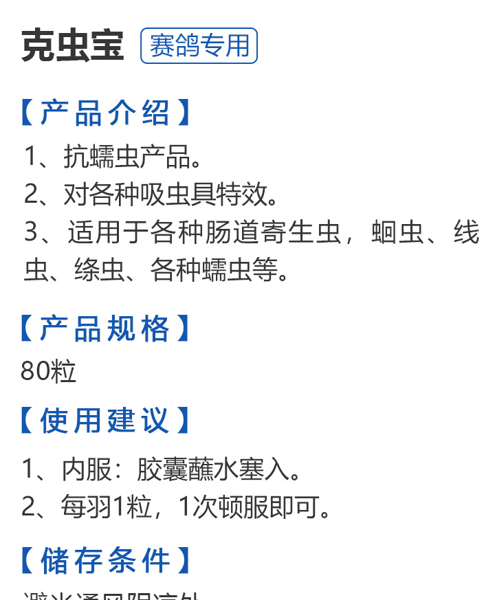 2026线上春展▪满600-40  -  指定商品:【爆灯】蓝精零 5克×10包 ;【爆灯】鸽滴威 5克×10包 ;【爆灯】莎门停 5克×10包 ;【爆灯】崇威灵 5克×10包 体内虫;【爆灯】益南混甘 5克×10包 ;【爆灯】回利球 5克×10包 ;【心连心】滴莎 10克×6袋;【爆灯】乎滴亢 5克×10包 ;【爆灯】超浓缩喜乐菌 500毫升 ;【心连心】球莎 10克×6袋 ;【爆灯】维诺护肝精 250毫升 ;【爆灯】虱螨体虫清 500毫升 ;【心连心】呼畅 10克×6袋 ;【爆灯】球可定 100毫升 ;【爆灯】复合预混合饲料Ⅱ维益菌 227克 ;【心连心】瘟痢停 10克×6袋 ;【爆灯】肠道宝 500克 ;【心连心】莎J净 10克×6袋 ;【心连心】鸽C净 10克×6袋 ;【顶峰】复合菌(胶囊)100粒 ;【顶峰】复合菌(粉剂) 280克 ;【顶峰】能量钙(浓缩型) 400毫升 ;【爱丽丝】喉痢清(加强型) 60粒(胶囊) ;【顶峰】能量钙(浓缩型) 2.5升 ;【爱丽丝】衣元净 60粒(胶囊);【施德福】特号六合一混合剂 5克×10包 ;【爱丽丝】毛滴虫净 60粒(胶囊);【爱丽丝】刹杆净(原沙门氏菌大肠杆菌杀星) 60粒(胶囊);【施德福】口服苗A 5克×10包 ;【爱丽丝】肝精 5克×10袋 ;【施德福】卡尼丁肝肾液 250毫升 ;【施德福】精华液 250毫升 ;【爱丽丝】呼吸道特号 60粒 (胶囊) ;【施德福】口服苗液 25毫升 ;【天津版稳拿】稳拿一号(呼吸道) 2公克×8袋 呼吸道;【天津版稳拿】稳拿二号(消化肠道) 3公克×8袋 肠道;【天津版稳拿】稳拿七号(毛滴虫) 2公克×8袋 毛滴虫;【上海龙园】魔宝 1000克 袋装;【上海龙园】维他肝精 250毫升 ;【上海龙园】鸽绿茶 100克 ;【上海龙园】浴宝 200克 ;【上海龙园】小育雏宝胶囊 100粒 ;【上海龙园】菌乐多 500毫升;【先锋】呼喉霸 5克×10包;【先锋】依原净 5克×10包 ;【西安凯鸽】客线枉 30毫升;【西安凯鸽】至樽独霸 100克;【西安凯鸽】至樽独霸 60粒(胶囊);【爆灯】T5鸽疫快克 20毫升 ;【西安凯鸽】果蔬营养丸 700克;【西安凯鸽】果蔬营养丸 2000克;【天津版稳拿】稳拿三号 2克×8包 球虫;【天津版稳拿】幼鸽夺霸 100粒 ;【天津版稳拿】幼鸽夺霸 300粒 ;【天津版稳拿】比赛夺霸3号 100粒 ;【天津版稳拿】比赛夺霸3号 300粒 ;【心连心】毛莎胶囊 60粒 ;【心连心】球锋胶囊 60粒 ;【天津版稳拿】虫清 3克×8包 体内虫;【心连心】呼畅 60粒(胶囊) ;【天津版稳拿】喉清 3克×8包 支原体/衣原体/念珠菌/呼吸道;【心连心】瘟痢停 60粒(胶囊) ;【天津版稳拿】粮霉清 200克 ;【心连心】莎J净胶囊 60粒 ;【爆灯】一滴灵 10毫升 单眼伤风;【爆灯】呼鼻灵 10毫升 ;【心连心】鸽C净 60粒(胶囊) ;【爆灯】维诺速补 100粒 ;【爆灯】老鸟回春丸 100粒 ;【心连心】毛呼二合一 10克×6袋;【爆灯】老鸟生子丸 100粒;【爆灯】依圆青 5克×10袋 ;【心连心】百消砃 100丸 ;【爆灯】泰力福 5克×10袋 呼吸道;【心连心】百消潵 150克 ;【爆灯】卫康防火墙 500毫升 ;【爆灯】矿力高峰液 250毫升;【心连心】独利双清 250毫升 ;【心连心】二合一啤酒酵母粉 600克 ;【爆灯】钙力奇 250毫升;【心连心】益酶多维电解质 150克 ;【爆灯】本草亢独饮 250毫升 ;【心连心】强化肝精(粉剂) 10克×10袋 ;【先锋】呼爽先锋 5克×10包 ;【心连心】强化肝精浓缩液 120毫升 ;【先锋】呼毛二合一 5克×10包 ;李猛推荐【爆灯】鸽疫康 500毫升 ;【先锋】先锋三合一 5克×10包 球虫/毛滴虫/沙门氏;【心连心】生物多肽矿物磷钙粉 500克 ;【先锋】净滴先锋 5克×10包;【心连心】AM活菌浓缩液 500毫升 ;【先锋】不脱翼 5毫升;李猛推荐【爆灯】维诺保 100毫升 ;【心连心】多效营养精华素 1680克 ;【心连心】AD3磷钙液 250毫升 ;【爆灯】超能素5000 1500克袋装 ;【心连心】瘟痢停丸 60丸 ;【爆灯】复合预混合饲料/6合1能量营养素 250克 ;【心连心】优益活菌液 1000毫升 ;【爱丽丝】喉痢清 5克×10袋 ;【上海龙园】种鸽宝 300粒 ;【上海龙园】种鸽粉 200克 ;【爱丽丝】衣原净2代 5克×10袋 ;【上海龙园】一喷灵 25毫升 ;【爱丽丝】毛滴净 5克×10袋 ;【上海龙园】绿色精 500毫升;【爱丽丝】刹杆净(原沙门氏菌大肠杆菌杀星) 5克×10袋 ;【上海龙园】营养蒜油 200毫升;【爱丽丝】呼吸道特号 5克×10袋 ;【上海龙园】康飞力 200毫升;【顶峰】保比液 100毫升 ;【上海龙园】赛神滴眼液 10毫升 ;【爱丽丝】毛球二合一 5克×10袋 ;【上海龙园】一滴灵 10毫升 单眼伤风;【爱丽丝】毛滴虫球虫二合一 60粒 ;【上海龙园】泻必停 5克×10袋 ;【顶峰】牛至香酚保比液 500毫升 ;【上海龙园】喉必清 5克×10袋;【顶峰】商寒停 100片 伤寒停;【顶峰】能量钙 300克 ;【上海龙园】抗球粉 5克×10包;【爱丽丝】稳肠赢 100克 ;【顶峰】全能电解质 500毫升 ;【上海龙园】抗滴粉 5克×10包 ;【顶峰】维他酵母粉 800克 ;【上海龙园】电解质维生素C粉 (甲7.5克+乙12.5克)×10组盒;【上海龙园】小育雏宝片剂 100片;【上海龙园】大育雏宝胶囊 500粒;【上海龙园】嗉囊清 100毫升;【上海龙园】大育雏宝片剂 500片;【上海龙园】粒粒成 100粒;【上海龙园】克虫宝 80粒;【上海龙园】红茶 100克;【上海龙园】强健宝 750克;【凡赛尔】欧乐强 鸽浴粉 1000克 天然沐浴圣品/消除肌肉疲劳/洗澡/洗浴;【爱丽丝】钙磷营养速补 400片;【北斗】雌宝 100粒;【北斗】雄宝 100粒 ;【北斗】克立停 100粒;【北斗】育雏宝 300粒;【天津版稳拿】稳拿五号 3克×8包 单眼伤风;【爆灯】多关秘密武器 30毫升 ;【爆灯】维诺
