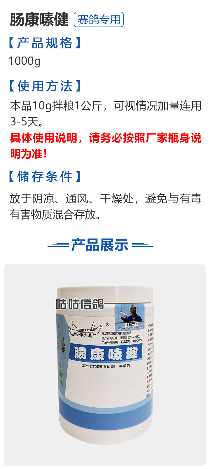 2026线上春展▪满1000-100  -  指定商品:【爆灯】蓝精零 5克×10包 ;【爆灯】鸽滴威 5克×10包 ;【爆灯】莎门停 5克×10包 ;【爆灯】崇威灵 5克×10包 体内虫;【爆灯】益南混甘 5克×10包 ;【爆灯】回利球 5克×10包 ;【心连心】滴莎 10克×6袋;【爆灯】乎滴亢 5克×10包 ;【爆灯】超浓缩喜乐菌 500毫升 ;【心连心】球莎 10克×6袋 ;【爆灯】维诺护肝精 250毫升 ;【爆灯】虱螨体虫清 500毫升 ;【心连心】呼畅 10克×6袋 ;【爆灯】球可定 100毫升 ;【爆灯】复合预混合饲料Ⅱ维益菌 227克 ;【心连心】瘟痢停 10克×6袋 ;【爆灯】肠道宝 500克 ;【心连心】莎J净 10克×6袋 ;【心连心】鸽C净 10克×6袋 ;【顶峰】复合菌(胶囊)100粒 ;【顶峰】复合菌(粉剂) 280克 ;【顶峰】能量钙(浓缩型) 400毫升 ;【爱丽丝】喉痢清(加强型) 60粒(胶囊) ;【顶峰】能量钙(浓缩型) 2.5升 ;【爱丽丝】衣元净 60粒(胶囊);【施德福】特号六合一混合剂 5克×10包 ;【爱丽丝】毛滴虫净 60粒(胶囊);【爱丽丝】刹杆净(原沙门氏菌大肠杆菌杀星) 60粒(胶囊);【施德福】口服苗A 5克×10包 ;【爱丽丝】肝精 5克×10袋 ;【施德福】卡尼丁肝肾液 250毫升 ;【施德福】精华液 250毫升 ;【爱丽丝】呼吸道特号 60粒 (胶囊) ;【施德福】口服苗液 25毫升 ;【天津版稳拿】稳拿一号(呼吸道) 2公克×8袋 呼吸道;【天津版稳拿】稳拿二号(消化肠道) 3公克×8袋 肠道;【天津版稳拿】稳拿七号(毛滴虫) 2公克×8袋 毛滴虫;【上海龙园】魔宝 1000克 袋装;【上海龙园】维他肝精 250毫升 ;【上海龙园】鸽绿茶 100克 ;【上海龙园】浴宝 200克 ;【上海龙园】小育雏宝胶囊 100粒 ;【上海龙园】菌乐多 500毫升;【先锋】呼喉霸 5克×10包;【先锋】依原净 5克×10包 ;【西安凯鸽】客线枉 30毫升;【西安凯鸽】至樽独霸 100克;【西安凯鸽】至樽独霸 60粒(胶囊);【爆灯】T5鸽疫快克 20毫升 ;【西安凯鸽】果蔬营养丸 700克;【西安凯鸽】果蔬营养丸 2000克;【天津版稳拿】稳拿三号 2克×8包 球虫;【天津版稳拿】幼鸽夺霸 100粒 ;【天津版稳拿】幼鸽夺霸 300粒 ;【天津版稳拿】比赛夺霸3号 100粒 ;【天津版稳拿】比赛夺霸3号 300粒 ;【心连心】毛莎胶囊 60粒 ;【心连心】球锋胶囊 60粒 ;【天津版稳拿】虫清 3克×8包 体内虫;【心连心】呼畅 60粒(胶囊) ;【天津版稳拿】喉清 3克×8包 支原体/衣原体/念珠菌/呼吸道;【心连心】瘟痢停 60粒(胶囊) ;【天津版稳拿】粮霉清 200克 ;【心连心】莎J净胶囊 60粒 ;【爆灯】一滴灵 10毫升 单眼伤风;【爆灯】呼鼻灵 10毫升 ;【心连心】鸽C净 60粒(胶囊) ;【爆灯】维诺速补 100粒 ;【爆灯】老鸟回春丸 100粒 ;【心连心】毛呼二合一 10克×6袋;【爆灯】老鸟生子丸 100粒;【爆灯】依圆青 5克×10袋 ;【心连心】百消砃 100丸 ;【爆灯】泰力福 5克×10袋 呼吸道;【心连心】百消潵 150克 ;【爆灯】卫康防火墙 500毫升 ;【爆灯】矿力高峰液 250毫升;【心连心】独利双清 250毫升 ;【心连心】二合一啤酒酵母粉 600克 ;【爆灯】钙力奇 250毫升;【心连心】益酶多维电解质 150克 ;【爆灯】本草亢独饮 250毫升 ;【心连心】强化肝精(粉剂) 10克×10袋 ;【先锋】呼爽先锋 5克×10包 ;【心连心】强化肝精浓缩液 120毫升 ;【先锋】呼毛二合一 5克×10包 ;李猛推荐【爆灯】鸽疫康 500毫升 ;【先锋】先锋三合一 5克×10包 球虫/毛滴虫/沙门氏;【心连心】生物多肽矿物磷钙粉 500克 ;【先锋】净滴先锋 5克×10包;【心连心】AM活菌浓缩液 500毫升 ;【先锋】不脱翼 5毫升;李猛推荐【爆灯】维诺保 100毫升 ;【心连心】多效营养精华素 1680克 ;【心连心】AD3磷钙液 250毫升 ;【爆灯】超能素5000 1500克袋装 ;【心连心】瘟痢停丸 60丸 ;【爆灯】复合预混合饲料/6合1能量营养素 250克 ;【心连心】优益活菌液 1000毫升 ;【爱丽丝】喉痢清 5克×10袋 ;【上海龙园】种鸽宝 300粒 ;【上海龙园】种鸽粉 200克 ;【爱丽丝】衣原净2代 5克×10袋 ;【上海龙园】一喷灵 25毫升 ;【爱丽丝】毛滴净 5克×10袋 ;【上海龙园】绿色精 500毫升;【爱丽丝】刹杆净(原沙门氏菌大肠杆菌杀星) 5克×10袋 ;【上海龙园】营养蒜油 200毫升;【爱丽丝】呼吸道特号 5克×10袋 ;【上海龙园】康飞力 200毫升;【顶峰】保比液 100毫升 ;【上海龙园】赛神滴眼液 10毫升 ;【爱丽丝】毛球二合一 5克×10袋 ;【上海龙园】一滴灵 10毫升 单眼伤风;【爱丽丝】毛滴虫球虫二合一 60粒 ;【上海龙园】泻必停 5克×10袋 ;【顶峰】牛至香酚保比液 500毫升 ;【上海龙园】喉必清 5克×10袋;【顶峰】商寒停 100片 伤寒停;【顶峰】能量钙 300克 ;【上海龙园】抗球粉 5克×10包;【爱丽丝】稳肠赢 100克 ;【顶峰】全能电解质 500毫升 ;【上海龙园】抗滴粉 5克×10包 ;【顶峰】维他酵母粉 800克 ;【上海龙园】电解质维生素C粉 (甲7.5克+乙12.5克)×10组盒;【上海龙园】小育雏宝片剂 100片;【上海龙园】大育雏宝胶囊 500粒;【上海龙园】嗉囊清 100毫升;【上海龙园】大育雏宝片剂 500片;【上海龙园】粒粒成 100粒;【上海龙园】克虫宝 80粒;【上海龙园】红茶 100克;【上海龙园】强健宝 750克;【凡赛尔】欧乐强 鸽浴粉 1000克 天然沐浴圣品/消除肌肉疲劳/洗澡/洗浴;【爱丽丝】钙磷营养速补 400片;【北斗】雌宝 100粒;【北斗】雄宝 100粒 ;【北斗】克立停 100粒;【北斗】育雏宝 300粒;【天津版稳拿】稳拿五号 3克×8包 单眼伤风;【爆灯】多关秘密武器 30毫升 ;【爆灯】维