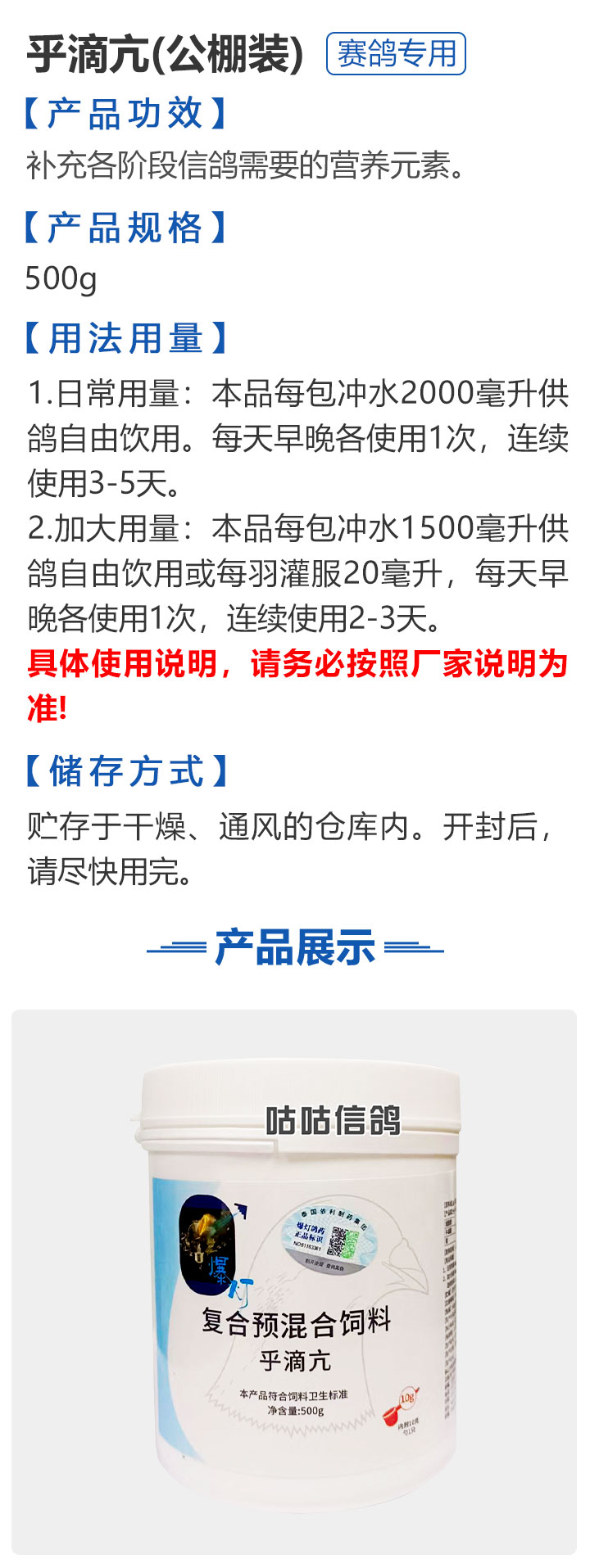 2026线上春展▪6元无门槛  -  指定商品:【爆灯】蓝精零 5克×10包 ;【爆灯】鸽滴威 5克×10包 ;【爆灯】莎门停 5克×10包 ;【爆灯】崇威灵 5克×10包 体内虫;【爆灯】益南混甘 5克×10包 ;【爆灯】回利球 5克×10包 ;【心连心】滴莎 10克×6袋;【爆灯】乎滴亢 5克×10包 ;【爆灯】超浓缩喜乐菌 500毫升 ;【心连心】球莎 10克×6袋 ;【爆灯】维诺护肝精 250毫升 ;【爆灯】虱螨体虫清 500毫升 ;【心连心】呼畅 10克×6袋 ;【爆灯】球可定 100毫升 ;【爆灯】复合预混合饲料Ⅱ维益菌 227克 ;【心连心】瘟痢停 10克×6袋 ;【爆灯】肠道宝 500克 ;【心连心】莎J净 10克×6袋 ;【心连心】鸽C净 10克×6袋 ;【顶峰】复合菌(胶囊)100粒 ;【顶峰】复合菌(粉剂) 280克 ;【顶峰】能量钙(浓缩型) 400毫升 ;【爱丽丝】喉痢清(加强型) 60粒(胶囊) ;【顶峰】能量钙(浓缩型) 2.5升 ;【爱丽丝】衣元净 60粒(胶囊);【施德福】特号六合一混合剂 5克×10包 ;【爱丽丝】毛滴虫净 60粒(胶囊);【爱丽丝】刹杆净(原沙门氏菌大肠杆菌杀星) 60粒(胶囊);【施德福】口服苗A 5克×10包 ;【爱丽丝】肝精 5克×10袋 ;【施德福】卡尼丁肝肾液 250毫升 ;【施德福】精华液 250毫升 ;【爱丽丝】呼吸道特号 60粒 (胶囊) ;【施德福】口服苗液 25毫升 ;【天津版稳拿】稳拿一号(呼吸道) 2公克×8袋 呼吸道;【天津版稳拿】稳拿二号(消化肠道) 3公克×8袋 肠道;【天津版稳拿】稳拿七号(毛滴虫) 2公克×8袋 毛滴虫;【上海龙园】魔宝 1000克 袋装;【上海龙园】维他肝精 250毫升 ;【上海龙园】鸽绿茶 100克 ;【上海龙园】浴宝 200克 ;【上海龙园】小育雏宝胶囊 100粒 ;【上海龙园】菌乐多 500毫升;【先锋】呼喉霸 5克×10包;【先锋】依原净 5克×10包 ;【西安凯鸽】客线枉 30毫升;【西安凯鸽】至樽独霸 100克;【西安凯鸽】至樽独霸 60粒(胶囊);【爆灯】T5鸽疫快克 20毫升 ;【西安凯鸽】果蔬营养丸 700克;【西安凯鸽】果蔬营养丸 2000克;【天津版稳拿】稳拿三号 2克×8包 球虫;【天津版稳拿】幼鸽夺霸 100粒 ;【天津版稳拿】幼鸽夺霸 300粒 ;【天津版稳拿】比赛夺霸3号 100粒 ;【天津版稳拿】比赛夺霸3号 300粒 ;【心连心】毛莎胶囊 60粒 ;【心连心】球锋胶囊 60粒 ;【天津版稳拿】虫清 3克×8包 体内虫;【心连心】呼畅 60粒(胶囊) ;【天津版稳拿】喉清 3克×8包 支原体/衣原体/念珠菌/呼吸道;【心连心】瘟痢停 60粒(胶囊) ;【天津版稳拿】粮霉清 200克 ;【心连心】莎J净胶囊 60粒 ;【爆灯】一滴灵 10毫升 单眼伤风;【爆灯】呼鼻灵 10毫升 ;【心连心】鸽C净 60粒(胶囊) ;【爆灯】维诺速补 100粒 ;【爆灯】老鸟回春丸 100粒 ;【心连心】毛呼二合一 10克×6袋;【爆灯】老鸟生子丸 100粒;【爆灯】依圆青 5克×10袋 ;【心连心】百消砃 100丸 ;【爆灯】泰力福 5克×10袋 呼吸道;【心连心】百消潵 150克 ;【爆灯】卫康防火墙 500毫升 ;【爆灯】矿力高峰液 250毫升;【心连心】独利双清 250毫升 ;【心连心】二合一啤酒酵母粉 600克 ;【爆灯】钙力奇 250毫升;【心连心】益酶多维电解质 150克 ;【爆灯】本草亢独饮 250毫升 ;【心连心】强化肝精(粉剂) 10克×10袋 ;【先锋】呼爽先锋 5克×10包 ;【心连心】强化肝精浓缩液 120毫升 ;【先锋】呼毛二合一 5克×10包 ;李猛推荐【爆灯】鸽疫康 500毫升 ;【先锋】先锋三合一 5克×10包 球虫/毛滴虫/沙门氏;【心连心】生物多肽矿物磷钙粉 500克 ;【先锋】净滴先锋 5克×10包;【心连心】AM活菌浓缩液 500毫升 ;【先锋】不脱翼 5毫升;李猛推荐【爆灯】维诺保 100毫升 ;【心连心】多效营养精华素 1680克 ;【心连心】AD3磷钙液 250毫升 ;【爆灯】超能素5000 1500克袋装 ;【心连心】瘟痢停丸 60丸 ;【爆灯】复合预混合饲料/6合1能量营养素 250克 ;【心连心】优益活菌液 1000毫升 ;【爱丽丝】喉痢清 5克×10袋 ;【上海龙园】种鸽宝 300粒 ;【上海龙园】种鸽粉 200克 ;【爱丽丝】衣原净2代 5克×10袋 ;【上海龙园】一喷灵 25毫升 ;【爱丽丝】毛滴净 5克×10袋 ;【上海龙园】绿色精 500毫升;【爱丽丝】刹杆净(原沙门氏菌大肠杆菌杀星) 5克×10袋 ;【上海龙园】营养蒜油 200毫升;【爱丽丝】呼吸道特号 5克×10袋 ;【上海龙园】康飞力 200毫升;【顶峰】保比液 100毫升 ;【上海龙园】赛神滴眼液 10毫升 ;【爱丽丝】毛球二合一 5克×10袋 ;【上海龙园】一滴灵 10毫升 单眼伤风;【爱丽丝】毛滴虫球虫二合一 60粒 ;【上海龙园】泻必停 5克×10袋 ;【顶峰】牛至香酚保比液 500毫升 ;【上海龙园】喉必清 5克×10袋;【顶峰】商寒停 100片 伤寒停;【顶峰】能量钙 300克 ;【上海龙园】抗球粉 5克×10包;【爱丽丝】稳肠赢 100克 ;【顶峰】全能电解质 500毫升 ;【上海龙园】抗滴粉 5克×10包 ;【顶峰】维他酵母粉 800克 ;【上海龙园】电解质维生素C粉 (甲7.5克+乙12.5克)×10组盒;【上海龙园】小育雏宝片剂 100片;【上海龙园】大育雏宝胶囊 500粒;【上海龙园】嗉囊清 100毫升;【上海龙园】大育雏宝片剂 500片;【上海龙园】粒粒成 100粒;【上海龙园】克虫宝 80粒;【上海龙园】红茶 100克;【上海龙园】强健宝 750克;【凡赛尔】欧乐强 鸽浴粉 1000克 天然沐浴圣品/消除肌肉疲劳/洗澡/洗浴;【爱丽丝】钙磷营养速补 400片;【北斗】雌宝 100粒;【北斗】雄宝 100粒 ;【北斗】克立停 100粒;【北斗】育雏宝 300粒;【天津版稳拿】稳拿五号 3克×8包 单眼伤风;【爆灯】多关秘密武器 30毫升 ;【爆灯】