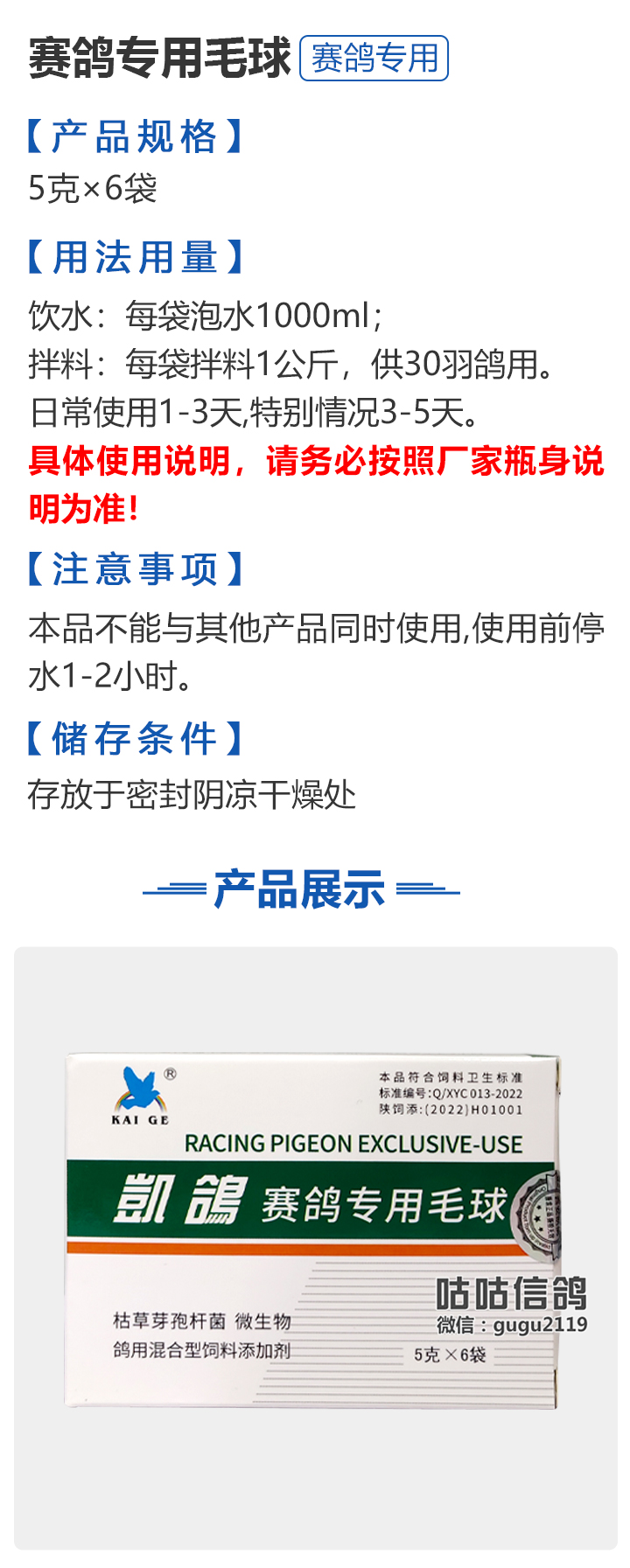 【西安凯鸽】赛鸽专用毛球 5克×6袋