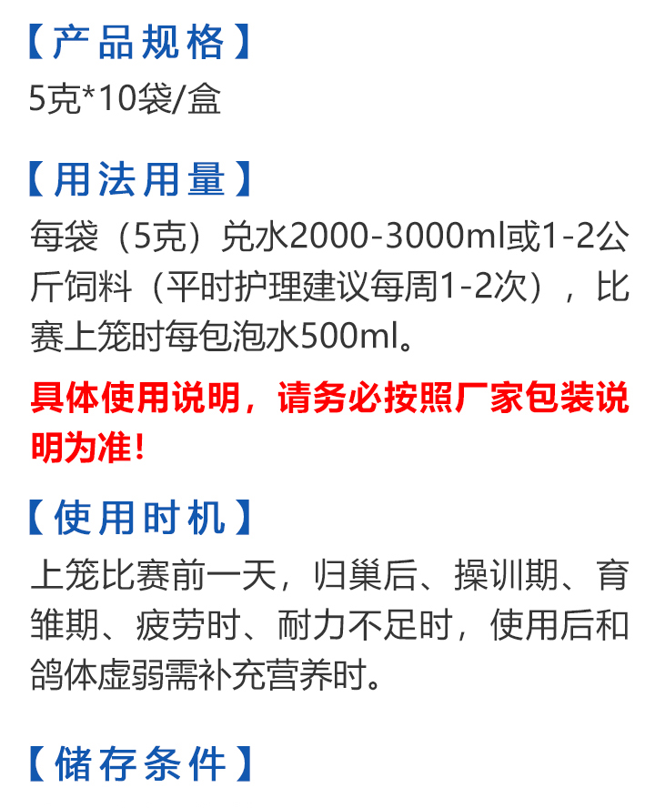 2026线上春展▪6元无门槛  -  指定商品:【爆灯】蓝精零 5克×10包 ;【爆灯】鸽滴威 5克×10包 ;【爆灯】莎门停 5克×10包 ;【爆灯】崇威灵 5克×10包 体内虫;【爆灯】益南混甘 5克×10包 ;【爆灯】回利球 5克×10包 ;【心连心】滴莎 10克×6袋;【爆灯】乎滴亢 5克×10包 ;【爆灯】超浓缩喜乐菌 500毫升 ;【心连心】球莎 10克×6袋 ;【爆灯】维诺护肝精 250毫升 ;【爆灯】虱螨体虫清 500毫升 ;【心连心】呼畅 10克×6袋 ;【爆灯】球可定 100毫升 ;【爆灯】复合预混合饲料Ⅱ维益菌 227克 ;【心连心】瘟痢停 10克×6袋 ;【爆灯】肠道宝 500克 ;【心连心】莎J净 10克×6袋 ;【心连心】鸽C净 10克×6袋 ;【顶峰】复合菌(胶囊)100粒 ;【顶峰】复合菌(粉剂) 280克 ;【顶峰】能量钙(浓缩型) 400毫升 ;【爱丽丝】喉痢清(加强型) 60粒(胶囊) ;【顶峰】能量钙(浓缩型) 2.5升 ;【爱丽丝】衣元净 60粒(胶囊);【施德福】特号六合一混合剂 5克×10包 ;【爱丽丝】毛滴虫净 60粒(胶囊);【爱丽丝】刹杆净(原沙门氏菌大肠杆菌杀星) 60粒(胶囊);【施德福】口服苗A 5克×10包 ;【爱丽丝】肝精 5克×10袋 ;【施德福】卡尼丁肝肾液 250毫升 ;【施德福】精华液 250毫升 ;【爱丽丝】呼吸道特号 60粒 (胶囊) ;【施德福】口服苗液 25毫升 ;【天津版稳拿】稳拿一号(呼吸道) 2公克×8袋 呼吸道;【天津版稳拿】稳拿二号(消化肠道) 3公克×8袋 肠道;【天津版稳拿】稳拿七号(毛滴虫) 2公克×8袋 毛滴虫;【上海龙园】魔宝 1000克 袋装;【上海龙园】维他肝精 250毫升 ;【上海龙园】鸽绿茶 100克 ;【上海龙园】浴宝 200克 ;【上海龙园】小育雏宝胶囊 100粒 ;【上海龙园】菌乐多 500毫升;【先锋】呼喉霸 5克×10包;【先锋】依原净 5克×10包 ;【西安凯鸽】客线枉 30毫升;【西安凯鸽】至樽独霸 100克;【西安凯鸽】至樽独霸 60粒(胶囊);【爆灯】T5鸽疫快克 20毫升 ;【西安凯鸽】果蔬营养丸 700克;【西安凯鸽】果蔬营养丸 2000克;【天津版稳拿】稳拿三号 2克×8包 球虫;【天津版稳拿】幼鸽夺霸 100粒 ;【天津版稳拿】幼鸽夺霸 300粒 ;【天津版稳拿】比赛夺霸3号 100粒 ;【天津版稳拿】比赛夺霸3号 300粒 ;【心连心】毛莎胶囊 60粒 ;【心连心】球锋胶囊 60粒 ;【天津版稳拿】虫清 3克×8包 体内虫;【心连心】呼畅 60粒(胶囊) ;【天津版稳拿】喉清 3克×8包 支原体/衣原体/念珠菌/呼吸道;【心连心】瘟痢停 60粒(胶囊) ;【天津版稳拿】粮霉清 200克 ;【心连心】莎J净胶囊 60粒 ;【爆灯】一滴灵 10毫升 单眼伤风;【爆灯】呼鼻灵 10毫升 ;【心连心】鸽C净 60粒(胶囊) ;【爆灯】维诺速补 100粒 ;【爆灯】老鸟回春丸 100粒 ;【心连心】毛呼二合一 10克×6袋;【爆灯】老鸟生子丸 100粒;【爆灯】依圆青 5克×10袋 ;【心连心】百消砃 100丸 ;【爆灯】泰力福 5克×10袋 呼吸道;【心连心】百消潵 150克 ;【爆灯】卫康防火墙 500毫升 ;【爆灯】矿力高峰液 250毫升;【心连心】独利双清 250毫升 ;【心连心】二合一啤酒酵母粉 600克 ;【爆灯】钙力奇 250毫升;【心连心】益酶多维电解质 150克 ;【爆灯】本草亢独饮 250毫升 ;【心连心】强化肝精(粉剂) 10克×10袋 ;【先锋】呼爽先锋 5克×10包 ;【心连心】强化肝精浓缩液 120毫升 ;【先锋】呼毛二合一 5克×10包 ;李猛推荐【爆灯】鸽疫康 500毫升 ;【先锋】先锋三合一 5克×10包 球虫/毛滴虫/沙门氏;【心连心】生物多肽矿物磷钙粉 500克 ;【先锋】净滴先锋 5克×10包;【心连心】AM活菌浓缩液 500毫升 ;【先锋】不脱翼 5毫升;李猛推荐【爆灯】维诺保 100毫升 ;【心连心】多效营养精华素 1680克 ;【心连心】AD3磷钙液 250毫升 ;【爆灯】超能素5000 1500克袋装 ;【心连心】瘟痢停丸 60丸 ;【爆灯】复合预混合饲料/6合1能量营养素 250克 ;【心连心】优益活菌液 1000毫升 ;【爱丽丝】喉痢清 5克×10袋 ;【上海龙园】种鸽宝 300粒 ;【上海龙园】种鸽粉 200克 ;【爱丽丝】衣原净2代 5克×10袋 ;【上海龙园】一喷灵 25毫升 ;【爱丽丝】毛滴净 5克×10袋 ;【上海龙园】绿色精 500毫升;【爱丽丝】刹杆净(原沙门氏菌大肠杆菌杀星) 5克×10袋 ;【上海龙园】营养蒜油 200毫升;【爱丽丝】呼吸道特号 5克×10袋 ;【上海龙园】康飞力 200毫升;【顶峰】保比液 100毫升 ;【上海龙园】赛神滴眼液 10毫升 ;【爱丽丝】毛球二合一 5克×10袋 ;【上海龙园】一滴灵 10毫升 单眼伤风;【爱丽丝】毛滴虫球虫二合一 60粒 ;【上海龙园】泻必停 5克×10袋 ;【顶峰】牛至香酚保比液 500毫升 ;【上海龙园】喉必清 5克×10袋;【顶峰】商寒停 100片 伤寒停;【顶峰】能量钙 300克 ;【上海龙园】抗球粉 5克×10包;【爱丽丝】稳肠赢 100克 ;【顶峰】全能电解质 500毫升 ;【上海龙园】抗滴粉 5克×10包 ;【顶峰】维他酵母粉 800克 ;【上海龙园】电解质维生素C粉 (甲7.5克+乙12.5克)×10组盒;【上海龙园】小育雏宝片剂 100片;【上海龙园】大育雏宝胶囊 500粒;【上海龙园】嗉囊清 100毫升;【上海龙园】大育雏宝片剂 500片;【上海龙园】粒粒成 100粒;【上海龙园】克虫宝 80粒;【上海龙园】红茶 100克;【上海龙园】强健宝 750克;【凡赛尔】欧乐强 鸽浴粉 1000克 天然沐浴圣品/消除肌肉疲劳/洗澡/洗浴;【爱丽丝】钙磷营养速补 400片;【北斗】雌宝 100粒;【北斗】雄宝 100粒 ;【北斗】克立停 100粒;【北斗】育雏宝 300粒;【天津版稳拿】稳拿五号 3克×8包 单眼伤风;【爆灯】多关秘密武器 30毫升 ;【爆灯】