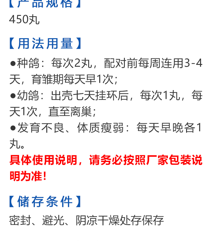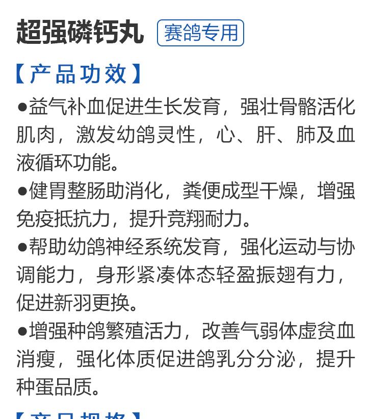 2026线上春展▪6元无门槛  -  指定商品:【爆灯】蓝精零 5克×10包 ;【爆灯】鸽滴威 5克×10包 ;【爆灯】莎门停 5克×10包 ;【爆灯】崇威灵 5克×10包 体内虫;【爆灯】益南混甘 5克×10包 ;【爆灯】回利球 5克×10包 ;【心连心】滴莎 10克×6袋;【爆灯】乎滴亢 5克×10包 ;【爆灯】超浓缩喜乐菌 500毫升 ;【心连心】球莎 10克×6袋 ;【爆灯】维诺护肝精 250毫升 ;【爆灯】虱螨体虫清 500毫升 ;【心连心】呼畅 10克×6袋 ;【爆灯】球可定 100毫升 ;【爆灯】复合预混合饲料Ⅱ维益菌 227克 ;【心连心】瘟痢停 10克×6袋 ;【爆灯】肠道宝 500克 ;【心连心】莎J净 10克×6袋 ;【心连心】鸽C净 10克×6袋 ;【顶峰】复合菌(胶囊)100粒 ;【顶峰】复合菌(粉剂) 280克 ;【顶峰】能量钙(浓缩型) 400毫升 ;【爱丽丝】喉痢清(加强型) 60粒(胶囊) ;【顶峰】能量钙(浓缩型) 2.5升 ;【爱丽丝】衣元净 60粒(胶囊);【施德福】特号六合一混合剂 5克×10包 ;【爱丽丝】毛滴虫净 60粒(胶囊);【爱丽丝】刹杆净(原沙门氏菌大肠杆菌杀星) 60粒(胶囊);【施德福】口服苗A 5克×10包 ;【爱丽丝】肝精 5克×10袋 ;【施德福】卡尼丁肝肾液 250毫升 ;【施德福】精华液 250毫升 ;【爱丽丝】呼吸道特号 60粒 (胶囊) ;【施德福】口服苗液 25毫升 ;【天津版稳拿】稳拿一号(呼吸道) 2公克×8袋 呼吸道;【天津版稳拿】稳拿二号(消化肠道) 3公克×8袋 肠道;【天津版稳拿】稳拿七号(毛滴虫) 2公克×8袋 毛滴虫;【上海龙园】魔宝 1000克 袋装;【上海龙园】维他肝精 250毫升 ;【上海龙园】鸽绿茶 100克 ;【上海龙园】浴宝 200克 ;【上海龙园】小育雏宝胶囊 100粒 ;【上海龙园】菌乐多 500毫升;【先锋】呼喉霸 5克×10包;【先锋】依原净 5克×10包 ;【西安凯鸽】客线枉 30毫升;【西安凯鸽】至樽独霸 100克;【西安凯鸽】至樽独霸 60粒(胶囊);【爆灯】T5鸽疫快克 20毫升 ;【西安凯鸽】果蔬营养丸 700克;【西安凯鸽】果蔬营养丸 2000克;【天津版稳拿】稳拿三号 2克×8包 球虫;【天津版稳拿】幼鸽夺霸 100粒 ;【天津版稳拿】幼鸽夺霸 300粒 ;【天津版稳拿】比赛夺霸3号 100粒 ;【天津版稳拿】比赛夺霸3号 300粒 ;【心连心】毛莎胶囊 60粒 ;【心连心】球锋胶囊 60粒 ;【天津版稳拿】虫清 3克×8包 体内虫;【心连心】呼畅 60粒(胶囊) ;【天津版稳拿】喉清 3克×8包 支原体/衣原体/念珠菌/呼吸道;【心连心】瘟痢停 60粒(胶囊) ;【天津版稳拿】粮霉清 200克 ;【心连心】莎J净胶囊 60粒 ;【爆灯】一滴灵 10毫升 单眼伤风;【爆灯】呼鼻灵 10毫升 ;【心连心】鸽C净 60粒(胶囊) ;【爆灯】维诺速补 100粒 ;【爆灯】老鸟回春丸 100粒 ;【心连心】毛呼二合一 10克×6袋;【爆灯】老鸟生子丸 100粒;【爆灯】依圆青 5克×10袋 ;【心连心】百消砃 100丸 ;【爆灯】泰力福 5克×10袋 呼吸道;【心连心】百消潵 150克 ;【爆灯】卫康防火墙 500毫升 ;【爆灯】矿力高峰液 250毫升;【心连心】独利双清 250毫升 ;【心连心】二合一啤酒酵母粉 600克 ;【爆灯】钙力奇 250毫升;【心连心】益酶多维电解质 150克 ;【爆灯】本草亢独饮 250毫升 ;【心连心】强化肝精(粉剂) 10克×10袋 ;【先锋】呼爽先锋 5克×10包 ;【心连心】强化肝精浓缩液 120毫升 ;【先锋】呼毛二合一 5克×10包 ;李猛推荐【爆灯】鸽疫康 500毫升 ;【先锋】先锋三合一 5克×10包 球虫/毛滴虫/沙门氏;【心连心】生物多肽矿物磷钙粉 500克 ;【先锋】净滴先锋 5克×10包;【心连心】AM活菌浓缩液 500毫升 ;【先锋】不脱翼 5毫升;李猛推荐【爆灯】维诺保 100毫升 ;【心连心】多效营养精华素 1680克 ;【心连心】AD3磷钙液 250毫升 ;【爆灯】超能素5000 1500克袋装 ;【心连心】瘟痢停丸 60丸 ;【爆灯】复合预混合饲料/6合1能量营养素 250克 ;【心连心】优益活菌液 1000毫升 ;【爱丽丝】喉痢清 5克×10袋 ;【上海龙园】种鸽宝 300粒 ;【上海龙园】种鸽粉 200克 ;【爱丽丝】衣原净2代 5克×10袋 ;【上海龙园】一喷灵 25毫升 ;【爱丽丝】毛滴净 5克×10袋 ;【上海龙园】绿色精 500毫升;【爱丽丝】刹杆净(原沙门氏菌大肠杆菌杀星) 5克×10袋 ;【上海龙园】营养蒜油 200毫升;【爱丽丝】呼吸道特号 5克×10袋 ;【上海龙园】康飞力 200毫升;【顶峰】保比液 100毫升 ;【上海龙园】赛神滴眼液 10毫升 ;【爱丽丝】毛球二合一 5克×10袋 ;【上海龙园】一滴灵 10毫升 单眼伤风;【爱丽丝】毛滴虫球虫二合一 60粒 ;【上海龙园】泻必停 5克×10袋 ;【顶峰】牛至香酚保比液 500毫升 ;【上海龙园】喉必清 5克×10袋;【顶峰】商寒停 100片 伤寒停;【顶峰】能量钙 300克 ;【上海龙园】抗球粉 5克×10包;【爱丽丝】稳肠赢 100克 ;【顶峰】全能电解质 500毫升 ;【上海龙园】抗滴粉 5克×10包 ;【顶峰】维他酵母粉 800克 ;【上海龙园】电解质维生素C粉 (甲7.5克+乙12.5克)×10组盒;【上海龙园】小育雏宝片剂 100片;【上海龙园】大育雏宝胶囊 500粒;【上海龙园】嗉囊清 100毫升;【上海龙园】大育雏宝片剂 500片;【上海龙园】粒粒成 100粒;【上海龙园】克虫宝 80粒;【上海龙园】红茶 100克;【上海龙园】强健宝 750克;【凡赛尔】欧乐强 鸽浴粉 1000克 天然沐浴圣品/消除肌肉疲劳/洗澡/洗浴;【爱丽丝】钙磷营养速补 400片;【北斗】雌宝 100粒;【北斗】雄宝 100粒 ;【北斗】克立停 100粒;【北斗】育雏宝 300粒;【天津版稳拿】稳拿五号 3克×8包 单眼伤风;【爆灯】多关秘密武器 30毫升 ;【爆灯】