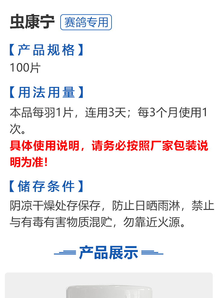 2026线上春展▪满1000-100  -  指定商品:【爆灯】蓝精零 5克×10包 ;【爆灯】鸽滴威 5克×10包 ;【爆灯】莎门停 5克×10包 ;【爆灯】崇威灵 5克×10包 体内虫;【爆灯】益南混甘 5克×10包 ;【爆灯】回利球 5克×10包 ;【心连心】滴莎 10克×6袋;【爆灯】乎滴亢 5克×10包 ;【爆灯】超浓缩喜乐菌 500毫升 ;【心连心】球莎 10克×6袋 ;【爆灯】维诺护肝精 250毫升 ;【爆灯】虱螨体虫清 500毫升 ;【心连心】呼畅 10克×6袋 ;【爆灯】球可定 100毫升 ;【爆灯】复合预混合饲料Ⅱ维益菌 227克 ;【心连心】瘟痢停 10克×6袋 ;【爆灯】肠道宝 500克 ;【心连心】莎J净 10克×6袋 ;【心连心】鸽C净 10克×6袋 ;【顶峰】复合菌(胶囊)100粒 ;【顶峰】复合菌(粉剂) 280克 ;【顶峰】能量钙(浓缩型) 400毫升 ;【爱丽丝】喉痢清(加强型) 60粒(胶囊) ;【顶峰】能量钙(浓缩型) 2.5升 ;【爱丽丝】衣元净 60粒(胶囊);【施德福】特号六合一混合剂 5克×10包 ;【爱丽丝】毛滴虫净 60粒(胶囊);【爱丽丝】刹杆净(原沙门氏菌大肠杆菌杀星) 60粒(胶囊);【施德福】口服苗A 5克×10包 ;【爱丽丝】肝精 5克×10袋 ;【施德福】卡尼丁肝肾液 250毫升 ;【施德福】精华液 250毫升 ;【爱丽丝】呼吸道特号 60粒 (胶囊) ;【施德福】口服苗液 25毫升 ;【天津版稳拿】稳拿一号(呼吸道) 2公克×8袋 呼吸道;【天津版稳拿】稳拿二号(消化肠道) 3公克×8袋 肠道;【天津版稳拿】稳拿七号(毛滴虫) 2公克×8袋 毛滴虫;【上海龙园】魔宝 1000克 袋装;【上海龙园】维他肝精 250毫升 ;【上海龙园】鸽绿茶 100克 ;【上海龙园】浴宝 200克 ;【上海龙园】小育雏宝胶囊 100粒 ;【上海龙园】菌乐多 500毫升;【先锋】呼喉霸 5克×10包;【先锋】依原净 5克×10包 ;【西安凯鸽】客线枉 30毫升;【西安凯鸽】至樽独霸 100克;【西安凯鸽】至樽独霸 60粒(胶囊);【爆灯】T5鸽疫快克 20毫升 ;【西安凯鸽】果蔬营养丸 700克;【西安凯鸽】果蔬营养丸 2000克;【天津版稳拿】稳拿三号 2克×8包 球虫;【天津版稳拿】幼鸽夺霸 100粒 ;【天津版稳拿】幼鸽夺霸 300粒 ;【天津版稳拿】比赛夺霸3号 100粒 ;【天津版稳拿】比赛夺霸3号 300粒 ;【心连心】毛莎胶囊 60粒 ;【心连心】球锋胶囊 60粒 ;【天津版稳拿】虫清 3克×8包 体内虫;【心连心】呼畅 60粒(胶囊) ;【天津版稳拿】喉清 3克×8包 支原体/衣原体/念珠菌/呼吸道;【心连心】瘟痢停 60粒(胶囊) ;【天津版稳拿】粮霉清 200克 ;【心连心】莎J净胶囊 60粒 ;【爆灯】一滴灵 10毫升 单眼伤风;【爆灯】呼鼻灵 10毫升 ;【心连心】鸽C净 60粒(胶囊) ;【爆灯】维诺速补 100粒 ;【爆灯】老鸟回春丸 100粒 ;【心连心】毛呼二合一 10克×6袋;【爆灯】老鸟生子丸 100粒;【爆灯】依圆青 5克×10袋 ;【心连心】百消砃 100丸 ;【爆灯】泰力福 5克×10袋 呼吸道;【心连心】百消潵 150克 ;【爆灯】卫康防火墙 500毫升 ;【爆灯】矿力高峰液 250毫升;【心连心】独利双清 250毫升 ;【心连心】二合一啤酒酵母粉 600克 ;【爆灯】钙力奇 250毫升;【心连心】益酶多维电解质 150克 ;【爆灯】本草亢独饮 250毫升 ;【心连心】强化肝精(粉剂) 10克×10袋 ;【先锋】呼爽先锋 5克×10包 ;【心连心】强化肝精浓缩液 120毫升 ;【先锋】呼毛二合一 5克×10包 ;李猛推荐【爆灯】鸽疫康 500毫升 ;【先锋】先锋三合一 5克×10包 球虫/毛滴虫/沙门氏;【心连心】生物多肽矿物磷钙粉 500克 ;【先锋】净滴先锋 5克×10包;【心连心】AM活菌浓缩液 500毫升 ;【先锋】不脱翼 5毫升;李猛推荐【爆灯】维诺保 100毫升 ;【心连心】多效营养精华素 1680克 ;【心连心】AD3磷钙液 250毫升 ;【爆灯】超能素5000 1500克袋装 ;【心连心】瘟痢停丸 60丸 ;【爆灯】复合预混合饲料/6合1能量营养素 250克 ;【心连心】优益活菌液 1000毫升 ;【爱丽丝】喉痢清 5克×10袋 ;【上海龙园】种鸽宝 300粒 ;【上海龙园】种鸽粉 200克 ;【爱丽丝】衣原净2代 5克×10袋 ;【上海龙园】一喷灵 25毫升 ;【爱丽丝】毛滴净 5克×10袋 ;【上海龙园】绿色精 500毫升;【爱丽丝】刹杆净(原沙门氏菌大肠杆菌杀星) 5克×10袋 ;【上海龙园】营养蒜油 200毫升;【爱丽丝】呼吸道特号 5克×10袋 ;【上海龙园】康飞力 200毫升;【顶峰】保比液 100毫升 ;【上海龙园】赛神滴眼液 10毫升 ;【爱丽丝】毛球二合一 5克×10袋 ;【上海龙园】一滴灵 10毫升 单眼伤风;【爱丽丝】毛滴虫球虫二合一 60粒 ;【上海龙园】泻必停 5克×10袋 ;【顶峰】牛至香酚保比液 500毫升 ;【上海龙园】喉必清 5克×10袋;【顶峰】商寒停 100片 伤寒停;【顶峰】能量钙 300克 ;【上海龙园】抗球粉 5克×10包;【爱丽丝】稳肠赢 100克 ;【顶峰】全能电解质 500毫升 ;【上海龙园】抗滴粉 5克×10包 ;【顶峰】维他酵母粉 800克 ;【上海龙园】电解质维生素C粉 (甲7.5克+乙12.5克)×10组盒;【上海龙园】小育雏宝片剂 100片;【上海龙园】大育雏宝胶囊 500粒;【上海龙园】嗉囊清 100毫升;【上海龙园】大育雏宝片剂 500片;【上海龙园】粒粒成 100粒;【上海龙园】克虫宝 80粒;【上海龙园】红茶 100克;【上海龙园】强健宝 750克;【凡赛尔】欧乐强 鸽浴粉 1000克 天然沐浴圣品/消除肌肉疲劳/洗澡/洗浴;【爱丽丝】钙磷营养速补 400片;【北斗】雌宝 100粒;【北斗】雄宝 100粒 ;【北斗】克立停 100粒;【北斗】育雏宝 300粒;【天津版稳拿】稳拿五号 3克×8包 单眼伤风;【爆灯】多关秘密武器 30毫升 ;【爆灯】维