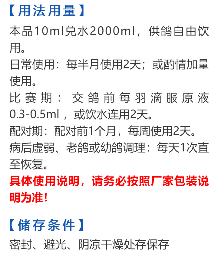 2026线上春展▪满200-10  -  指定商品:【爆灯】蓝精零 5克×10包 ;【爆灯】鸽滴威 5克×10包 ;【爆灯】莎门停 5克×10包 ;【爆灯】崇威灵 5克×10包 体内虫;【爆灯】益南混甘 5克×10包 ;【爆灯】回利球 5克×10包 ;【心连心】滴莎 10克×6袋;【爆灯】乎滴亢 5克×10包 ;【爆灯】超浓缩喜乐菌 500毫升 ;【心连心】球莎 10克×6袋 ;【爆灯】维诺护肝精 250毫升 ;【爆灯】虱螨体虫清 500毫升 ;【心连心】呼畅 10克×6袋 ;【爆灯】球可定 100毫升 ;【爆灯】复合预混合饲料Ⅱ维益菌 227克 ;【心连心】瘟痢停 10克×6袋 ;【爆灯】肠道宝 500克 ;【心连心】莎J净 10克×6袋 ;【心连心】鸽C净 10克×6袋 ;【顶峰】复合菌(胶囊)100粒 ;【顶峰】复合菌(粉剂) 280克 ;【顶峰】能量钙(浓缩型) 400毫升 ;【爱丽丝】喉痢清(加强型) 60粒(胶囊) ;【顶峰】能量钙(浓缩型) 2.5升 ;【爱丽丝】衣元净 60粒(胶囊);【施德福】特号六合一混合剂 5克×10包 ;【爱丽丝】毛滴虫净 60粒(胶囊);【爱丽丝】刹杆净(原沙门氏菌大肠杆菌杀星) 60粒(胶囊);【施德福】口服苗A 5克×10包 ;【爱丽丝】肝精 5克×10袋 ;【施德福】卡尼丁肝肾液 250毫升 ;【施德福】精华液 250毫升 ;【爱丽丝】呼吸道特号 60粒 (胶囊) ;【施德福】口服苗液 25毫升 ;【天津版稳拿】稳拿一号(呼吸道) 2公克×8袋 呼吸道;【天津版稳拿】稳拿二号(消化肠道) 3公克×8袋 肠道;【天津版稳拿】稳拿七号(毛滴虫) 2公克×8袋 毛滴虫;【上海龙园】魔宝 1000克 袋装;【上海龙园】维他肝精 250毫升 ;【上海龙园】鸽绿茶 100克 ;【上海龙园】浴宝 200克 ;【上海龙园】小育雏宝胶囊 100粒 ;【上海龙园】菌乐多 500毫升;【先锋】呼喉霸 5克×10包;【先锋】依原净 5克×10包 ;【西安凯鸽】客线枉 30毫升;【西安凯鸽】至樽独霸 100克;【西安凯鸽】至樽独霸 60粒(胶囊);【爆灯】T5鸽疫快克 20毫升 ;【西安凯鸽】果蔬营养丸 700克;【西安凯鸽】果蔬营养丸 2000克;【天津版稳拿】稳拿三号 2克×8包 球虫;【天津版稳拿】幼鸽夺霸 100粒 ;【天津版稳拿】幼鸽夺霸 300粒 ;【天津版稳拿】比赛夺霸3号 100粒 ;【天津版稳拿】比赛夺霸3号 300粒 ;【心连心】毛莎胶囊 60粒 ;【心连心】球锋胶囊 60粒 ;【天津版稳拿】虫清 3克×8包 体内虫;【心连心】呼畅 60粒(胶囊) ;【天津版稳拿】喉清 3克×8包 支原体/衣原体/念珠菌/呼吸道;【心连心】瘟痢停 60粒(胶囊) ;【天津版稳拿】粮霉清 200克 ;【心连心】莎J净胶囊 60粒 ;【爆灯】一滴灵 10毫升 单眼伤风;【爆灯】呼鼻灵 10毫升 ;【心连心】鸽C净 60粒(胶囊) ;【爆灯】维诺速补 100粒 ;【爆灯】老鸟回春丸 100粒 ;【心连心】毛呼二合一 10克×6袋;【爆灯】老鸟生子丸 100粒;【爆灯】依圆青 5克×10袋 ;【心连心】百消砃 100丸 ;【爆灯】泰力福 5克×10袋 呼吸道;【心连心】百消潵 150克 ;【爆灯】卫康防火墙 500毫升 ;【爆灯】矿力高峰液 250毫升;【心连心】独利双清 250毫升 ;【心连心】二合一啤酒酵母粉 600克 ;【爆灯】钙力奇 250毫升;【心连心】益酶多维电解质 150克 ;【爆灯】本草亢独饮 250毫升 ;【心连心】强化肝精(粉剂) 10克×10袋 ;【先锋】呼爽先锋 5克×10包 ;【心连心】强化肝精浓缩液 120毫升 ;【先锋】呼毛二合一 5克×10包 ;李猛推荐【爆灯】鸽疫康 500毫升 ;【先锋】先锋三合一 5克×10包 球虫/毛滴虫/沙门氏;【心连心】生物多肽矿物磷钙粉 500克 ;【先锋】净滴先锋 5克×10包;【心连心】AM活菌浓缩液 500毫升 ;【先锋】不脱翼 5毫升;李猛推荐【爆灯】维诺保 100毫升 ;【心连心】多效营养精华素 1680克 ;【心连心】AD3磷钙液 250毫升 ;【爆灯】超能素5000 1500克袋装 ;【心连心】瘟痢停丸 60丸 ;【爆灯】复合预混合饲料/6合1能量营养素 250克 ;【心连心】优益活菌液 1000毫升 ;【爱丽丝】喉痢清 5克×10袋 ;【上海龙园】种鸽宝 300粒 ;【上海龙园】种鸽粉 200克 ;【爱丽丝】衣原净2代 5克×10袋 ;【上海龙园】一喷灵 25毫升 ;【爱丽丝】毛滴净 5克×10袋 ;【上海龙园】绿色精 500毫升;【爱丽丝】刹杆净(原沙门氏菌大肠杆菌杀星) 5克×10袋 ;【上海龙园】营养蒜油 200毫升;【爱丽丝】呼吸道特号 5克×10袋 ;【上海龙园】康飞力 200毫升;【顶峰】保比液 100毫升 ;【上海龙园】赛神滴眼液 10毫升 ;【爱丽丝】毛球二合一 5克×10袋 ;【上海龙园】一滴灵 10毫升 单眼伤风;【爱丽丝】毛滴虫球虫二合一 60粒 ;【上海龙园】泻必停 5克×10袋 ;【顶峰】牛至香酚保比液 500毫升 ;【上海龙园】喉必清 5克×10袋;【顶峰】商寒停 100片 伤寒停;【顶峰】能量钙 300克 ;【上海龙园】抗球粉 5克×10包;【爱丽丝】稳肠赢 100克 ;【顶峰】全能电解质 500毫升 ;【上海龙园】抗滴粉 5克×10包 ;【顶峰】维他酵母粉 800克 ;【上海龙园】电解质维生素C粉 (甲7.5克+乙12.5克)×10组盒;【上海龙园】小育雏宝片剂 100片;【上海龙园】大育雏宝胶囊 500粒;【上海龙园】嗉囊清 100毫升;【上海龙园】大育雏宝片剂 500片;【上海龙园】粒粒成 100粒;【上海龙园】克虫宝 80粒;【上海龙园】红茶 100克;【上海龙园】强健宝 750克;【凡赛尔】欧乐强 鸽浴粉 1000克 天然沐浴圣品/消除肌肉疲劳/洗澡/洗浴;【爱丽丝】钙磷营养速补 400片;【北斗】雌宝 100粒;【北斗】雄宝 100粒 ;【北斗】克立停 100粒;【北斗】育雏宝 300粒;【天津版稳拿】稳拿五号 3克×8包 单眼伤风;【爆灯】多关秘密武器 30毫升 ;【爆灯】维诺