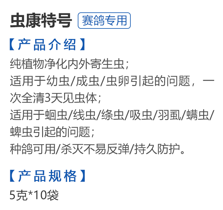 2026线上春展▪满600-40  -  指定商品:【爆灯】蓝精零 5克×10包 ;【爆灯】鸽滴威 5克×10包 ;【爆灯】莎门停 5克×10包 ;【爆灯】崇威灵 5克×10包 体内虫;【爆灯】益南混甘 5克×10包 ;【爆灯】回利球 5克×10包 ;【心连心】滴莎 10克×6袋;【爆灯】乎滴亢 5克×10包 ;【爆灯】超浓缩喜乐菌 500毫升 ;【心连心】球莎 10克×6袋 ;【爆灯】维诺护肝精 250毫升 ;【爆灯】虱螨体虫清 500毫升 ;【心连心】呼畅 10克×6袋 ;【爆灯】球可定 100毫升 ;【爆灯】复合预混合饲料Ⅱ维益菌 227克 ;【心连心】瘟痢停 10克×6袋 ;【爆灯】肠道宝 500克 ;【心连心】莎J净 10克×6袋 ;【心连心】鸽C净 10克×6袋 ;【顶峰】复合菌(胶囊)100粒 ;【顶峰】复合菌(粉剂) 280克 ;【顶峰】能量钙(浓缩型) 400毫升 ;【爱丽丝】喉痢清(加强型) 60粒(胶囊) ;【顶峰】能量钙(浓缩型) 2.5升 ;【爱丽丝】衣元净 60粒(胶囊);【施德福】特号六合一混合剂 5克×10包 ;【爱丽丝】毛滴虫净 60粒(胶囊);【爱丽丝】刹杆净(原沙门氏菌大肠杆菌杀星) 60粒(胶囊);【施德福】口服苗A 5克×10包 ;【爱丽丝】肝精 5克×10袋 ;【施德福】卡尼丁肝肾液 250毫升 ;【施德福】精华液 250毫升 ;【爱丽丝】呼吸道特号 60粒 (胶囊) ;【施德福】口服苗液 25毫升 ;【天津版稳拿】稳拿一号(呼吸道) 2公克×8袋 呼吸道;【天津版稳拿】稳拿二号(消化肠道) 3公克×8袋 肠道;【天津版稳拿】稳拿七号(毛滴虫) 2公克×8袋 毛滴虫;【上海龙园】魔宝 1000克 袋装;【上海龙园】维他肝精 250毫升 ;【上海龙园】鸽绿茶 100克 ;【上海龙园】浴宝 200克 ;【上海龙园】小育雏宝胶囊 100粒 ;【上海龙园】菌乐多 500毫升;【先锋】呼喉霸 5克×10包;【先锋】依原净 5克×10包 ;【西安凯鸽】客线枉 30毫升;【西安凯鸽】至樽独霸 100克;【西安凯鸽】至樽独霸 60粒(胶囊);【爆灯】T5鸽疫快克 20毫升 ;【西安凯鸽】果蔬营养丸 700克;【西安凯鸽】果蔬营养丸 2000克;【天津版稳拿】稳拿三号 2克×8包 球虫;【天津版稳拿】幼鸽夺霸 100粒 ;【天津版稳拿】幼鸽夺霸 300粒 ;【天津版稳拿】比赛夺霸3号 100粒 ;【天津版稳拿】比赛夺霸3号 300粒 ;【心连心】毛莎胶囊 60粒 ;【心连心】球锋胶囊 60粒 ;【天津版稳拿】虫清 3克×8包 体内虫;【心连心】呼畅 60粒(胶囊) ;【天津版稳拿】喉清 3克×8包 支原体/衣原体/念珠菌/呼吸道;【心连心】瘟痢停 60粒(胶囊) ;【天津版稳拿】粮霉清 200克 ;【心连心】莎J净胶囊 60粒 ;【爆灯】一滴灵 10毫升 单眼伤风;【爆灯】呼鼻灵 10毫升 ;【心连心】鸽C净 60粒(胶囊) ;【爆灯】维诺速补 100粒 ;【爆灯】老鸟回春丸 100粒 ;【心连心】毛呼二合一 10克×6袋;【爆灯】老鸟生子丸 100粒;【爆灯】依圆青 5克×10袋 ;【心连心】百消砃 100丸 ;【爆灯】泰力福 5克×10袋 呼吸道;【心连心】百消潵 150克 ;【爆灯】卫康防火墙 500毫升 ;【爆灯】矿力高峰液 250毫升;【心连心】独利双清 250毫升 ;【心连心】二合一啤酒酵母粉 600克 ;【爆灯】钙力奇 250毫升;【心连心】益酶多维电解质 150克 ;【爆灯】本草亢独饮 250毫升 ;【心连心】强化肝精(粉剂) 10克×10袋 ;【先锋】呼爽先锋 5克×10包 ;【心连心】强化肝精浓缩液 120毫升 ;【先锋】呼毛二合一 5克×10包 ;李猛推荐【爆灯】鸽疫康 500毫升 ;【先锋】先锋三合一 5克×10包 球虫/毛滴虫/沙门氏;【心连心】生物多肽矿物磷钙粉 500克 ;【先锋】净滴先锋 5克×10包;【心连心】AM活菌浓缩液 500毫升 ;【先锋】不脱翼 5毫升;李猛推荐【爆灯】维诺保 100毫升 ;【心连心】多效营养精华素 1680克 ;【心连心】AD3磷钙液 250毫升 ;【爆灯】超能素5000 1500克袋装 ;【心连心】瘟痢停丸 60丸 ;【爆灯】复合预混合饲料/6合1能量营养素 250克 ;【心连心】优益活菌液 1000毫升 ;【爱丽丝】喉痢清 5克×10袋 ;【上海龙园】种鸽宝 300粒 ;【上海龙园】种鸽粉 200克 ;【爱丽丝】衣原净2代 5克×10袋 ;【上海龙园】一喷灵 25毫升 ;【爱丽丝】毛滴净 5克×10袋 ;【上海龙园】绿色精 500毫升;【爱丽丝】刹杆净(原沙门氏菌大肠杆菌杀星) 5克×10袋 ;【上海龙园】营养蒜油 200毫升;【爱丽丝】呼吸道特号 5克×10袋 ;【上海龙园】康飞力 200毫升;【顶峰】保比液 100毫升 ;【上海龙园】赛神滴眼液 10毫升 ;【爱丽丝】毛球二合一 5克×10袋 ;【上海龙园】一滴灵 10毫升 单眼伤风;【爱丽丝】毛滴虫球虫二合一 60粒 ;【上海龙园】泻必停 5克×10袋 ;【顶峰】牛至香酚保比液 500毫升 ;【上海龙园】喉必清 5克×10袋;【顶峰】商寒停 100片 伤寒停;【顶峰】能量钙 300克 ;【上海龙园】抗球粉 5克×10包;【爱丽丝】稳肠赢 100克 ;【顶峰】全能电解质 500毫升 ;【上海龙园】抗滴粉 5克×10包 ;【顶峰】维他酵母粉 800克 ;【上海龙园】电解质维生素C粉 (甲7.5克+乙12.5克)×10组盒;【上海龙园】小育雏宝片剂 100片;【上海龙园】大育雏宝胶囊 500粒;【上海龙园】嗉囊清 100毫升;【上海龙园】大育雏宝片剂 500片;【上海龙园】粒粒成 100粒;【上海龙园】克虫宝 80粒;【上海龙园】红茶 100克;【上海龙园】强健宝 750克;【凡赛尔】欧乐强 鸽浴粉 1000克 天然沐浴圣品/消除肌肉疲劳/洗澡/洗浴;【爱丽丝】钙磷营养速补 400片;【北斗】雌宝 100粒;【北斗】雄宝 100粒 ;【北斗】克立停 100粒;【北斗】育雏宝 300粒;【天津版稳拿】稳拿五号 3克×8包 单眼伤风;【爆灯】多关秘密武器 30毫升 ;【爆灯】维诺