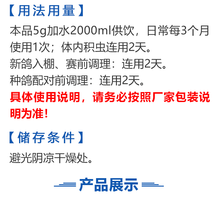 2026线上春展▪满200-10  -  指定商品:【爆灯】蓝精零 5克×10包 ;【爆灯】鸽滴威 5克×10包 ;【爆灯】莎门停 5克×10包 ;【爆灯】崇威灵 5克×10包 体内虫;【爆灯】益南混甘 5克×10包 ;【爆灯】回利球 5克×10包 ;【心连心】滴莎 10克×6袋;【爆灯】乎滴亢 5克×10包 ;【爆灯】超浓缩喜乐菌 500毫升 ;【心连心】球莎 10克×6袋 ;【爆灯】维诺护肝精 250毫升 ;【爆灯】虱螨体虫清 500毫升 ;【心连心】呼畅 10克×6袋 ;【爆灯】球可定 100毫升 ;【爆灯】复合预混合饲料Ⅱ维益菌 227克 ;【心连心】瘟痢停 10克×6袋 ;【爆灯】肠道宝 500克 ;【心连心】莎J净 10克×6袋 ;【心连心】鸽C净 10克×6袋 ;【顶峰】复合菌(胶囊)100粒 ;【顶峰】复合菌(粉剂) 280克 ;【顶峰】能量钙(浓缩型) 400毫升 ;【爱丽丝】喉痢清(加强型) 60粒(胶囊) ;【顶峰】能量钙(浓缩型) 2.5升 ;【爱丽丝】衣元净 60粒(胶囊);【施德福】特号六合一混合剂 5克×10包 ;【爱丽丝】毛滴虫净 60粒(胶囊);【爱丽丝】刹杆净(原沙门氏菌大肠杆菌杀星) 60粒(胶囊);【施德福】口服苗A 5克×10包 ;【爱丽丝】肝精 5克×10袋 ;【施德福】卡尼丁肝肾液 250毫升 ;【施德福】精华液 250毫升 ;【爱丽丝】呼吸道特号 60粒 (胶囊) ;【施德福】口服苗液 25毫升 ;【天津版稳拿】稳拿一号(呼吸道) 2公克×8袋 呼吸道;【天津版稳拿】稳拿二号(消化肠道) 3公克×8袋 肠道;【天津版稳拿】稳拿七号(毛滴虫) 2公克×8袋 毛滴虫;【上海龙园】魔宝 1000克 袋装;【上海龙园】维他肝精 250毫升 ;【上海龙园】鸽绿茶 100克 ;【上海龙园】浴宝 200克 ;【上海龙园】小育雏宝胶囊 100粒 ;【上海龙园】菌乐多 500毫升;【先锋】呼喉霸 5克×10包;【先锋】依原净 5克×10包 ;【西安凯鸽】客线枉 30毫升;【西安凯鸽】至樽独霸 100克;【西安凯鸽】至樽独霸 60粒(胶囊);【爆灯】T5鸽疫快克 20毫升 ;【西安凯鸽】果蔬营养丸 700克;【西安凯鸽】果蔬营养丸 2000克;【天津版稳拿】稳拿三号 2克×8包 球虫;【天津版稳拿】幼鸽夺霸 100粒 ;【天津版稳拿】幼鸽夺霸 300粒 ;【天津版稳拿】比赛夺霸3号 100粒 ;【天津版稳拿】比赛夺霸3号 300粒 ;【心连心】毛莎胶囊 60粒 ;【心连心】球锋胶囊 60粒 ;【天津版稳拿】虫清 3克×8包 体内虫;【心连心】呼畅 60粒(胶囊) ;【天津版稳拿】喉清 3克×8包 支原体/衣原体/念珠菌/呼吸道;【心连心】瘟痢停 60粒(胶囊) ;【天津版稳拿】粮霉清 200克 ;【心连心】莎J净胶囊 60粒 ;【爆灯】一滴灵 10毫升 单眼伤风;【爆灯】呼鼻灵 10毫升 ;【心连心】鸽C净 60粒(胶囊) ;【爆灯】维诺速补 100粒 ;【爆灯】老鸟回春丸 100粒 ;【心连心】毛呼二合一 10克×6袋;【爆灯】老鸟生子丸 100粒;【爆灯】依圆青 5克×10袋 ;【心连心】百消砃 100丸 ;【爆灯】泰力福 5克×10袋 呼吸道;【心连心】百消潵 150克 ;【爆灯】卫康防火墙 500毫升 ;【爆灯】矿力高峰液 250毫升;【心连心】独利双清 250毫升 ;【心连心】二合一啤酒酵母粉 600克 ;【爆灯】钙力奇 250毫升;【心连心】益酶多维电解质 150克 ;【爆灯】本草亢独饮 250毫升 ;【心连心】强化肝精(粉剂) 10克×10袋 ;【先锋】呼爽先锋 5克×10包 ;【心连心】强化肝精浓缩液 120毫升 ;【先锋】呼毛二合一 5克×10包 ;李猛推荐【爆灯】鸽疫康 500毫升 ;【先锋】先锋三合一 5克×10包 球虫/毛滴虫/沙门氏;【心连心】生物多肽矿物磷钙粉 500克 ;【先锋】净滴先锋 5克×10包;【心连心】AM活菌浓缩液 500毫升 ;【先锋】不脱翼 5毫升;李猛推荐【爆灯】维诺保 100毫升 ;【心连心】多效营养精华素 1680克 ;【心连心】AD3磷钙液 250毫升 ;【爆灯】超能素5000 1500克袋装 ;【心连心】瘟痢停丸 60丸 ;【爆灯】复合预混合饲料/6合1能量营养素 250克 ;【心连心】优益活菌液 1000毫升 ;【爱丽丝】喉痢清 5克×10袋 ;【上海龙园】种鸽宝 300粒 ;【上海龙园】种鸽粉 200克 ;【爱丽丝】衣原净2代 5克×10袋 ;【上海龙园】一喷灵 25毫升 ;【爱丽丝】毛滴净 5克×10袋 ;【上海龙园】绿色精 500毫升;【爱丽丝】刹杆净(原沙门氏菌大肠杆菌杀星) 5克×10袋 ;【上海龙园】营养蒜油 200毫升;【爱丽丝】呼吸道特号 5克×10袋 ;【上海龙园】康飞力 200毫升;【顶峰】保比液 100毫升 ;【上海龙园】赛神滴眼液 10毫升 ;【爱丽丝】毛球二合一 5克×10袋 ;【上海龙园】一滴灵 10毫升 单眼伤风;【爱丽丝】毛滴虫球虫二合一 60粒 ;【上海龙园】泻必停 5克×10袋 ;【顶峰】牛至香酚保比液 500毫升 ;【上海龙园】喉必清 5克×10袋;【顶峰】商寒停 100片 伤寒停;【顶峰】能量钙 300克 ;【上海龙园】抗球粉 5克×10包;【爱丽丝】稳肠赢 100克 ;【顶峰】全能电解质 500毫升 ;【上海龙园】抗滴粉 5克×10包 ;【顶峰】维他酵母粉 800克 ;【上海龙园】电解质维生素C粉 (甲7.5克+乙12.5克)×10组盒;【上海龙园】小育雏宝片剂 100片;【上海龙园】大育雏宝胶囊 500粒;【上海龙园】嗉囊清 100毫升;【上海龙园】大育雏宝片剂 500片;【上海龙园】粒粒成 100粒;【上海龙园】克虫宝 80粒;【上海龙园】红茶 100克;【上海龙园】强健宝 750克;【凡赛尔】欧乐强 鸽浴粉 1000克 天然沐浴圣品/消除肌肉疲劳/洗澡/洗浴;【爱丽丝】钙磷营养速补 400片;【北斗】雌宝 100粒;【北斗】雄宝 100粒 ;【北斗】克立停 100粒;【北斗】育雏宝 300粒;【天津版稳拿】稳拿五号 3克×8包 单眼伤风;【爆灯】多关秘密武器 30毫升 ;【爆灯】维诺