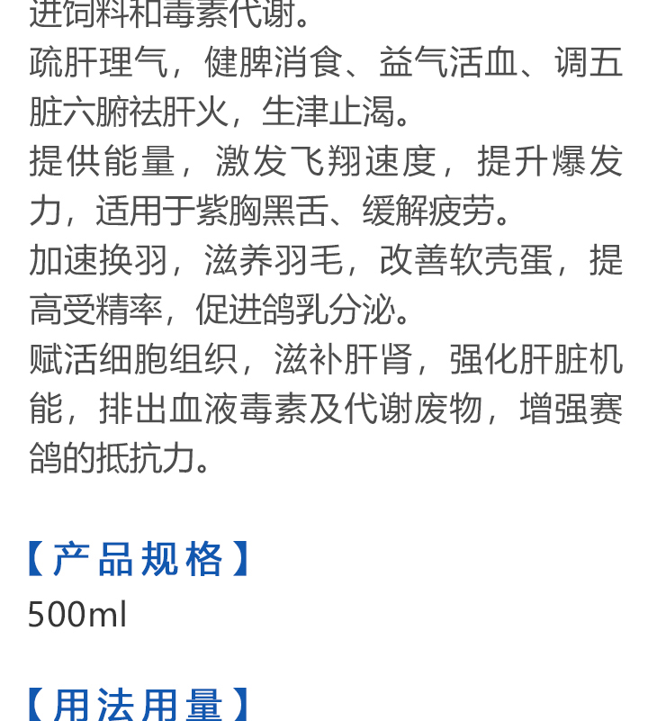 2026线上春展▪满600-40  -  指定商品:【爆灯】蓝精零 5克×10包 ;【爆灯】鸽滴威 5克×10包 ;【爆灯】莎门停 5克×10包 ;【爆灯】崇威灵 5克×10包 体内虫;【爆灯】益南混甘 5克×10包 ;【爆灯】回利球 5克×10包 ;【心连心】滴莎 10克×6袋;【爆灯】乎滴亢 5克×10包 ;【爆灯】超浓缩喜乐菌 500毫升 ;【心连心】球莎 10克×6袋 ;【爆灯】维诺护肝精 250毫升 ;【爆灯】虱螨体虫清 500毫升 ;【心连心】呼畅 10克×6袋 ;【爆灯】球可定 100毫升 ;【爆灯】复合预混合饲料Ⅱ维益菌 227克 ;【心连心】瘟痢停 10克×6袋 ;【爆灯】肠道宝 500克 ;【心连心】莎J净 10克×6袋 ;【心连心】鸽C净 10克×6袋 ;【顶峰】复合菌(胶囊)100粒 ;【顶峰】复合菌(粉剂) 280克 ;【顶峰】能量钙(浓缩型) 400毫升 ;【爱丽丝】喉痢清(加强型) 60粒(胶囊) ;【顶峰】能量钙(浓缩型) 2.5升 ;【爱丽丝】衣元净 60粒(胶囊);【施德福】特号六合一混合剂 5克×10包 ;【爱丽丝】毛滴虫净 60粒(胶囊);【爱丽丝】刹杆净(原沙门氏菌大肠杆菌杀星) 60粒(胶囊);【施德福】口服苗A 5克×10包 ;【爱丽丝】肝精 5克×10袋 ;【施德福】卡尼丁肝肾液 250毫升 ;【施德福】精华液 250毫升 ;【爱丽丝】呼吸道特号 60粒 (胶囊) ;【施德福】口服苗液 25毫升 ;【天津版稳拿】稳拿一号(呼吸道) 2公克×8袋 呼吸道;【天津版稳拿】稳拿二号(消化肠道) 3公克×8袋 肠道;【天津版稳拿】稳拿七号(毛滴虫) 2公克×8袋 毛滴虫;【上海龙园】魔宝 1000克 袋装;【上海龙园】维他肝精 250毫升 ;【上海龙园】鸽绿茶 100克 ;【上海龙园】浴宝 200克 ;【上海龙园】小育雏宝胶囊 100粒 ;【上海龙园】菌乐多 500毫升;【先锋】呼喉霸 5克×10包;【先锋】依原净 5克×10包 ;【西安凯鸽】客线枉 30毫升;【西安凯鸽】至樽独霸 100克;【西安凯鸽】至樽独霸 60粒(胶囊);【爆灯】T5鸽疫快克 20毫升 ;【西安凯鸽】果蔬营养丸 700克;【西安凯鸽】果蔬营养丸 2000克;【天津版稳拿】稳拿三号 2克×8包 球虫;【天津版稳拿】幼鸽夺霸 100粒 ;【天津版稳拿】幼鸽夺霸 300粒 ;【天津版稳拿】比赛夺霸3号 100粒 ;【天津版稳拿】比赛夺霸3号 300粒 ;【心连心】毛莎胶囊 60粒 ;【心连心】球锋胶囊 60粒 ;【天津版稳拿】虫清 3克×8包 体内虫;【心连心】呼畅 60粒(胶囊) ;【天津版稳拿】喉清 3克×8包 支原体/衣原体/念珠菌/呼吸道;【心连心】瘟痢停 60粒(胶囊) ;【天津版稳拿】粮霉清 200克 ;【心连心】莎J净胶囊 60粒 ;【爆灯】一滴灵 10毫升 单眼伤风;【爆灯】呼鼻灵 10毫升 ;【心连心】鸽C净 60粒(胶囊) ;【爆灯】维诺速补 100粒 ;【爆灯】老鸟回春丸 100粒 ;【心连心】毛呼二合一 10克×6袋;【爆灯】老鸟生子丸 100粒;【爆灯】依圆青 5克×10袋 ;【心连心】百消砃 100丸 ;【爆灯】泰力福 5克×10袋 呼吸道;【心连心】百消潵 150克 ;【爆灯】卫康防火墙 500毫升 ;【爆灯】矿力高峰液 250毫升;【心连心】独利双清 250毫升 ;【心连心】二合一啤酒酵母粉 600克 ;【爆灯】钙力奇 250毫升;【心连心】益酶多维电解质 150克 ;【爆灯】本草亢独饮 250毫升 ;【心连心】强化肝精(粉剂) 10克×10袋 ;【先锋】呼爽先锋 5克×10包 ;【心连心】强化肝精浓缩液 120毫升 ;【先锋】呼毛二合一 5克×10包 ;李猛推荐【爆灯】鸽疫康 500毫升 ;【先锋】先锋三合一 5克×10包 球虫/毛滴虫/沙门氏;【心连心】生物多肽矿物磷钙粉 500克 ;【先锋】净滴先锋 5克×10包;【心连心】AM活菌浓缩液 500毫升 ;【先锋】不脱翼 5毫升;李猛推荐【爆灯】维诺保 100毫升 ;【心连心】多效营养精华素 1680克 ;【心连心】AD3磷钙液 250毫升 ;【爆灯】超能素5000 1500克袋装 ;【心连心】瘟痢停丸 60丸 ;【爆灯】复合预混合饲料/6合1能量营养素 250克 ;【心连心】优益活菌液 1000毫升 ;【爱丽丝】喉痢清 5克×10袋 ;【上海龙园】种鸽宝 300粒 ;【上海龙园】种鸽粉 200克 ;【爱丽丝】衣原净2代 5克×10袋 ;【上海龙园】一喷灵 25毫升 ;【爱丽丝】毛滴净 5克×10袋 ;【上海龙园】绿色精 500毫升;【爱丽丝】刹杆净(原沙门氏菌大肠杆菌杀星) 5克×10袋 ;【上海龙园】营养蒜油 200毫升;【爱丽丝】呼吸道特号 5克×10袋 ;【上海龙园】康飞力 200毫升;【顶峰】保比液 100毫升 ;【上海龙园】赛神滴眼液 10毫升 ;【爱丽丝】毛球二合一 5克×10袋 ;【上海龙园】一滴灵 10毫升 单眼伤风;【爱丽丝】毛滴虫球虫二合一 60粒 ;【上海龙园】泻必停 5克×10袋 ;【顶峰】牛至香酚保比液 500毫升 ;【上海龙园】喉必清 5克×10袋;【顶峰】商寒停 100片 伤寒停;【顶峰】能量钙 300克 ;【上海龙园】抗球粉 5克×10包;【爱丽丝】稳肠赢 100克 ;【顶峰】全能电解质 500毫升 ;【上海龙园】抗滴粉 5克×10包 ;【顶峰】维他酵母粉 800克 ;【上海龙园】电解质维生素C粉 (甲7.5克+乙12.5克)×10组盒;【上海龙园】小育雏宝片剂 100片;【上海龙园】大育雏宝胶囊 500粒;【上海龙园】嗉囊清 100毫升;【上海龙园】大育雏宝片剂 500片;【上海龙园】粒粒成 100粒;【上海龙园】克虫宝 80粒;【上海龙园】红茶 100克;【上海龙园】强健宝 750克;【凡赛尔】欧乐强 鸽浴粉 1000克 天然沐浴圣品/消除肌肉疲劳/洗澡/洗浴;【爱丽丝】钙磷营养速补 400片;【北斗】雌宝 100粒;【北斗】雄宝 100粒 ;【北斗】克立停 100粒;【北斗】育雏宝 300粒;【天津版稳拿】稳拿五号 3克×8包 单眼伤风;【爆灯】多关秘密武器 30毫升 ;【爆灯】维诺