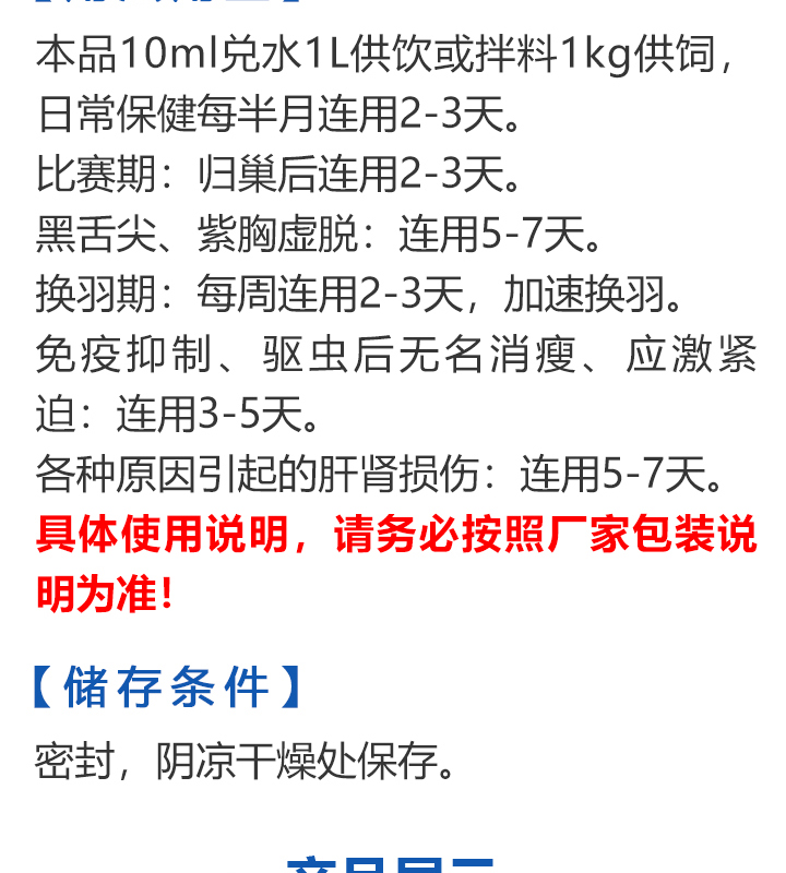 2026线上春展▪满200-10  -  指定商品:【爆灯】蓝精零 5克×10包 ;【爆灯】鸽滴威 5克×10包 ;【爆灯】莎门停 5克×10包 ;【爆灯】崇威灵 5克×10包 体内虫;【爆灯】益南混甘 5克×10包 ;【爆灯】回利球 5克×10包 ;【心连心】滴莎 10克×6袋;【爆灯】乎滴亢 5克×10包 ;【爆灯】超浓缩喜乐菌 500毫升 ;【心连心】球莎 10克×6袋 ;【爆灯】维诺护肝精 250毫升 ;【爆灯】虱螨体虫清 500毫升 ;【心连心】呼畅 10克×6袋 ;【爆灯】球可定 100毫升 ;【爆灯】复合预混合饲料Ⅱ维益菌 227克 ;【心连心】瘟痢停 10克×6袋 ;【爆灯】肠道宝 500克 ;【心连心】莎J净 10克×6袋 ;【心连心】鸽C净 10克×6袋 ;【顶峰】复合菌(胶囊)100粒 ;【顶峰】复合菌(粉剂) 280克 ;【顶峰】能量钙(浓缩型) 400毫升 ;【爱丽丝】喉痢清(加强型) 60粒(胶囊) ;【顶峰】能量钙(浓缩型) 2.5升 ;【爱丽丝】衣元净 60粒(胶囊);【施德福】特号六合一混合剂 5克×10包 ;【爱丽丝】毛滴虫净 60粒(胶囊);【爱丽丝】刹杆净(原沙门氏菌大肠杆菌杀星) 60粒(胶囊);【施德福】口服苗A 5克×10包 ;【爱丽丝】肝精 5克×10袋 ;【施德福】卡尼丁肝肾液 250毫升 ;【施德福】精华液 250毫升 ;【爱丽丝】呼吸道特号 60粒 (胶囊) ;【施德福】口服苗液 25毫升 ;【天津版稳拿】稳拿一号(呼吸道) 2公克×8袋 呼吸道;【天津版稳拿】稳拿二号(消化肠道) 3公克×8袋 肠道;【天津版稳拿】稳拿七号(毛滴虫) 2公克×8袋 毛滴虫;【上海龙园】魔宝 1000克 袋装;【上海龙园】维他肝精 250毫升 ;【上海龙园】鸽绿茶 100克 ;【上海龙园】浴宝 200克 ;【上海龙园】小育雏宝胶囊 100粒 ;【上海龙园】菌乐多 500毫升;【先锋】呼喉霸 5克×10包;【先锋】依原净 5克×10包 ;【西安凯鸽】客线枉 30毫升;【西安凯鸽】至樽独霸 100克;【西安凯鸽】至樽独霸 60粒(胶囊);【爆灯】T5鸽疫快克 20毫升 ;【西安凯鸽】果蔬营养丸 700克;【西安凯鸽】果蔬营养丸 2000克;【天津版稳拿】稳拿三号 2克×8包 球虫;【天津版稳拿】幼鸽夺霸 100粒 ;【天津版稳拿】幼鸽夺霸 300粒 ;【天津版稳拿】比赛夺霸3号 100粒 ;【天津版稳拿】比赛夺霸3号 300粒 ;【心连心】毛莎胶囊 60粒 ;【心连心】球锋胶囊 60粒 ;【天津版稳拿】虫清 3克×8包 体内虫;【心连心】呼畅 60粒(胶囊) ;【天津版稳拿】喉清 3克×8包 支原体/衣原体/念珠菌/呼吸道;【心连心】瘟痢停 60粒(胶囊) ;【天津版稳拿】粮霉清 200克 ;【心连心】莎J净胶囊 60粒 ;【爆灯】一滴灵 10毫升 单眼伤风;【爆灯】呼鼻灵 10毫升 ;【心连心】鸽C净 60粒(胶囊) ;【爆灯】维诺速补 100粒 ;【爆灯】老鸟回春丸 100粒 ;【心连心】毛呼二合一 10克×6袋;【爆灯】老鸟生子丸 100粒;【爆灯】依圆青 5克×10袋 ;【心连心】百消砃 100丸 ;【爆灯】泰力福 5克×10袋 呼吸道;【心连心】百消潵 150克 ;【爆灯】卫康防火墙 500毫升 ;【爆灯】矿力高峰液 250毫升;【心连心】独利双清 250毫升 ;【心连心】二合一啤酒酵母粉 600克 ;【爆灯】钙力奇 250毫升;【心连心】益酶多维电解质 150克 ;【爆灯】本草亢独饮 250毫升 ;【心连心】强化肝精(粉剂) 10克×10袋 ;【先锋】呼爽先锋 5克×10包 ;【心连心】强化肝精浓缩液 120毫升 ;【先锋】呼毛二合一 5克×10包 ;李猛推荐【爆灯】鸽疫康 500毫升 ;【先锋】先锋三合一 5克×10包 球虫/毛滴虫/沙门氏;【心连心】生物多肽矿物磷钙粉 500克 ;【先锋】净滴先锋 5克×10包;【心连心】AM活菌浓缩液 500毫升 ;【先锋】不脱翼 5毫升;李猛推荐【爆灯】维诺保 100毫升 ;【心连心】多效营养精华素 1680克 ;【心连心】AD3磷钙液 250毫升 ;【爆灯】超能素5000 1500克袋装 ;【心连心】瘟痢停丸 60丸 ;【爆灯】复合预混合饲料/6合1能量营养素 250克 ;【心连心】优益活菌液 1000毫升 ;【爱丽丝】喉痢清 5克×10袋 ;【上海龙园】种鸽宝 300粒 ;【上海龙园】种鸽粉 200克 ;【爱丽丝】衣原净2代 5克×10袋 ;【上海龙园】一喷灵 25毫升 ;【爱丽丝】毛滴净 5克×10袋 ;【上海龙园】绿色精 500毫升;【爱丽丝】刹杆净(原沙门氏菌大肠杆菌杀星) 5克×10袋 ;【上海龙园】营养蒜油 200毫升;【爱丽丝】呼吸道特号 5克×10袋 ;【上海龙园】康飞力 200毫升;【顶峰】保比液 100毫升 ;【上海龙园】赛神滴眼液 10毫升 ;【爱丽丝】毛球二合一 5克×10袋 ;【上海龙园】一滴灵 10毫升 单眼伤风;【爱丽丝】毛滴虫球虫二合一 60粒 ;【上海龙园】泻必停 5克×10袋 ;【顶峰】牛至香酚保比液 500毫升 ;【上海龙园】喉必清 5克×10袋;【顶峰】商寒停 100片 伤寒停;【顶峰】能量钙 300克 ;【上海龙园】抗球粉 5克×10包;【爱丽丝】稳肠赢 100克 ;【顶峰】全能电解质 500毫升 ;【上海龙园】抗滴粉 5克×10包 ;【顶峰】维他酵母粉 800克 ;【上海龙园】电解质维生素C粉 (甲7.5克+乙12.5克)×10组盒;【上海龙园】小育雏宝片剂 100片;【上海龙园】大育雏宝胶囊 500粒;【上海龙园】嗉囊清 100毫升;【上海龙园】大育雏宝片剂 500片;【上海龙园】粒粒成 100粒;【上海龙园】克虫宝 80粒;【上海龙园】红茶 100克;【上海龙园】强健宝 750克;【凡赛尔】欧乐强 鸽浴粉 1000克 天然沐浴圣品/消除肌肉疲劳/洗澡/洗浴;【爱丽丝】钙磷营养速补 400片;【北斗】雌宝 100粒;【北斗】雄宝 100粒 ;【北斗】克立停 100粒;【北斗】育雏宝 300粒;【天津版稳拿】稳拿五号 3克×8包 单眼伤风;【爆灯】多关秘密武器 30毫升 ;【爆灯】维诺