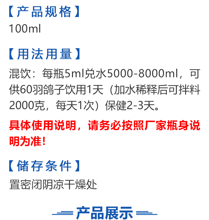 2026线上春展▪满1000-100  -  指定商品:【爆灯】蓝精零 5克×10包 ;【爆灯】鸽滴威 5克×10包 ;【爆灯】莎门停 5克×10包 ;【爆灯】崇威灵 5克×10包 体内虫;【爆灯】益南混甘 5克×10包 ;【爆灯】回利球 5克×10包 ;【心连心】滴莎 10克×6袋;【爆灯】乎滴亢 5克×10包 ;【爆灯】超浓缩喜乐菌 500毫升 ;【心连心】球莎 10克×6袋 ;【爆灯】维诺护肝精 250毫升 ;【爆灯】虱螨体虫清 500毫升 ;【心连心】呼畅 10克×6袋 ;【爆灯】球可定 100毫升 ;【爆灯】复合预混合饲料Ⅱ维益菌 227克 ;【心连心】瘟痢停 10克×6袋 ;【爆灯】肠道宝 500克 ;【心连心】莎J净 10克×6袋 ;【心连心】鸽C净 10克×6袋 ;【顶峰】复合菌(胶囊)100粒 ;【顶峰】复合菌(粉剂) 280克 ;【顶峰】能量钙(浓缩型) 400毫升 ;【爱丽丝】喉痢清(加强型) 60粒(胶囊) ;【顶峰】能量钙(浓缩型) 2.5升 ;【爱丽丝】衣元净 60粒(胶囊);【施德福】特号六合一混合剂 5克×10包 ;【爱丽丝】毛滴虫净 60粒(胶囊);【爱丽丝】刹杆净(原沙门氏菌大肠杆菌杀星) 60粒(胶囊);【施德福】口服苗A 5克×10包 ;【爱丽丝】肝精 5克×10袋 ;【施德福】卡尼丁肝肾液 250毫升 ;【施德福】精华液 250毫升 ;【爱丽丝】呼吸道特号 60粒 (胶囊) ;【施德福】口服苗液 25毫升 ;【天津版稳拿】稳拿一号(呼吸道) 2公克×8袋 呼吸道;【天津版稳拿】稳拿二号(消化肠道) 3公克×8袋 肠道;【天津版稳拿】稳拿七号(毛滴虫) 2公克×8袋 毛滴虫;【上海龙园】魔宝 1000克 袋装;【上海龙园】维他肝精 250毫升 ;【上海龙园】鸽绿茶 100克 ;【上海龙园】浴宝 200克 ;【上海龙园】小育雏宝胶囊 100粒 ;【上海龙园】菌乐多 500毫升;【先锋】呼喉霸 5克×10包;【先锋】依原净 5克×10包 ;【西安凯鸽】客线枉 30毫升;【西安凯鸽】至樽独霸 100克;【西安凯鸽】至樽独霸 60粒(胶囊);【爆灯】T5鸽疫快克 20毫升 ;【西安凯鸽】果蔬营养丸 700克;【西安凯鸽】果蔬营养丸 2000克;【天津版稳拿】稳拿三号 2克×8包 球虫;【天津版稳拿】幼鸽夺霸 100粒 ;【天津版稳拿】幼鸽夺霸 300粒 ;【天津版稳拿】比赛夺霸3号 100粒 ;【天津版稳拿】比赛夺霸3号 300粒 ;【心连心】毛莎胶囊 60粒 ;【心连心】球锋胶囊 60粒 ;【天津版稳拿】虫清 3克×8包 体内虫;【心连心】呼畅 60粒(胶囊) ;【天津版稳拿】喉清 3克×8包 支原体/衣原体/念珠菌/呼吸道;【心连心】瘟痢停 60粒(胶囊) ;【天津版稳拿】粮霉清 200克 ;【心连心】莎J净胶囊 60粒 ;【爆灯】一滴灵 10毫升 单眼伤风;【爆灯】呼鼻灵 10毫升 ;【心连心】鸽C净 60粒(胶囊) ;【爆灯】维诺速补 100粒 ;【爆灯】老鸟回春丸 100粒 ;【心连心】毛呼二合一 10克×6袋;【爆灯】老鸟生子丸 100粒;【爆灯】依圆青 5克×10袋 ;【心连心】百消砃 100丸 ;【爆灯】泰力福 5克×10袋 呼吸道;【心连心】百消潵 150克 ;【爆灯】卫康防火墙 500毫升 ;【爆灯】矿力高峰液 250毫升;【心连心】独利双清 250毫升 ;【心连心】二合一啤酒酵母粉 600克 ;【爆灯】钙力奇 250毫升;【心连心】益酶多维电解质 150克 ;【爆灯】本草亢独饮 250毫升 ;【心连心】强化肝精(粉剂) 10克×10袋 ;【先锋】呼爽先锋 5克×10包 ;【心连心】强化肝精浓缩液 120毫升 ;【先锋】呼毛二合一 5克×10包 ;李猛推荐【爆灯】鸽疫康 500毫升 ;【先锋】先锋三合一 5克×10包 球虫/毛滴虫/沙门氏;【心连心】生物多肽矿物磷钙粉 500克 ;【先锋】净滴先锋 5克×10包;【心连心】AM活菌浓缩液 500毫升 ;【先锋】不脱翼 5毫升;李猛推荐【爆灯】维诺保 100毫升 ;【心连心】多效营养精华素 1680克 ;【心连心】AD3磷钙液 250毫升 ;【爆灯】超能素5000 1500克袋装 ;【心连心】瘟痢停丸 60丸 ;【爆灯】复合预混合饲料/6合1能量营养素 250克 ;【心连心】优益活菌液 1000毫升 ;【爱丽丝】喉痢清 5克×10袋 ;【上海龙园】种鸽宝 300粒 ;【上海龙园】种鸽粉 200克 ;【爱丽丝】衣原净2代 5克×10袋 ;【上海龙园】一喷灵 25毫升 ;【爱丽丝】毛滴净 5克×10袋 ;【上海龙园】绿色精 500毫升;【爱丽丝】刹杆净(原沙门氏菌大肠杆菌杀星) 5克×10袋 ;【上海龙园】营养蒜油 200毫升;【爱丽丝】呼吸道特号 5克×10袋 ;【上海龙园】康飞力 200毫升;【顶峰】保比液 100毫升 ;【上海龙园】赛神滴眼液 10毫升 ;【爱丽丝】毛球二合一 5克×10袋 ;【上海龙园】一滴灵 10毫升 单眼伤风;【爱丽丝】毛滴虫球虫二合一 60粒 ;【上海龙园】泻必停 5克×10袋 ;【顶峰】牛至香酚保比液 500毫升 ;【上海龙园】喉必清 5克×10袋;【顶峰】商寒停 100片 伤寒停;【顶峰】能量钙 300克 ;【上海龙园】抗球粉 5克×10包;【爱丽丝】稳肠赢 100克 ;【顶峰】全能电解质 500毫升 ;【上海龙园】抗滴粉 5克×10包 ;【顶峰】维他酵母粉 800克 ;【上海龙园】电解质维生素C粉 (甲7.5克+乙12.5克)×10组盒;【上海龙园】小育雏宝片剂 100片;【上海龙园】大育雏宝胶囊 500粒;【上海龙园】嗉囊清 100毫升;【上海龙园】大育雏宝片剂 500片;【上海龙园】粒粒成 100粒;【上海龙园】克虫宝 80粒;【上海龙园】红茶 100克;【上海龙园】强健宝 750克;【凡赛尔】欧乐强 鸽浴粉 1000克 天然沐浴圣品/消除肌肉疲劳/洗澡/洗浴;【爱丽丝】钙磷营养速补 400片;【北斗】雌宝 100粒;【北斗】雄宝 100粒 ;【北斗】克立停 100粒;【北斗】育雏宝 300粒;【天津版稳拿】稳拿五号 3克×8包 单眼伤风;【爆灯】多关秘密武器 30毫升 ;【爆灯】维