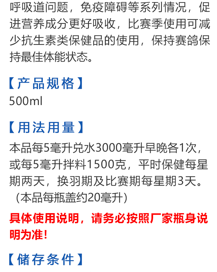 2026线上春展▪满600-40  -  指定商品:【爆灯】蓝精零 5克×10包 ;【爆灯】鸽滴威 5克×10包 ;【爆灯】莎门停 5克×10包 ;【爆灯】崇威灵 5克×10包 体内虫;【爆灯】益南混甘 5克×10包 ;【爆灯】回利球 5克×10包 ;【心连心】滴莎 10克×6袋;【爆灯】乎滴亢 5克×10包 ;【爆灯】超浓缩喜乐菌 500毫升 ;【心连心】球莎 10克×6袋 ;【爆灯】维诺护肝精 250毫升 ;【爆灯】虱螨体虫清 500毫升 ;【心连心】呼畅 10克×6袋 ;【爆灯】球可定 100毫升 ;【爆灯】复合预混合饲料Ⅱ维益菌 227克 ;【心连心】瘟痢停 10克×6袋 ;【爆灯】肠道宝 500克 ;【心连心】莎J净 10克×6袋 ;【心连心】鸽C净 10克×6袋 ;【顶峰】复合菌(胶囊)100粒 ;【顶峰】复合菌(粉剂) 280克 ;【顶峰】能量钙(浓缩型) 400毫升 ;【爱丽丝】喉痢清(加强型) 60粒(胶囊) ;【顶峰】能量钙(浓缩型) 2.5升 ;【爱丽丝】衣元净 60粒(胶囊);【施德福】特号六合一混合剂 5克×10包 ;【爱丽丝】毛滴虫净 60粒(胶囊);【爱丽丝】刹杆净(原沙门氏菌大肠杆菌杀星) 60粒(胶囊);【施德福】口服苗A 5克×10包 ;【爱丽丝】肝精 5克×10袋 ;【施德福】卡尼丁肝肾液 250毫升 ;【施德福】精华液 250毫升 ;【爱丽丝】呼吸道特号 60粒 (胶囊) ;【施德福】口服苗液 25毫升 ;【天津版稳拿】稳拿一号(呼吸道) 2公克×8袋 呼吸道;【天津版稳拿】稳拿二号(消化肠道) 3公克×8袋 肠道;【天津版稳拿】稳拿七号(毛滴虫) 2公克×8袋 毛滴虫;【上海龙园】魔宝 1000克 袋装;【上海龙园】维他肝精 250毫升 ;【上海龙园】鸽绿茶 100克 ;【上海龙园】浴宝 200克 ;【上海龙园】小育雏宝胶囊 100粒 ;【上海龙园】菌乐多 500毫升;【先锋】呼喉霸 5克×10包;【先锋】依原净 5克×10包 ;【西安凯鸽】客线枉 30毫升;【西安凯鸽】至樽独霸 100克;【西安凯鸽】至樽独霸 60粒(胶囊);【爆灯】T5鸽疫快克 20毫升 ;【西安凯鸽】果蔬营养丸 700克;【西安凯鸽】果蔬营养丸 2000克;【天津版稳拿】稳拿三号 2克×8包 球虫;【天津版稳拿】幼鸽夺霸 100粒 ;【天津版稳拿】幼鸽夺霸 300粒 ;【天津版稳拿】比赛夺霸3号 100粒 ;【天津版稳拿】比赛夺霸3号 300粒 ;【心连心】毛莎胶囊 60粒 ;【心连心】球锋胶囊 60粒 ;【天津版稳拿】虫清 3克×8包 体内虫;【心连心】呼畅 60粒(胶囊) ;【天津版稳拿】喉清 3克×8包 支原体/衣原体/念珠菌/呼吸道;【心连心】瘟痢停 60粒(胶囊) ;【天津版稳拿】粮霉清 200克 ;【心连心】莎J净胶囊 60粒 ;【爆灯】一滴灵 10毫升 单眼伤风;【爆灯】呼鼻灵 10毫升 ;【心连心】鸽C净 60粒(胶囊) ;【爆灯】维诺速补 100粒 ;【爆灯】老鸟回春丸 100粒 ;【心连心】毛呼二合一 10克×6袋;【爆灯】老鸟生子丸 100粒;【爆灯】依圆青 5克×10袋 ;【心连心】百消砃 100丸 ;【爆灯】泰力福 5克×10袋 呼吸道;【心连心】百消潵 150克 ;【爆灯】卫康防火墙 500毫升 ;【爆灯】矿力高峰液 250毫升;【心连心】独利双清 250毫升 ;【心连心】二合一啤酒酵母粉 600克 ;【爆灯】钙力奇 250毫升;【心连心】益酶多维电解质 150克 ;【爆灯】本草亢独饮 250毫升 ;【心连心】强化肝精(粉剂) 10克×10袋 ;【先锋】呼爽先锋 5克×10包 ;【心连心】强化肝精浓缩液 120毫升 ;【先锋】呼毛二合一 5克×10包 ;李猛推荐【爆灯】鸽疫康 500毫升 ;【先锋】先锋三合一 5克×10包 球虫/毛滴虫/沙门氏;【心连心】生物多肽矿物磷钙粉 500克 ;【先锋】净滴先锋 5克×10包;【心连心】AM活菌浓缩液 500毫升 ;【先锋】不脱翼 5毫升;李猛推荐【爆灯】维诺保 100毫升 ;【心连心】多效营养精华素 1680克 ;【心连心】AD3磷钙液 250毫升 ;【爆灯】超能素5000 1500克袋装 ;【心连心】瘟痢停丸 60丸 ;【爆灯】复合预混合饲料/6合1能量营养素 250克 ;【心连心】优益活菌液 1000毫升 ;【爱丽丝】喉痢清 5克×10袋 ;【上海龙园】种鸽宝 300粒 ;【上海龙园】种鸽粉 200克 ;【爱丽丝】衣原净2代 5克×10袋 ;【上海龙园】一喷灵 25毫升 ;【爱丽丝】毛滴净 5克×10袋 ;【上海龙园】绿色精 500毫升;【爱丽丝】刹杆净(原沙门氏菌大肠杆菌杀星) 5克×10袋 ;【上海龙园】营养蒜油 200毫升;【爱丽丝】呼吸道特号 5克×10袋 ;【上海龙园】康飞力 200毫升;【顶峰】保比液 100毫升 ;【上海龙园】赛神滴眼液 10毫升 ;【爱丽丝】毛球二合一 5克×10袋 ;【上海龙园】一滴灵 10毫升 单眼伤风;【爱丽丝】毛滴虫球虫二合一 60粒 ;【上海龙园】泻必停 5克×10袋 ;【顶峰】牛至香酚保比液 500毫升 ;【上海龙园】喉必清 5克×10袋;【顶峰】商寒停 100片 伤寒停;【顶峰】能量钙 300克 ;【上海龙园】抗球粉 5克×10包;【爱丽丝】稳肠赢 100克 ;【顶峰】全能电解质 500毫升 ;【上海龙园】抗滴粉 5克×10包 ;【顶峰】维他酵母粉 800克 ;【上海龙园】电解质维生素C粉 (甲7.5克+乙12.5克)×10组盒;【上海龙园】小育雏宝片剂 100片;【上海龙园】大育雏宝胶囊 500粒;【上海龙园】嗉囊清 100毫升;【上海龙园】大育雏宝片剂 500片;【上海龙园】粒粒成 100粒;【上海龙园】克虫宝 80粒;【上海龙园】红茶 100克;【上海龙园】强健宝 750克;【凡赛尔】欧乐强 鸽浴粉 1000克 天然沐浴圣品/消除肌肉疲劳/洗澡/洗浴;【爱丽丝】钙磷营养速补 400片;【北斗】雌宝 100粒;【北斗】雄宝 100粒 ;【北斗】克立停 100粒;【北斗】育雏宝 300粒;【天津版稳拿】稳拿五号 3克×8包 单眼伤风;【爆灯】多关秘密武器 30毫升 ;【爆灯】维诺