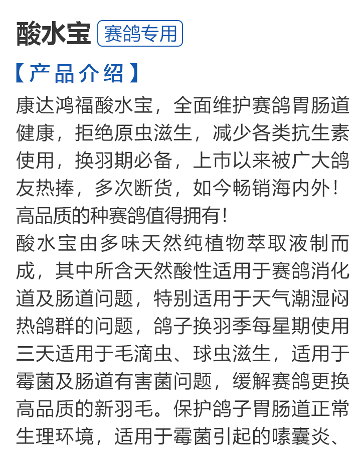 2026线上春展▪6元无门槛  -  指定商品:【爆灯】蓝精零 5克×10包 ;【爆灯】鸽滴威 5克×10包 ;【爆灯】莎门停 5克×10包 ;【爆灯】崇威灵 5克×10包 体内虫;【爆灯】益南混甘 5克×10包 ;【爆灯】回利球 5克×10包 ;【心连心】滴莎 10克×6袋;【爆灯】乎滴亢 5克×10包 ;【爆灯】超浓缩喜乐菌 500毫升 ;【心连心】球莎 10克×6袋 ;【爆灯】维诺护肝精 250毫升 ;【爆灯】虱螨体虫清 500毫升 ;【心连心】呼畅 10克×6袋 ;【爆灯】球可定 100毫升 ;【爆灯】复合预混合饲料Ⅱ维益菌 227克 ;【心连心】瘟痢停 10克×6袋 ;【爆灯】肠道宝 500克 ;【心连心】莎J净 10克×6袋 ;【心连心】鸽C净 10克×6袋 ;【顶峰】复合菌(胶囊)100粒 ;【顶峰】复合菌(粉剂) 280克 ;【顶峰】能量钙(浓缩型) 400毫升 ;【爱丽丝】喉痢清(加强型) 60粒(胶囊) ;【顶峰】能量钙(浓缩型) 2.5升 ;【爱丽丝】衣元净 60粒(胶囊);【施德福】特号六合一混合剂 5克×10包 ;【爱丽丝】毛滴虫净 60粒(胶囊);【爱丽丝】刹杆净(原沙门氏菌大肠杆菌杀星) 60粒(胶囊);【施德福】口服苗A 5克×10包 ;【爱丽丝】肝精 5克×10袋 ;【施德福】卡尼丁肝肾液 250毫升 ;【施德福】精华液 250毫升 ;【爱丽丝】呼吸道特号 60粒 (胶囊) ;【施德福】口服苗液 25毫升 ;【天津版稳拿】稳拿一号(呼吸道) 2公克×8袋 呼吸道;【天津版稳拿】稳拿二号(消化肠道) 3公克×8袋 肠道;【天津版稳拿】稳拿七号(毛滴虫) 2公克×8袋 毛滴虫;【上海龙园】魔宝 1000克 袋装;【上海龙园】维他肝精 250毫升 ;【上海龙园】鸽绿茶 100克 ;【上海龙园】浴宝 200克 ;【上海龙园】小育雏宝胶囊 100粒 ;【上海龙园】菌乐多 500毫升;【先锋】呼喉霸 5克×10包;【先锋】依原净 5克×10包 ;【西安凯鸽】客线枉 30毫升;【西安凯鸽】至樽独霸 100克;【西安凯鸽】至樽独霸 60粒(胶囊);【爆灯】T5鸽疫快克 20毫升 ;【西安凯鸽】果蔬营养丸 700克;【西安凯鸽】果蔬营养丸 2000克;【天津版稳拿】稳拿三号 2克×8包 球虫;【天津版稳拿】幼鸽夺霸 100粒 ;【天津版稳拿】幼鸽夺霸 300粒 ;【天津版稳拿】比赛夺霸3号 100粒 ;【天津版稳拿】比赛夺霸3号 300粒 ;【心连心】毛莎胶囊 60粒 ;【心连心】球锋胶囊 60粒 ;【天津版稳拿】虫清 3克×8包 体内虫;【心连心】呼畅 60粒(胶囊) ;【天津版稳拿】喉清 3克×8包 支原体/衣原体/念珠菌/呼吸道;【心连心】瘟痢停 60粒(胶囊) ;【天津版稳拿】粮霉清 200克 ;【心连心】莎J净胶囊 60粒 ;【爆灯】一滴灵 10毫升 单眼伤风;【爆灯】呼鼻灵 10毫升 ;【心连心】鸽C净 60粒(胶囊) ;【爆灯】维诺速补 100粒 ;【爆灯】老鸟回春丸 100粒 ;【心连心】毛呼二合一 10克×6袋;【爆灯】老鸟生子丸 100粒;【爆灯】依圆青 5克×10袋 ;【心连心】百消砃 100丸 ;【爆灯】泰力福 5克×10袋 呼吸道;【心连心】百消潵 150克 ;【爆灯】卫康防火墙 500毫升 ;【爆灯】矿力高峰液 250毫升;【心连心】独利双清 250毫升 ;【心连心】二合一啤酒酵母粉 600克 ;【爆灯】钙力奇 250毫升;【心连心】益酶多维电解质 150克 ;【爆灯】本草亢独饮 250毫升 ;【心连心】强化肝精(粉剂) 10克×10袋 ;【先锋】呼爽先锋 5克×10包 ;【心连心】强化肝精浓缩液 120毫升 ;【先锋】呼毛二合一 5克×10包 ;李猛推荐【爆灯】鸽疫康 500毫升 ;【先锋】先锋三合一 5克×10包 球虫/毛滴虫/沙门氏;【心连心】生物多肽矿物磷钙粉 500克 ;【先锋】净滴先锋 5克×10包;【心连心】AM活菌浓缩液 500毫升 ;【先锋】不脱翼 5毫升;李猛推荐【爆灯】维诺保 100毫升 ;【心连心】多效营养精华素 1680克 ;【心连心】AD3磷钙液 250毫升 ;【爆灯】超能素5000 1500克袋装 ;【心连心】瘟痢停丸 60丸 ;【爆灯】复合预混合饲料/6合1能量营养素 250克 ;【心连心】优益活菌液 1000毫升 ;【爱丽丝】喉痢清 5克×10袋 ;【上海龙园】种鸽宝 300粒 ;【上海龙园】种鸽粉 200克 ;【爱丽丝】衣原净2代 5克×10袋 ;【上海龙园】一喷灵 25毫升 ;【爱丽丝】毛滴净 5克×10袋 ;【上海龙园】绿色精 500毫升;【爱丽丝】刹杆净(原沙门氏菌大肠杆菌杀星) 5克×10袋 ;【上海龙园】营养蒜油 200毫升;【爱丽丝】呼吸道特号 5克×10袋 ;【上海龙园】康飞力 200毫升;【顶峰】保比液 100毫升 ;【上海龙园】赛神滴眼液 10毫升 ;【爱丽丝】毛球二合一 5克×10袋 ;【上海龙园】一滴灵 10毫升 单眼伤风;【爱丽丝】毛滴虫球虫二合一 60粒 ;【上海龙园】泻必停 5克×10袋 ;【顶峰】牛至香酚保比液 500毫升 ;【上海龙园】喉必清 5克×10袋;【顶峰】商寒停 100片 伤寒停;【顶峰】能量钙 300克 ;【上海龙园】抗球粉 5克×10包;【爱丽丝】稳肠赢 100克 ;【顶峰】全能电解质 500毫升 ;【上海龙园】抗滴粉 5克×10包 ;【顶峰】维他酵母粉 800克 ;【上海龙园】电解质维生素C粉 (甲7.5克+乙12.5克)×10组盒;【上海龙园】小育雏宝片剂 100片;【上海龙园】大育雏宝胶囊 500粒;【上海龙园】嗉囊清 100毫升;【上海龙园】大育雏宝片剂 500片;【上海龙园】粒粒成 100粒;【上海龙园】克虫宝 80粒;【上海龙园】红茶 100克;【上海龙园】强健宝 750克;【凡赛尔】欧乐强 鸽浴粉 1000克 天然沐浴圣品/消除肌肉疲劳/洗澡/洗浴;【爱丽丝】钙磷营养速补 400片;【北斗】雌宝 100粒;【北斗】雄宝 100粒 ;【北斗】克立停 100粒;【北斗】育雏宝 300粒;【天津版稳拿】稳拿五号 3克×8包 单眼伤风;【爆灯】多关秘密武器 30毫升 ;【爆灯】