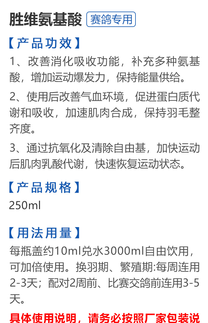 2026线上春展▪6元无门槛  -  指定商品:【爆灯】蓝精零 5克×10包 ;【爆灯】鸽滴威 5克×10包 ;【爆灯】莎门停 5克×10包 ;【爆灯】崇威灵 5克×10包 体内虫;【爆灯】益南混甘 5克×10包 ;【爆灯】回利球 5克×10包 ;【心连心】滴莎 10克×6袋;【爆灯】乎滴亢 5克×10包 ;【爆灯】超浓缩喜乐菌 500毫升 ;【心连心】球莎 10克×6袋 ;【爆灯】维诺护肝精 250毫升 ;【爆灯】虱螨体虫清 500毫升 ;【心连心】呼畅 10克×6袋 ;【爆灯】球可定 100毫升 ;【爆灯】复合预混合饲料Ⅱ维益菌 227克 ;【心连心】瘟痢停 10克×6袋 ;【爆灯】肠道宝 500克 ;【心连心】莎J净 10克×6袋 ;【心连心】鸽C净 10克×6袋 ;【顶峰】复合菌(胶囊)100粒 ;【顶峰】复合菌(粉剂) 280克 ;【顶峰】能量钙(浓缩型) 400毫升 ;【爱丽丝】喉痢清(加强型) 60粒(胶囊) ;【顶峰】能量钙(浓缩型) 2.5升 ;【爱丽丝】衣元净 60粒(胶囊);【施德福】特号六合一混合剂 5克×10包 ;【爱丽丝】毛滴虫净 60粒(胶囊);【爱丽丝】刹杆净(原沙门氏菌大肠杆菌杀星) 60粒(胶囊);【施德福】口服苗A 5克×10包 ;【爱丽丝】肝精 5克×10袋 ;【施德福】卡尼丁肝肾液 250毫升 ;【施德福】精华液 250毫升 ;【爱丽丝】呼吸道特号 60粒 (胶囊) ;【施德福】口服苗液 25毫升 ;【天津版稳拿】稳拿一号(呼吸道) 2公克×8袋 呼吸道;【天津版稳拿】稳拿二号(消化肠道) 3公克×8袋 肠道;【天津版稳拿】稳拿七号(毛滴虫) 2公克×8袋 毛滴虫;【上海龙园】魔宝 1000克 袋装;【上海龙园】维他肝精 250毫升 ;【上海龙园】鸽绿茶 100克 ;【上海龙园】浴宝 200克 ;【上海龙园】小育雏宝胶囊 100粒 ;【上海龙园】菌乐多 500毫升;【先锋】呼喉霸 5克×10包;【先锋】依原净 5克×10包 ;【西安凯鸽】客线枉 30毫升;【西安凯鸽】至樽独霸 100克;【西安凯鸽】至樽独霸 60粒(胶囊);【爆灯】T5鸽疫快克 20毫升 ;【西安凯鸽】果蔬营养丸 700克;【西安凯鸽】果蔬营养丸 2000克;【天津版稳拿】稳拿三号 2克×8包 球虫;【天津版稳拿】幼鸽夺霸 100粒 ;【天津版稳拿】幼鸽夺霸 300粒 ;【天津版稳拿】比赛夺霸3号 100粒 ;【天津版稳拿】比赛夺霸3号 300粒 ;【心连心】毛莎胶囊 60粒 ;【心连心】球锋胶囊 60粒 ;【天津版稳拿】虫清 3克×8包 体内虫;【心连心】呼畅 60粒(胶囊) ;【天津版稳拿】喉清 3克×8包 支原体/衣原体/念珠菌/呼吸道;【心连心】瘟痢停 60粒(胶囊) ;【天津版稳拿】粮霉清 200克 ;【心连心】莎J净胶囊 60粒 ;【爆灯】一滴灵 10毫升 单眼伤风;【爆灯】呼鼻灵 10毫升 ;【心连心】鸽C净 60粒(胶囊) ;【爆灯】维诺速补 100粒 ;【爆灯】老鸟回春丸 100粒 ;【心连心】毛呼二合一 10克×6袋;【爆灯】老鸟生子丸 100粒;【爆灯】依圆青 5克×10袋 ;【心连心】百消砃 100丸 ;【爆灯】泰力福 5克×10袋 呼吸道;【心连心】百消潵 150克 ;【爆灯】卫康防火墙 500毫升 ;【爆灯】矿力高峰液 250毫升;【心连心】独利双清 250毫升 ;【心连心】二合一啤酒酵母粉 600克 ;【爆灯】钙力奇 250毫升;【心连心】益酶多维电解质 150克 ;【爆灯】本草亢独饮 250毫升 ;【心连心】强化肝精(粉剂) 10克×10袋 ;【先锋】呼爽先锋 5克×10包 ;【心连心】强化肝精浓缩液 120毫升 ;【先锋】呼毛二合一 5克×10包 ;李猛推荐【爆灯】鸽疫康 500毫升 ;【先锋】先锋三合一 5克×10包 球虫/毛滴虫/沙门氏;【心连心】生物多肽矿物磷钙粉 500克 ;【先锋】净滴先锋 5克×10包;【心连心】AM活菌浓缩液 500毫升 ;【先锋】不脱翼 5毫升;李猛推荐【爆灯】维诺保 100毫升 ;【心连心】多效营养精华素 1680克 ;【心连心】AD3磷钙液 250毫升 ;【爆灯】超能素5000 1500克袋装 ;【心连心】瘟痢停丸 60丸 ;【爆灯】复合预混合饲料/6合1能量营养素 250克 ;【心连心】优益活菌液 1000毫升 ;【爱丽丝】喉痢清 5克×10袋 ;【上海龙园】种鸽宝 300粒 ;【上海龙园】种鸽粉 200克 ;【爱丽丝】衣原净2代 5克×10袋 ;【上海龙园】一喷灵 25毫升 ;【爱丽丝】毛滴净 5克×10袋 ;【上海龙园】绿色精 500毫升;【爱丽丝】刹杆净(原沙门氏菌大肠杆菌杀星) 5克×10袋 ;【上海龙园】营养蒜油 200毫升;【爱丽丝】呼吸道特号 5克×10袋 ;【上海龙园】康飞力 200毫升;【顶峰】保比液 100毫升 ;【上海龙园】赛神滴眼液 10毫升 ;【爱丽丝】毛球二合一 5克×10袋 ;【上海龙园】一滴灵 10毫升 单眼伤风;【爱丽丝】毛滴虫球虫二合一 60粒 ;【上海龙园】泻必停 5克×10袋 ;【顶峰】牛至香酚保比液 500毫升 ;【上海龙园】喉必清 5克×10袋;【顶峰】商寒停 100片 伤寒停;【顶峰】能量钙 300克 ;【上海龙园】抗球粉 5克×10包;【爱丽丝】稳肠赢 100克 ;【顶峰】全能电解质 500毫升 ;【上海龙园】抗滴粉 5克×10包 ;【顶峰】维他酵母粉 800克 ;【上海龙园】电解质维生素C粉 (甲7.5克+乙12.5克)×10组盒;【上海龙园】小育雏宝片剂 100片;【上海龙园】大育雏宝胶囊 500粒;【上海龙园】嗉囊清 100毫升;【上海龙园】大育雏宝片剂 500片;【上海龙园】粒粒成 100粒;【上海龙园】克虫宝 80粒;【上海龙园】红茶 100克;【上海龙园】强健宝 750克;【凡赛尔】欧乐强 鸽浴粉 1000克 天然沐浴圣品/消除肌肉疲劳/洗澡/洗浴;【爱丽丝】钙磷营养速补 400片;【北斗】雌宝 100粒;【北斗】雄宝 100粒 ;【北斗】克立停 100粒;【北斗】育雏宝 300粒;【天津版稳拿】稳拿五号 3克×8包 单眼伤风;【爆灯】多关秘密武器 30毫升 ;【爆灯】