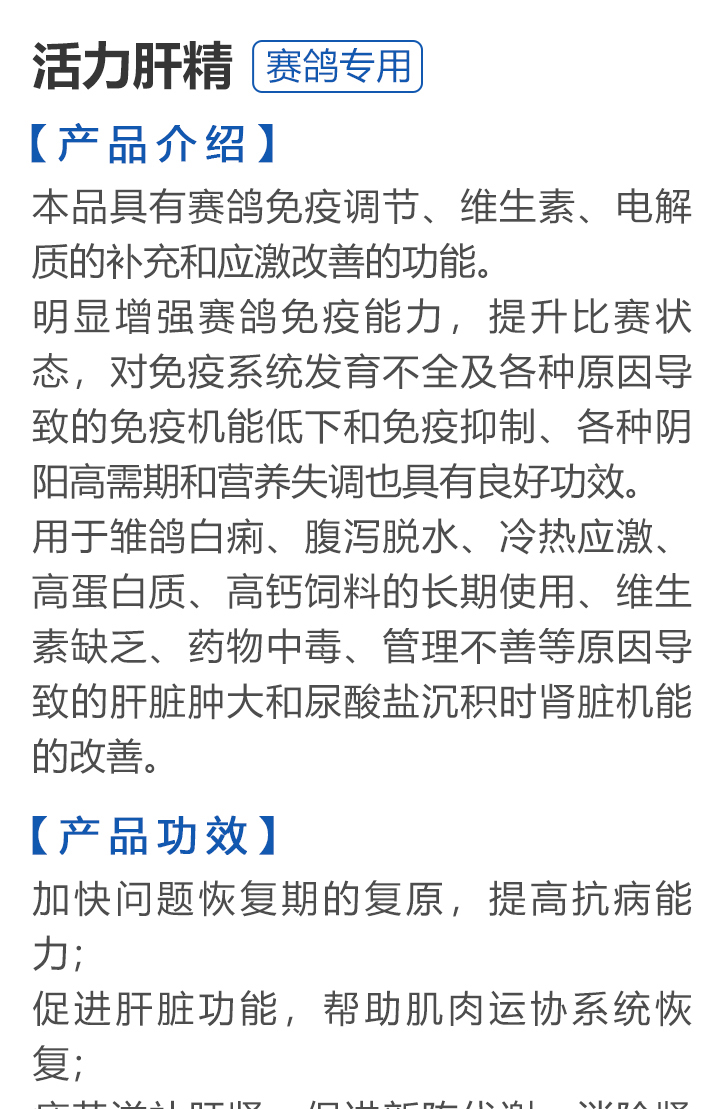 2026线上春展▪满200-10  -  指定商品:【爆灯】蓝精零 5克×10包 ;【爆灯】鸽滴威 5克×10包 ;【爆灯】莎门停 5克×10包 ;【爆灯】崇威灵 5克×10包 体内虫;【爆灯】益南混甘 5克×10包 ;【爆灯】回利球 5克×10包 ;【心连心】滴莎 10克×6袋;【爆灯】乎滴亢 5克×10包 ;【爆灯】超浓缩喜乐菌 500毫升 ;【心连心】球莎 10克×6袋 ;【爆灯】维诺护肝精 250毫升 ;【爆灯】虱螨体虫清 500毫升 ;【心连心】呼畅 10克×6袋 ;【爆灯】球可定 100毫升 ;【爆灯】复合预混合饲料Ⅱ维益菌 227克 ;【心连心】瘟痢停 10克×6袋 ;【爆灯】肠道宝 500克 ;【心连心】莎J净 10克×6袋 ;【心连心】鸽C净 10克×6袋 ;【顶峰】复合菌(胶囊)100粒 ;【顶峰】复合菌(粉剂) 280克 ;【顶峰】能量钙(浓缩型) 400毫升 ;【爱丽丝】喉痢清(加强型) 60粒(胶囊) ;【顶峰】能量钙(浓缩型) 2.5升 ;【爱丽丝】衣元净 60粒(胶囊);【施德福】特号六合一混合剂 5克×10包 ;【爱丽丝】毛滴虫净 60粒(胶囊);【爱丽丝】刹杆净(原沙门氏菌大肠杆菌杀星) 60粒(胶囊);【施德福】口服苗A 5克×10包 ;【爱丽丝】肝精 5克×10袋 ;【施德福】卡尼丁肝肾液 250毫升 ;【施德福】精华液 250毫升 ;【爱丽丝】呼吸道特号 60粒 (胶囊) ;【施德福】口服苗液 25毫升 ;【天津版稳拿】稳拿一号(呼吸道) 2公克×8袋 呼吸道;【天津版稳拿】稳拿二号(消化肠道) 3公克×8袋 肠道;【天津版稳拿】稳拿七号(毛滴虫) 2公克×8袋 毛滴虫;【上海龙园】魔宝 1000克 袋装;【上海龙园】维他肝精 250毫升 ;【上海龙园】鸽绿茶 100克 ;【上海龙园】浴宝 200克 ;【上海龙园】小育雏宝胶囊 100粒 ;【上海龙园】菌乐多 500毫升;【先锋】呼喉霸 5克×10包;【先锋】依原净 5克×10包 ;【西安凯鸽】客线枉 30毫升;【西安凯鸽】至樽独霸 100克;【西安凯鸽】至樽独霸 60粒(胶囊);【爆灯】T5鸽疫快克 20毫升 ;【西安凯鸽】果蔬营养丸 700克;【西安凯鸽】果蔬营养丸 2000克;【天津版稳拿】稳拿三号 2克×8包 球虫;【天津版稳拿】幼鸽夺霸 100粒 ;【天津版稳拿】幼鸽夺霸 300粒 ;【天津版稳拿】比赛夺霸3号 100粒 ;【天津版稳拿】比赛夺霸3号 300粒 ;【心连心】毛莎胶囊 60粒 ;【心连心】球锋胶囊 60粒 ;【天津版稳拿】虫清 3克×8包 体内虫;【心连心】呼畅 60粒(胶囊) ;【天津版稳拿】喉清 3克×8包 支原体/衣原体/念珠菌/呼吸道;【心连心】瘟痢停 60粒(胶囊) ;【天津版稳拿】粮霉清 200克 ;【心连心】莎J净胶囊 60粒 ;【爆灯】一滴灵 10毫升 单眼伤风;【爆灯】呼鼻灵 10毫升 ;【心连心】鸽C净 60粒(胶囊) ;【爆灯】维诺速补 100粒 ;【爆灯】老鸟回春丸 100粒 ;【心连心】毛呼二合一 10克×6袋;【爆灯】老鸟生子丸 100粒;【爆灯】依圆青 5克×10袋 ;【心连心】百消砃 100丸 ;【爆灯】泰力福 5克×10袋 呼吸道;【心连心】百消潵 150克 ;【爆灯】卫康防火墙 500毫升 ;【爆灯】矿力高峰液 250毫升;【心连心】独利双清 250毫升 ;【心连心】二合一啤酒酵母粉 600克 ;【爆灯】钙力奇 250毫升;【心连心】益酶多维电解质 150克 ;【爆灯】本草亢独饮 250毫升 ;【心连心】强化肝精(粉剂) 10克×10袋 ;【先锋】呼爽先锋 5克×10包 ;【心连心】强化肝精浓缩液 120毫升 ;【先锋】呼毛二合一 5克×10包 ;李猛推荐【爆灯】鸽疫康 500毫升 ;【先锋】先锋三合一 5克×10包 球虫/毛滴虫/沙门氏;【心连心】生物多肽矿物磷钙粉 500克 ;【先锋】净滴先锋 5克×10包;【心连心】AM活菌浓缩液 500毫升 ;【先锋】不脱翼 5毫升;李猛推荐【爆灯】维诺保 100毫升 ;【心连心】多效营养精华素 1680克 ;【心连心】AD3磷钙液 250毫升 ;【爆灯】超能素5000 1500克袋装 ;【心连心】瘟痢停丸 60丸 ;【爆灯】复合预混合饲料/6合1能量营养素 250克 ;【心连心】优益活菌液 1000毫升 ;【爱丽丝】喉痢清 5克×10袋 ;【上海龙园】种鸽宝 300粒 ;【上海龙园】种鸽粉 200克 ;【爱丽丝】衣原净2代 5克×10袋 ;【上海龙园】一喷灵 25毫升 ;【爱丽丝】毛滴净 5克×10袋 ;【上海龙园】绿色精 500毫升;【爱丽丝】刹杆净(原沙门氏菌大肠杆菌杀星) 5克×10袋 ;【上海龙园】营养蒜油 200毫升;【爱丽丝】呼吸道特号 5克×10袋 ;【上海龙园】康飞力 200毫升;【顶峰】保比液 100毫升 ;【上海龙园】赛神滴眼液 10毫升 ;【爱丽丝】毛球二合一 5克×10袋 ;【上海龙园】一滴灵 10毫升 单眼伤风;【爱丽丝】毛滴虫球虫二合一 60粒 ;【上海龙园】泻必停 5克×10袋 ;【顶峰】牛至香酚保比液 500毫升 ;【上海龙园】喉必清 5克×10袋;【顶峰】商寒停 100片 伤寒停;【顶峰】能量钙 300克 ;【上海龙园】抗球粉 5克×10包;【爱丽丝】稳肠赢 100克 ;【顶峰】全能电解质 500毫升 ;【上海龙园】抗滴粉 5克×10包 ;【顶峰】维他酵母粉 800克 ;【上海龙园】电解质维生素C粉 (甲7.5克+乙12.5克)×10组盒;【上海龙园】小育雏宝片剂 100片;【上海龙园】大育雏宝胶囊 500粒;【上海龙园】嗉囊清 100毫升;【上海龙园】大育雏宝片剂 500片;【上海龙园】粒粒成 100粒;【上海龙园】克虫宝 80粒;【上海龙园】红茶 100克;【上海龙园】强健宝 750克;【凡赛尔】欧乐强 鸽浴粉 1000克 天然沐浴圣品/消除肌肉疲劳/洗澡/洗浴;【爱丽丝】钙磷营养速补 400片;【北斗】雌宝 100粒;【北斗】雄宝 100粒 ;【北斗】克立停 100粒;【北斗】育雏宝 300粒;【天津版稳拿】稳拿五号 3克×8包 单眼伤风;【爆灯】多关秘密武器 30毫升 ;【爆灯】维诺
