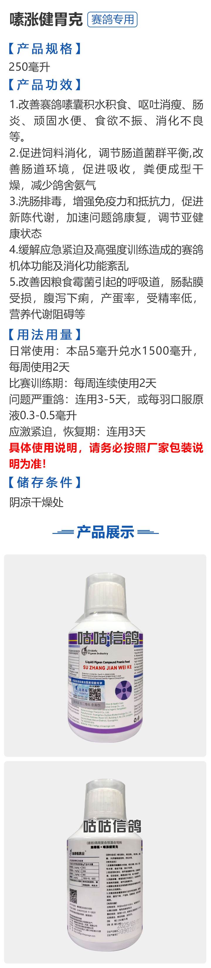 2026线上春展▪满600-40  -  指定商品:【爆灯】蓝精零 5克×10包 ;【爆灯】鸽滴威 5克×10包 ;【爆灯】莎门停 5克×10包 ;【爆灯】崇威灵 5克×10包 体内虫;【爆灯】益南混甘 5克×10包 ;【爆灯】回利球 5克×10包 ;【心连心】滴莎 10克×6袋;【爆灯】乎滴亢 5克×10包 ;【爆灯】超浓缩喜乐菌 500毫升 ;【心连心】球莎 10克×6袋 ;【爆灯】维诺护肝精 250毫升 ;【爆灯】虱螨体虫清 500毫升 ;【心连心】呼畅 10克×6袋 ;【爆灯】球可定 100毫升 ;【爆灯】复合预混合饲料Ⅱ维益菌 227克 ;【心连心】瘟痢停 10克×6袋 ;【爆灯】肠道宝 500克 ;【心连心】莎J净 10克×6袋 ;【心连心】鸽C净 10克×6袋 ;【顶峰】复合菌(胶囊)100粒 ;【顶峰】复合菌(粉剂) 280克 ;【顶峰】能量钙(浓缩型) 400毫升 ;【爱丽丝】喉痢清(加强型) 60粒(胶囊) ;【顶峰】能量钙(浓缩型) 2.5升 ;【爱丽丝】衣元净 60粒(胶囊);【施德福】特号六合一混合剂 5克×10包 ;【爱丽丝】毛滴虫净 60粒(胶囊);【爱丽丝】刹杆净(原沙门氏菌大肠杆菌杀星) 60粒(胶囊);【施德福】口服苗A 5克×10包 ;【爱丽丝】肝精 5克×10袋 ;【施德福】卡尼丁肝肾液 250毫升 ;【施德福】精华液 250毫升 ;【爱丽丝】呼吸道特号 60粒 (胶囊) ;【施德福】口服苗液 25毫升 ;【天津版稳拿】稳拿一号(呼吸道) 2公克×8袋 呼吸道;【天津版稳拿】稳拿二号(消化肠道) 3公克×8袋 肠道;【天津版稳拿】稳拿七号(毛滴虫) 2公克×8袋 毛滴虫;【上海龙园】魔宝 1000克 袋装;【上海龙园】维他肝精 250毫升 ;【上海龙园】鸽绿茶 100克 ;【上海龙园】浴宝 200克 ;【上海龙园】小育雏宝胶囊 100粒 ;【上海龙园】菌乐多 500毫升;【先锋】呼喉霸 5克×10包;【先锋】依原净 5克×10包 ;【西安凯鸽】客线枉 30毫升;【西安凯鸽】至樽独霸 100克;【西安凯鸽】至樽独霸 60粒(胶囊);【爆灯】T5鸽疫快克 20毫升 ;【西安凯鸽】果蔬营养丸 700克;【西安凯鸽】果蔬营养丸 2000克;【天津版稳拿】稳拿三号 2克×8包 球虫;【天津版稳拿】幼鸽夺霸 100粒 ;【天津版稳拿】幼鸽夺霸 300粒 ;【天津版稳拿】比赛夺霸3号 100粒 ;【天津版稳拿】比赛夺霸3号 300粒 ;【心连心】毛莎胶囊 60粒 ;【心连心】球锋胶囊 60粒 ;【天津版稳拿】虫清 3克×8包 体内虫;【心连心】呼畅 60粒(胶囊) ;【天津版稳拿】喉清 3克×8包 支原体/衣原体/念珠菌/呼吸道;【心连心】瘟痢停 60粒(胶囊) ;【天津版稳拿】粮霉清 200克 ;【心连心】莎J净胶囊 60粒 ;【爆灯】一滴灵 10毫升 单眼伤风;【爆灯】呼鼻灵 10毫升 ;【心连心】鸽C净 60粒(胶囊) ;【爆灯】维诺速补 100粒 ;【爆灯】老鸟回春丸 100粒 ;【心连心】毛呼二合一 10克×6袋;【爆灯】老鸟生子丸 100粒;【爆灯】依圆青 5克×10袋 ;【心连心】百消砃 100丸 ;【爆灯】泰力福 5克×10袋 呼吸道;【心连心】百消潵 150克 ;【爆灯】卫康防火墙 500毫升 ;【爆灯】矿力高峰液 250毫升;【心连心】独利双清 250毫升 ;【心连心】二合一啤酒酵母粉 600克 ;【爆灯】钙力奇 250毫升;【心连心】益酶多维电解质 150克 ;【爆灯】本草亢独饮 250毫升 ;【心连心】强化肝精(粉剂) 10克×10袋 ;【先锋】呼爽先锋 5克×10包 ;【心连心】强化肝精浓缩液 120毫升 ;【先锋】呼毛二合一 5克×10包 ;李猛推荐【爆灯】鸽疫康 500毫升 ;【先锋】先锋三合一 5克×10包 球虫/毛滴虫/沙门氏;【心连心】生物多肽矿物磷钙粉 500克 ;【先锋】净滴先锋 5克×10包;【心连心】AM活菌浓缩液 500毫升 ;【先锋】不脱翼 5毫升;李猛推荐【爆灯】维诺保 100毫升 ;【心连心】多效营养精华素 1680克 ;【心连心】AD3磷钙液 250毫升 ;【爆灯】超能素5000 1500克袋装 ;【心连心】瘟痢停丸 60丸 ;【爆灯】复合预混合饲料/6合1能量营养素 250克 ;【心连心】优益活菌液 1000毫升 ;【爱丽丝】喉痢清 5克×10袋 ;【上海龙园】种鸽宝 300粒 ;【上海龙园】种鸽粉 200克 ;【爱丽丝】衣原净2代 5克×10袋 ;【上海龙园】一喷灵 25毫升 ;【爱丽丝】毛滴净 5克×10袋 ;【上海龙园】绿色精 500毫升;【爱丽丝】刹杆净(原沙门氏菌大肠杆菌杀星) 5克×10袋 ;【上海龙园】营养蒜油 200毫升;【爱丽丝】呼吸道特号 5克×10袋 ;【上海龙园】康飞力 200毫升;【顶峰】保比液 100毫升 ;【上海龙园】赛神滴眼液 10毫升 ;【爱丽丝】毛球二合一 5克×10袋 ;【上海龙园】一滴灵 10毫升 单眼伤风;【爱丽丝】毛滴虫球虫二合一 60粒 ;【上海龙园】泻必停 5克×10袋 ;【顶峰】牛至香酚保比液 500毫升 ;【上海龙园】喉必清 5克×10袋;【顶峰】商寒停 100片 伤寒停;【顶峰】能量钙 300克 ;【上海龙园】抗球粉 5克×10包;【爱丽丝】稳肠赢 100克 ;【顶峰】全能电解质 500毫升 ;【上海龙园】抗滴粉 5克×10包 ;【顶峰】维他酵母粉 800克 ;【上海龙园】电解质维生素C粉 (甲7.5克+乙12.5克)×10组盒;【上海龙园】小育雏宝片剂 100片;【上海龙园】大育雏宝胶囊 500粒;【上海龙园】嗉囊清 100毫升;【上海龙园】大育雏宝片剂 500片;【上海龙园】粒粒成 100粒;【上海龙园】克虫宝 80粒;【上海龙园】红茶 100克;【上海龙园】强健宝 750克;【凡赛尔】欧乐强 鸽浴粉 1000克 天然沐浴圣品/消除肌肉疲劳/洗澡/洗浴;【爱丽丝】钙磷营养速补 400片;【北斗】雌宝 100粒;【北斗】雄宝 100粒 ;【北斗】克立停 100粒;【北斗】育雏宝 300粒;【天津版稳拿】稳拿五号 3克×8包 单眼伤风;【爆灯】多关秘密武器 30毫升 ;【爆灯】维诺