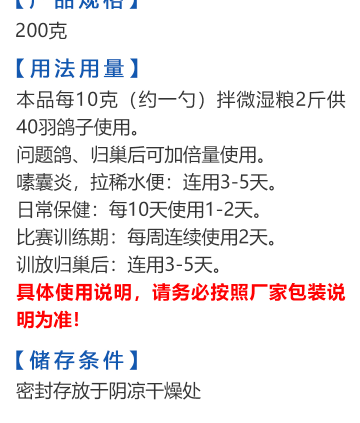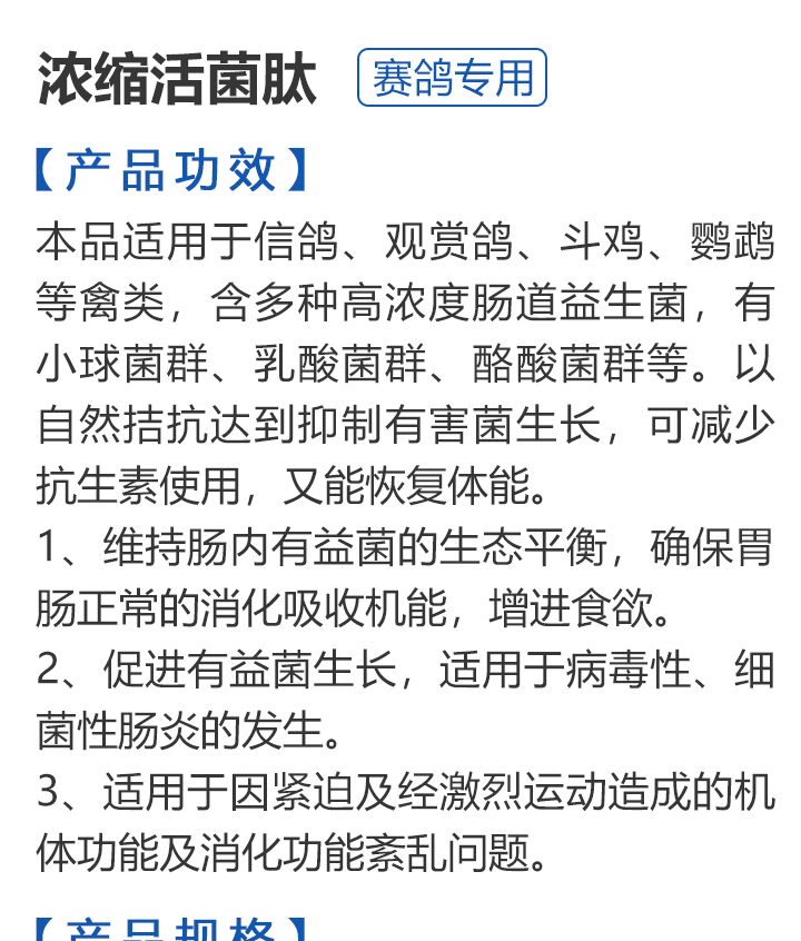 2026线上春展▪满200-10  -  指定商品:【爆灯】蓝精零 5克×10包 ;【爆灯】鸽滴威 5克×10包 ;【爆灯】莎门停 5克×10包 ;【爆灯】崇威灵 5克×10包 体内虫;【爆灯】益南混甘 5克×10包 ;【爆灯】回利球 5克×10包 ;【心连心】滴莎 10克×6袋;【爆灯】乎滴亢 5克×10包 ;【爆灯】超浓缩喜乐菌 500毫升 ;【心连心】球莎 10克×6袋 ;【爆灯】维诺护肝精 250毫升 ;【爆灯】虱螨体虫清 500毫升 ;【心连心】呼畅 10克×6袋 ;【爆灯】球可定 100毫升 ;【爆灯】复合预混合饲料Ⅱ维益菌 227克 ;【心连心】瘟痢停 10克×6袋 ;【爆灯】肠道宝 500克 ;【心连心】莎J净 10克×6袋 ;【心连心】鸽C净 10克×6袋 ;【顶峰】复合菌(胶囊)100粒 ;【顶峰】复合菌(粉剂) 280克 ;【顶峰】能量钙(浓缩型) 400毫升 ;【爱丽丝】喉痢清(加强型) 60粒(胶囊) ;【顶峰】能量钙(浓缩型) 2.5升 ;【爱丽丝】衣元净 60粒(胶囊);【施德福】特号六合一混合剂 5克×10包 ;【爱丽丝】毛滴虫净 60粒(胶囊);【爱丽丝】刹杆净(原沙门氏菌大肠杆菌杀星) 60粒(胶囊);【施德福】口服苗A 5克×10包 ;【爱丽丝】肝精 5克×10袋 ;【施德福】卡尼丁肝肾液 250毫升 ;【施德福】精华液 250毫升 ;【爱丽丝】呼吸道特号 60粒 (胶囊) ;【施德福】口服苗液 25毫升 ;【天津版稳拿】稳拿一号(呼吸道) 2公克×8袋 呼吸道;【天津版稳拿】稳拿二号(消化肠道) 3公克×8袋 肠道;【天津版稳拿】稳拿七号(毛滴虫) 2公克×8袋 毛滴虫;【上海龙园】魔宝 1000克 袋装;【上海龙园】维他肝精 250毫升 ;【上海龙园】鸽绿茶 100克 ;【上海龙园】浴宝 200克 ;【上海龙园】小育雏宝胶囊 100粒 ;【上海龙园】菌乐多 500毫升;【先锋】呼喉霸 5克×10包;【先锋】依原净 5克×10包 ;【西安凯鸽】客线枉 30毫升;【西安凯鸽】至樽独霸 100克;【西安凯鸽】至樽独霸 60粒(胶囊);【爆灯】T5鸽疫快克 20毫升 ;【西安凯鸽】果蔬营养丸 700克;【西安凯鸽】果蔬营养丸 2000克;【天津版稳拿】稳拿三号 2克×8包 球虫;【天津版稳拿】幼鸽夺霸 100粒 ;【天津版稳拿】幼鸽夺霸 300粒 ;【天津版稳拿】比赛夺霸3号 100粒 ;【天津版稳拿】比赛夺霸3号 300粒 ;【心连心】毛莎胶囊 60粒 ;【心连心】球锋胶囊 60粒 ;【天津版稳拿】虫清 3克×8包 体内虫;【心连心】呼畅 60粒(胶囊) ;【天津版稳拿】喉清 3克×8包 支原体/衣原体/念珠菌/呼吸道;【心连心】瘟痢停 60粒(胶囊) ;【天津版稳拿】粮霉清 200克 ;【心连心】莎J净胶囊 60粒 ;【爆灯】一滴灵 10毫升 单眼伤风;【爆灯】呼鼻灵 10毫升 ;【心连心】鸽C净 60粒(胶囊) ;【爆灯】维诺速补 100粒 ;【爆灯】老鸟回春丸 100粒 ;【心连心】毛呼二合一 10克×6袋;【爆灯】老鸟生子丸 100粒;【爆灯】依圆青 5克×10袋 ;【心连心】百消砃 100丸 ;【爆灯】泰力福 5克×10袋 呼吸道;【心连心】百消潵 150克 ;【爆灯】卫康防火墙 500毫升 ;【爆灯】矿力高峰液 250毫升;【心连心】独利双清 250毫升 ;【心连心】二合一啤酒酵母粉 600克 ;【爆灯】钙力奇 250毫升;【心连心】益酶多维电解质 150克 ;【爆灯】本草亢独饮 250毫升 ;【心连心】强化肝精(粉剂) 10克×10袋 ;【先锋】呼爽先锋 5克×10包 ;【心连心】强化肝精浓缩液 120毫升 ;【先锋】呼毛二合一 5克×10包 ;李猛推荐【爆灯】鸽疫康 500毫升 ;【先锋】先锋三合一 5克×10包 球虫/毛滴虫/沙门氏;【心连心】生物多肽矿物磷钙粉 500克 ;【先锋】净滴先锋 5克×10包;【心连心】AM活菌浓缩液 500毫升 ;【先锋】不脱翼 5毫升;李猛推荐【爆灯】维诺保 100毫升 ;【心连心】多效营养精华素 1680克 ;【心连心】AD3磷钙液 250毫升 ;【爆灯】超能素5000 1500克袋装 ;【心连心】瘟痢停丸 60丸 ;【爆灯】复合预混合饲料/6合1能量营养素 250克 ;【心连心】优益活菌液 1000毫升 ;【爱丽丝】喉痢清 5克×10袋 ;【上海龙园】种鸽宝 300粒 ;【上海龙园】种鸽粉 200克 ;【爱丽丝】衣原净2代 5克×10袋 ;【上海龙园】一喷灵 25毫升 ;【爱丽丝】毛滴净 5克×10袋 ;【上海龙园】绿色精 500毫升;【爱丽丝】刹杆净(原沙门氏菌大肠杆菌杀星) 5克×10袋 ;【上海龙园】营养蒜油 200毫升;【爱丽丝】呼吸道特号 5克×10袋 ;【上海龙园】康飞力 200毫升;【顶峰】保比液 100毫升 ;【上海龙园】赛神滴眼液 10毫升 ;【爱丽丝】毛球二合一 5克×10袋 ;【上海龙园】一滴灵 10毫升 单眼伤风;【爱丽丝】毛滴虫球虫二合一 60粒 ;【上海龙园】泻必停 5克×10袋 ;【顶峰】牛至香酚保比液 500毫升 ;【上海龙园】喉必清 5克×10袋;【顶峰】商寒停 100片 伤寒停;【顶峰】能量钙 300克 ;【上海龙园】抗球粉 5克×10包;【爱丽丝】稳肠赢 100克 ;【顶峰】全能电解质 500毫升 ;【上海龙园】抗滴粉 5克×10包 ;【顶峰】维他酵母粉 800克 ;【上海龙园】电解质维生素C粉 (甲7.5克+乙12.5克)×10组盒;【上海龙园】小育雏宝片剂 100片;【上海龙园】大育雏宝胶囊 500粒;【上海龙园】嗉囊清 100毫升;【上海龙园】大育雏宝片剂 500片;【上海龙园】粒粒成 100粒;【上海龙园】克虫宝 80粒;【上海龙园】红茶 100克;【上海龙园】强健宝 750克;【凡赛尔】欧乐强 鸽浴粉 1000克 天然沐浴圣品/消除肌肉疲劳/洗澡/洗浴;【爱丽丝】钙磷营养速补 400片;【北斗】雌宝 100粒;【北斗】雄宝 100粒 ;【北斗】克立停 100粒;【北斗】育雏宝 300粒;【天津版稳拿】稳拿五号 3克×8包 单眼伤风;【爆灯】多关秘密武器 30毫升 ;【爆灯】维诺