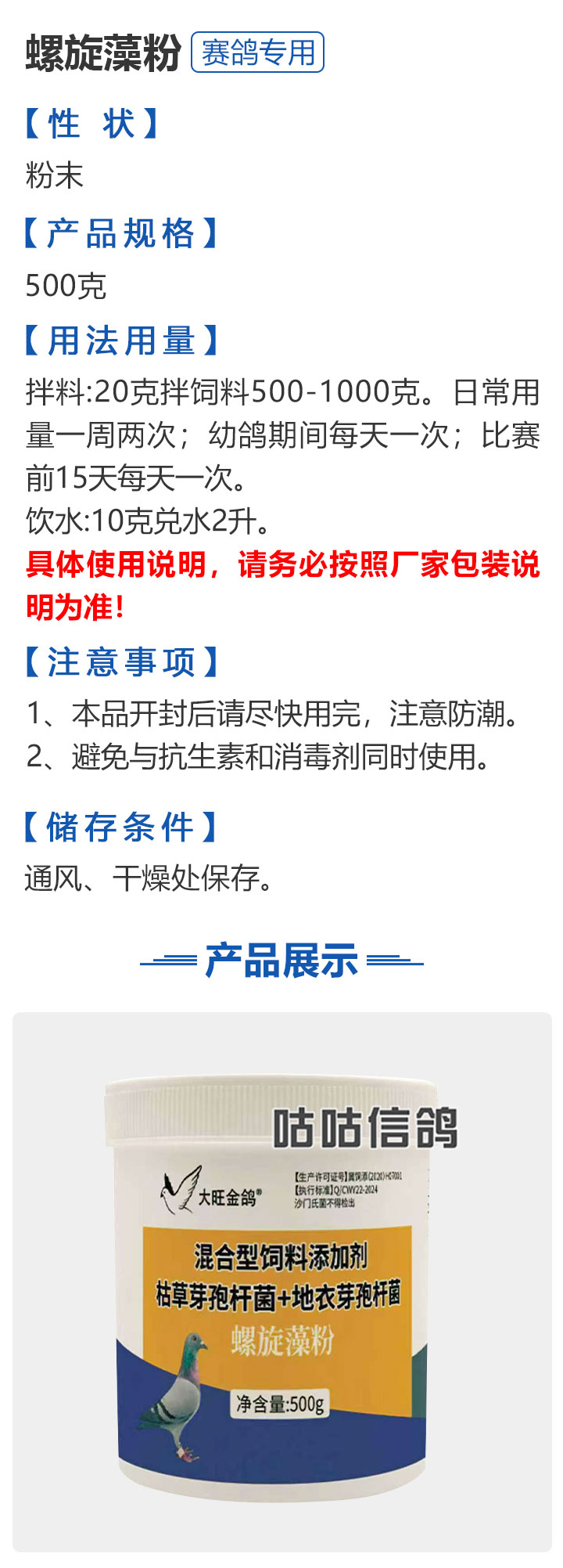 2026线上春展▪满1000-100  -  指定商品:【爆灯】蓝精零 5克×10包 ;【爆灯】鸽滴威 5克×10包 ;【爆灯】莎门停 5克×10包 ;【爆灯】崇威灵 5克×10包 体内虫;【爆灯】益南混甘 5克×10包 ;【爆灯】回利球 5克×10包 ;【心连心】滴莎 10克×6袋;【爆灯】乎滴亢 5克×10包 ;【爆灯】超浓缩喜乐菌 500毫升 ;【心连心】球莎 10克×6袋 ;【爆灯】维诺护肝精 250毫升 ;【爆灯】虱螨体虫清 500毫升 ;【心连心】呼畅 10克×6袋 ;【爆灯】球可定 100毫升 ;【爆灯】复合预混合饲料Ⅱ维益菌 227克 ;【心连心】瘟痢停 10克×6袋 ;【爆灯】肠道宝 500克 ;【心连心】莎J净 10克×6袋 ;【心连心】鸽C净 10克×6袋 ;【顶峰】复合菌(胶囊)100粒 ;【顶峰】复合菌(粉剂) 280克 ;【顶峰】能量钙(浓缩型) 400毫升 ;【爱丽丝】喉痢清(加强型) 60粒(胶囊) ;【顶峰】能量钙(浓缩型) 2.5升 ;【爱丽丝】衣元净 60粒(胶囊);【施德福】特号六合一混合剂 5克×10包 ;【爱丽丝】毛滴虫净 60粒(胶囊);【爱丽丝】刹杆净(原沙门氏菌大肠杆菌杀星) 60粒(胶囊);【施德福】口服苗A 5克×10包 ;【爱丽丝】肝精 5克×10袋 ;【施德福】卡尼丁肝肾液 250毫升 ;【施德福】精华液 250毫升 ;【爱丽丝】呼吸道特号 60粒 (胶囊) ;【施德福】口服苗液 25毫升 ;【天津版稳拿】稳拿一号(呼吸道) 2公克×8袋 呼吸道;【天津版稳拿】稳拿二号(消化肠道) 3公克×8袋 肠道;【天津版稳拿】稳拿七号(毛滴虫) 2公克×8袋 毛滴虫;【上海龙园】魔宝 1000克 袋装;【上海龙园】维他肝精 250毫升 ;【上海龙园】鸽绿茶 100克 ;【上海龙园】浴宝 200克 ;【上海龙园】小育雏宝胶囊 100粒 ;【上海龙园】菌乐多 500毫升;【先锋】呼喉霸 5克×10包;【先锋】依原净 5克×10包 ;【西安凯鸽】客线枉 30毫升;【西安凯鸽】至樽独霸 100克;【西安凯鸽】至樽独霸 60粒(胶囊);【爆灯】T5鸽疫快克 20毫升 ;【西安凯鸽】果蔬营养丸 700克;【西安凯鸽】果蔬营养丸 2000克;【天津版稳拿】稳拿三号 2克×8包 球虫;【天津版稳拿】幼鸽夺霸 100粒 ;【天津版稳拿】幼鸽夺霸 300粒 ;【天津版稳拿】比赛夺霸3号 100粒 ;【天津版稳拿】比赛夺霸3号 300粒 ;【心连心】毛莎胶囊 60粒 ;【心连心】球锋胶囊 60粒 ;【天津版稳拿】虫清 3克×8包 体内虫;【心连心】呼畅 60粒(胶囊) ;【天津版稳拿】喉清 3克×8包 支原体/衣原体/念珠菌/呼吸道;【心连心】瘟痢停 60粒(胶囊) ;【天津版稳拿】粮霉清 200克 ;【心连心】莎J净胶囊 60粒 ;【爆灯】一滴灵 10毫升 单眼伤风;【爆灯】呼鼻灵 10毫升 ;【心连心】鸽C净 60粒(胶囊) ;【爆灯】维诺速补 100粒 ;【爆灯】老鸟回春丸 100粒 ;【心连心】毛呼二合一 10克×6袋;【爆灯】老鸟生子丸 100粒;【爆灯】依圆青 5克×10袋 ;【心连心】百消砃 100丸 ;【爆灯】泰力福 5克×10袋 呼吸道;【心连心】百消潵 150克 ;【爆灯】卫康防火墙 500毫升 ;【爆灯】矿力高峰液 250毫升;【心连心】独利双清 250毫升 ;【心连心】二合一啤酒酵母粉 600克 ;【爆灯】钙力奇 250毫升;【心连心】益酶多维电解质 150克 ;【爆灯】本草亢独饮 250毫升 ;【心连心】强化肝精(粉剂) 10克×10袋 ;【先锋】呼爽先锋 5克×10包 ;【心连心】强化肝精浓缩液 120毫升 ;【先锋】呼毛二合一 5克×10包 ;李猛推荐【爆灯】鸽疫康 500毫升 ;【先锋】先锋三合一 5克×10包 球虫/毛滴虫/沙门氏;【心连心】生物多肽矿物磷钙粉 500克 ;【先锋】净滴先锋 5克×10包;【心连心】AM活菌浓缩液 500毫升 ;【先锋】不脱翼 5毫升;李猛推荐【爆灯】维诺保 100毫升 ;【心连心】多效营养精华素 1680克 ;【心连心】AD3磷钙液 250毫升 ;【爆灯】超能素5000 1500克袋装 ;【心连心】瘟痢停丸 60丸 ;【爆灯】复合预混合饲料/6合1能量营养素 250克 ;【心连心】优益活菌液 1000毫升 ;【爱丽丝】喉痢清 5克×10袋 ;【上海龙园】种鸽宝 300粒 ;【上海龙园】种鸽粉 200克 ;【爱丽丝】衣原净2代 5克×10袋 ;【上海龙园】一喷灵 25毫升 ;【爱丽丝】毛滴净 5克×10袋 ;【上海龙园】绿色精 500毫升;【爱丽丝】刹杆净(原沙门氏菌大肠杆菌杀星) 5克×10袋 ;【上海龙园】营养蒜油 200毫升;【爱丽丝】呼吸道特号 5克×10袋 ;【上海龙园】康飞力 200毫升;【顶峰】保比液 100毫升 ;【上海龙园】赛神滴眼液 10毫升 ;【爱丽丝】毛球二合一 5克×10袋 ;【上海龙园】一滴灵 10毫升 单眼伤风;【爱丽丝】毛滴虫球虫二合一 60粒 ;【上海龙园】泻必停 5克×10袋 ;【顶峰】牛至香酚保比液 500毫升 ;【上海龙园】喉必清 5克×10袋;【顶峰】商寒停 100片 伤寒停;【顶峰】能量钙 300克 ;【上海龙园】抗球粉 5克×10包;【爱丽丝】稳肠赢 100克 ;【顶峰】全能电解质 500毫升 ;【上海龙园】抗滴粉 5克×10包 ;【顶峰】维他酵母粉 800克 ;【上海龙园】电解质维生素C粉 (甲7.5克+乙12.5克)×10组盒;【上海龙园】小育雏宝片剂 100片;【上海龙园】大育雏宝胶囊 500粒;【上海龙园】嗉囊清 100毫升;【上海龙园】大育雏宝片剂 500片;【上海龙园】粒粒成 100粒;【上海龙园】克虫宝 80粒;【上海龙园】红茶 100克;【上海龙园】强健宝 750克;【凡赛尔】欧乐强 鸽浴粉 1000克 天然沐浴圣品/消除肌肉疲劳/洗澡/洗浴;【爱丽丝】钙磷营养速补 400片;【北斗】雌宝 100粒;【北斗】雄宝 100粒 ;【北斗】克立停 100粒;【北斗】育雏宝 300粒;【天津版稳拿】稳拿五号 3克×8包 单眼伤风;【爆灯】多关秘密武器 30毫升 ;【爆灯】维